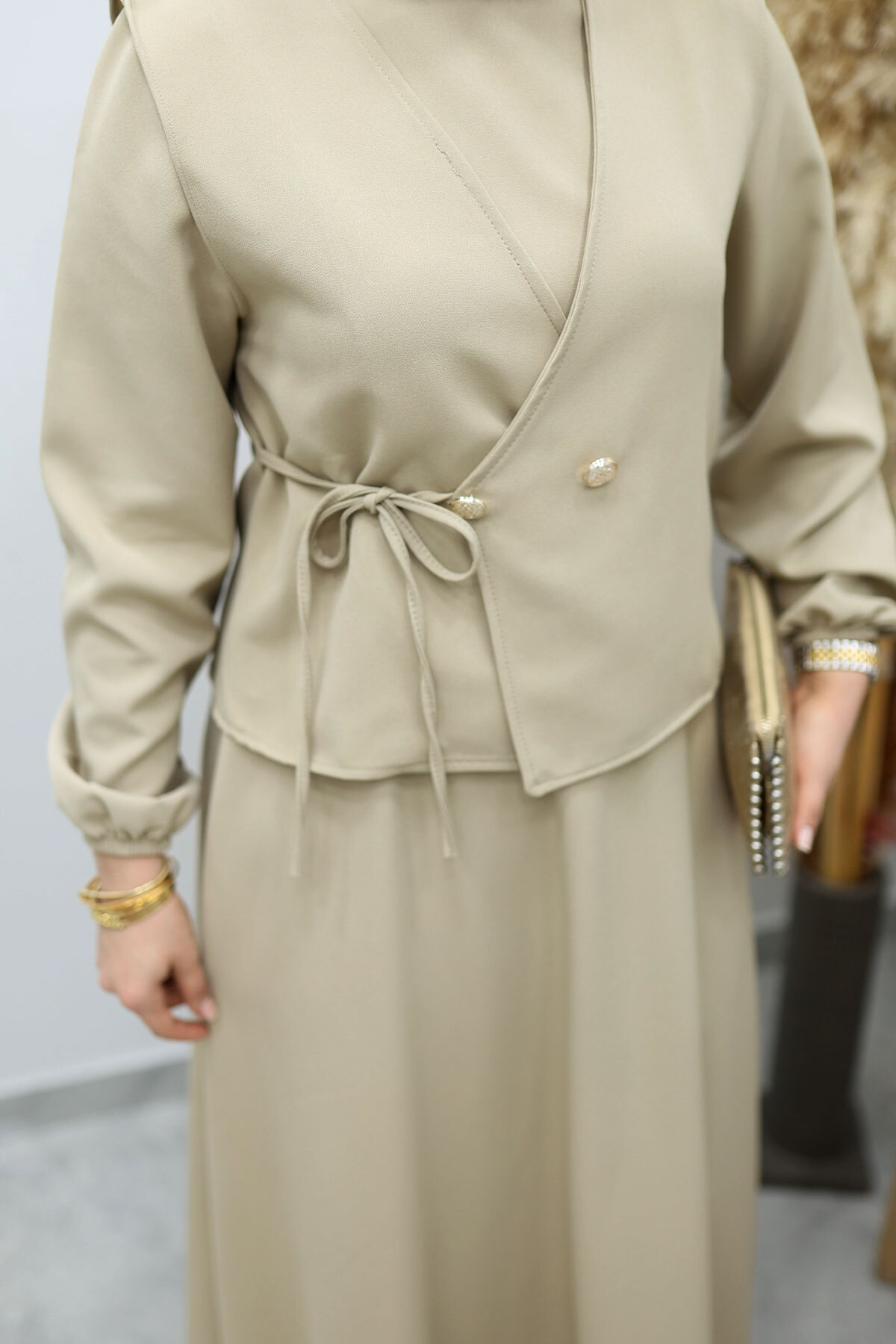 Bağlamalı Yelekli Elbise TSD260153 Bej