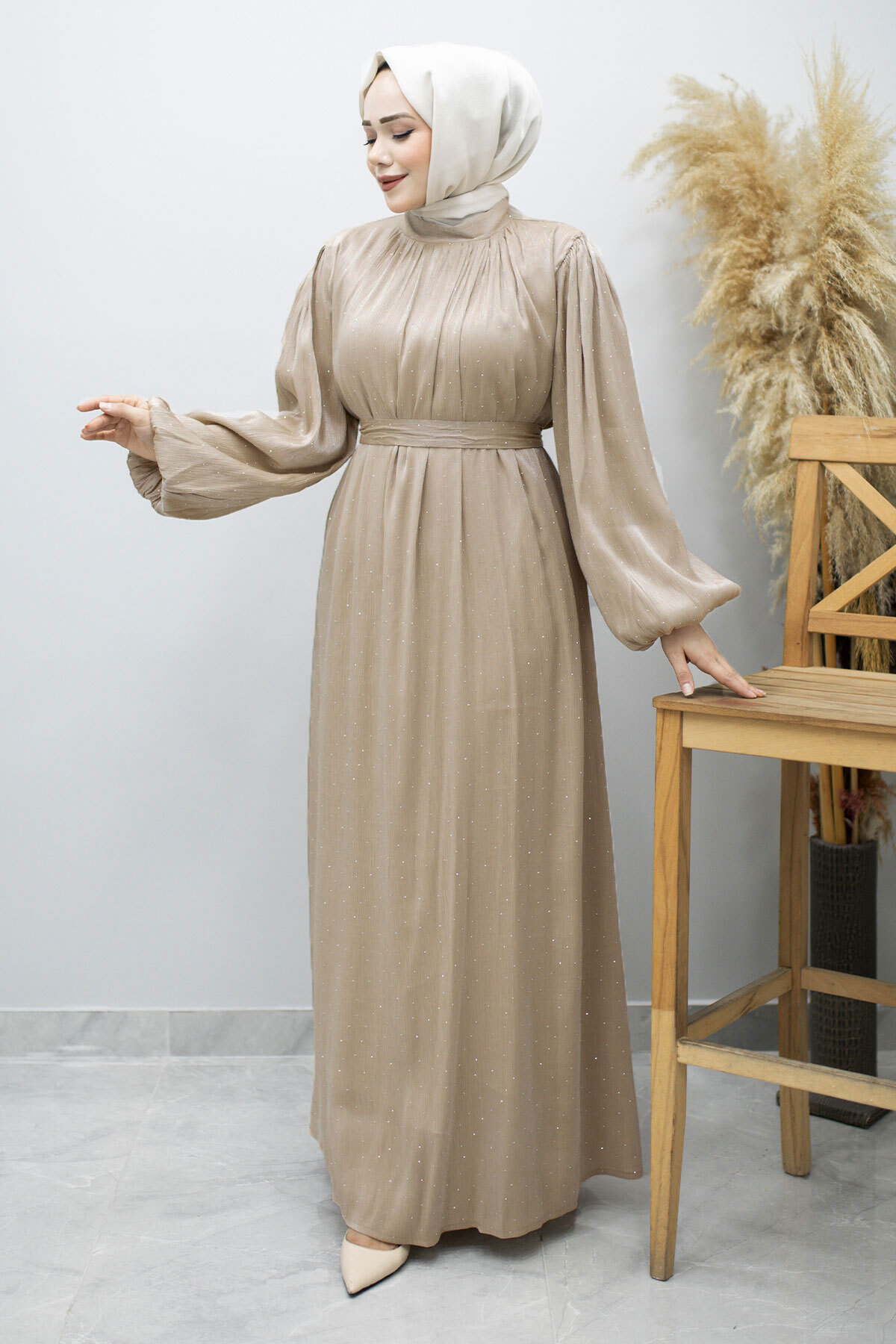 Balon Kol Taş Detaylı Abiye TSD260182 Bej Özellikleri