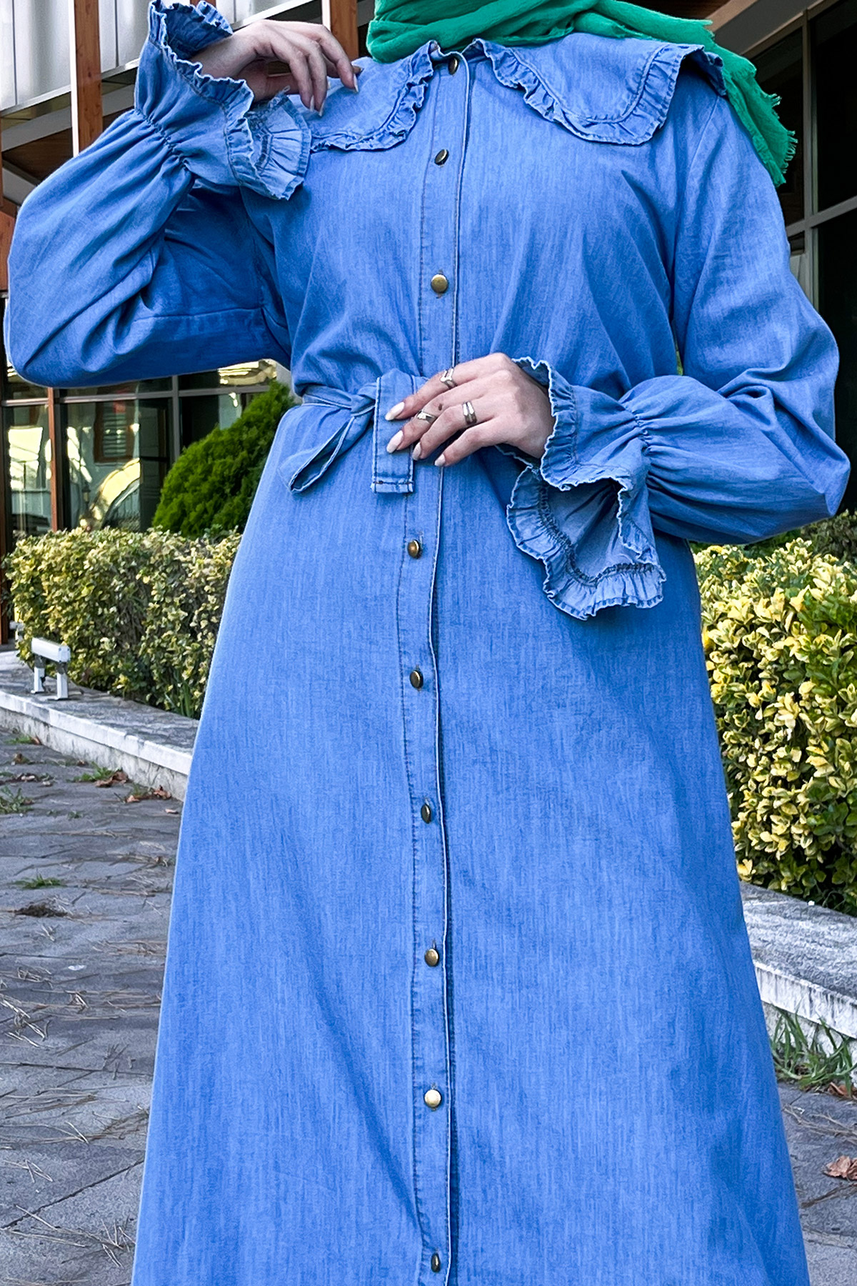 Ürün Özelliği : Yeni sezon Bebe Yaka Önü Düğmeli Kot Elbise modelidir. Eteği düzdür, önden düğmeli üründür. Kol uçları fırfır detaylıdır. Ürün renginde konsept çekimlerinden dolayı ton farklılığı olabilir.