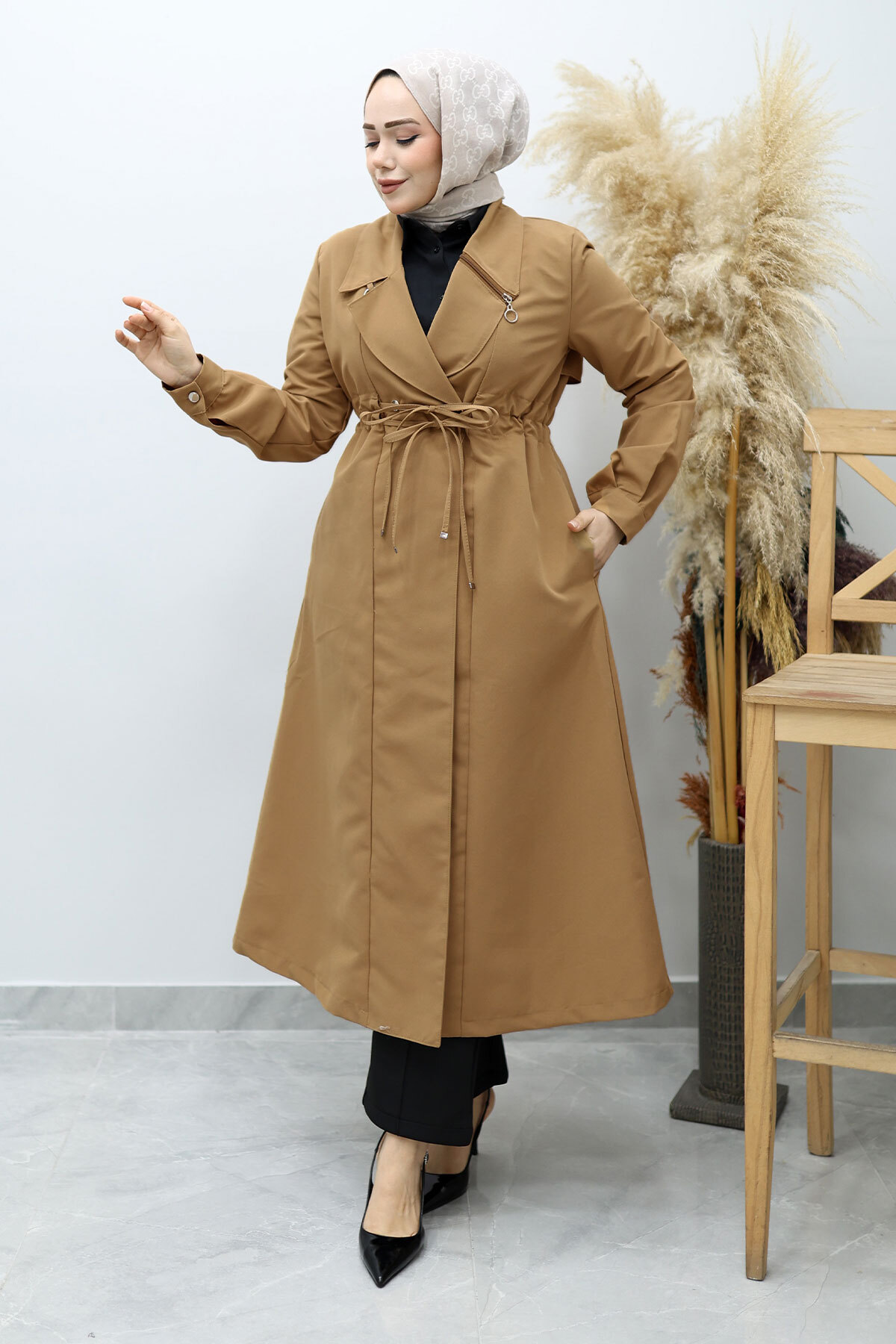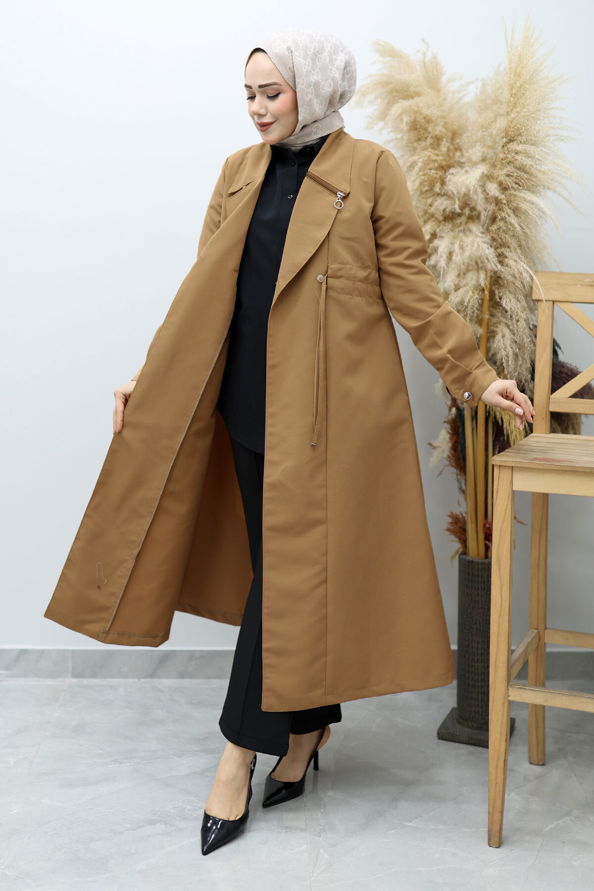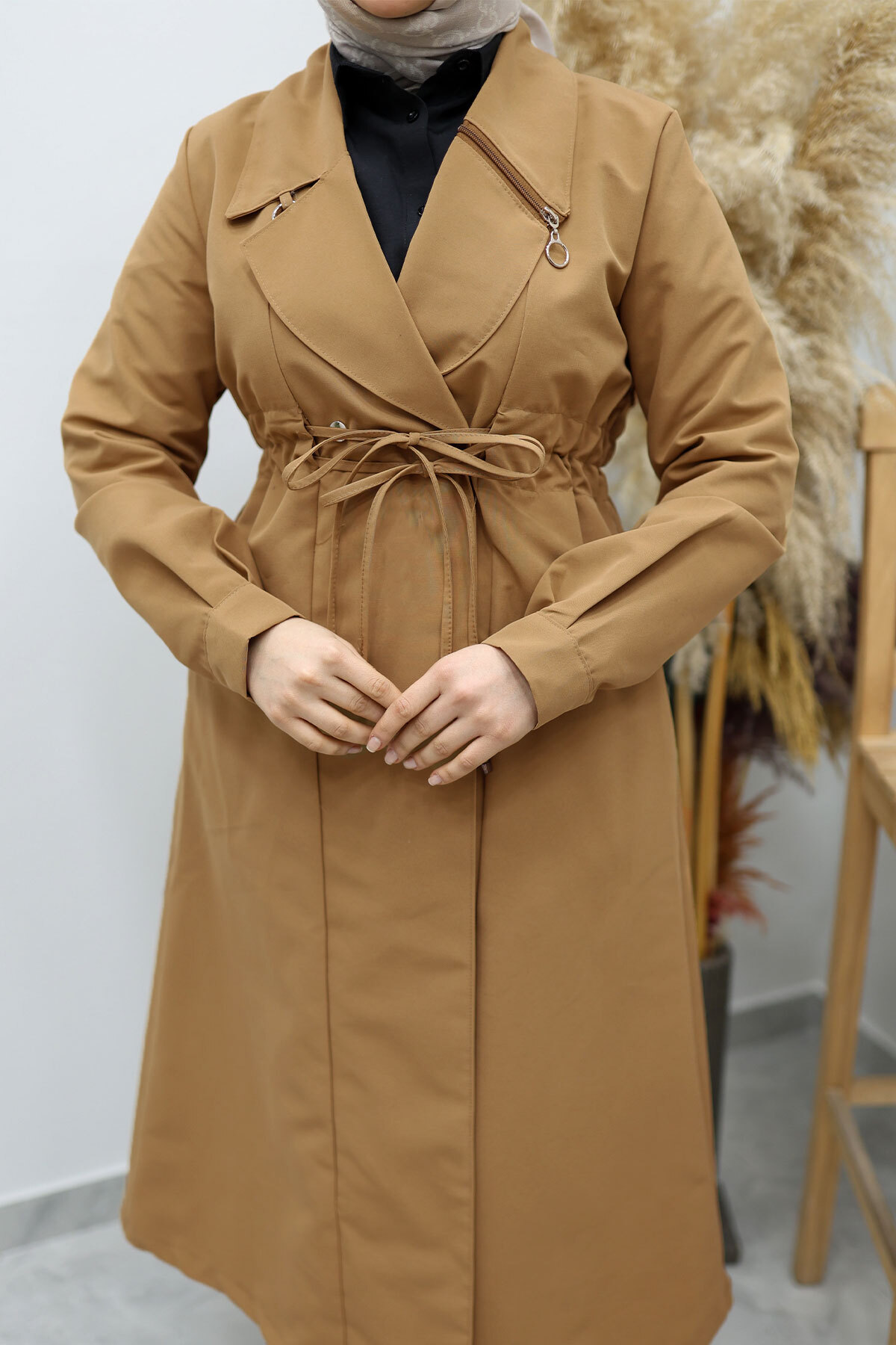 Beli Büzgülü Fermuar Detaylı Trençkot TSD260145 Taba Özellikleri