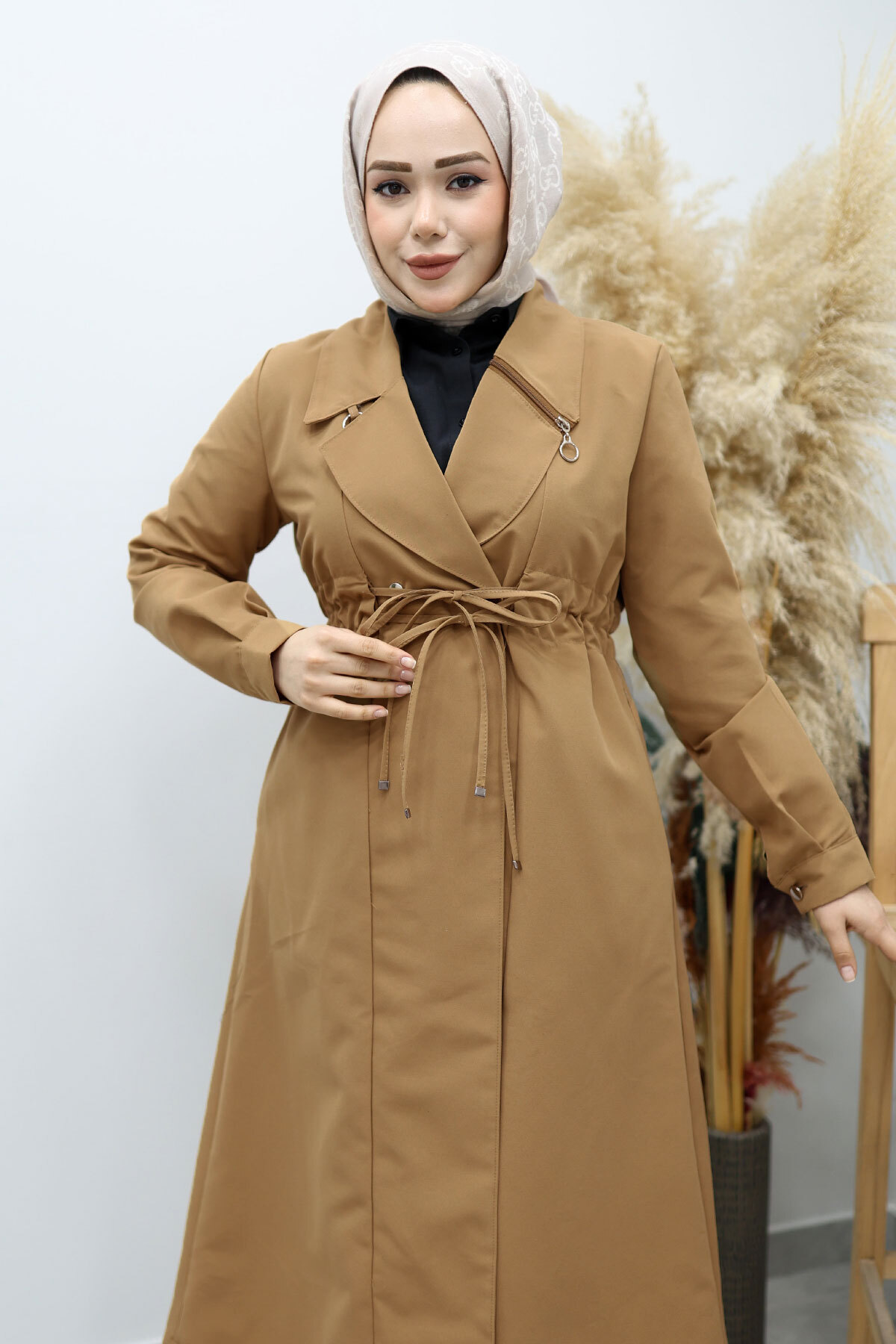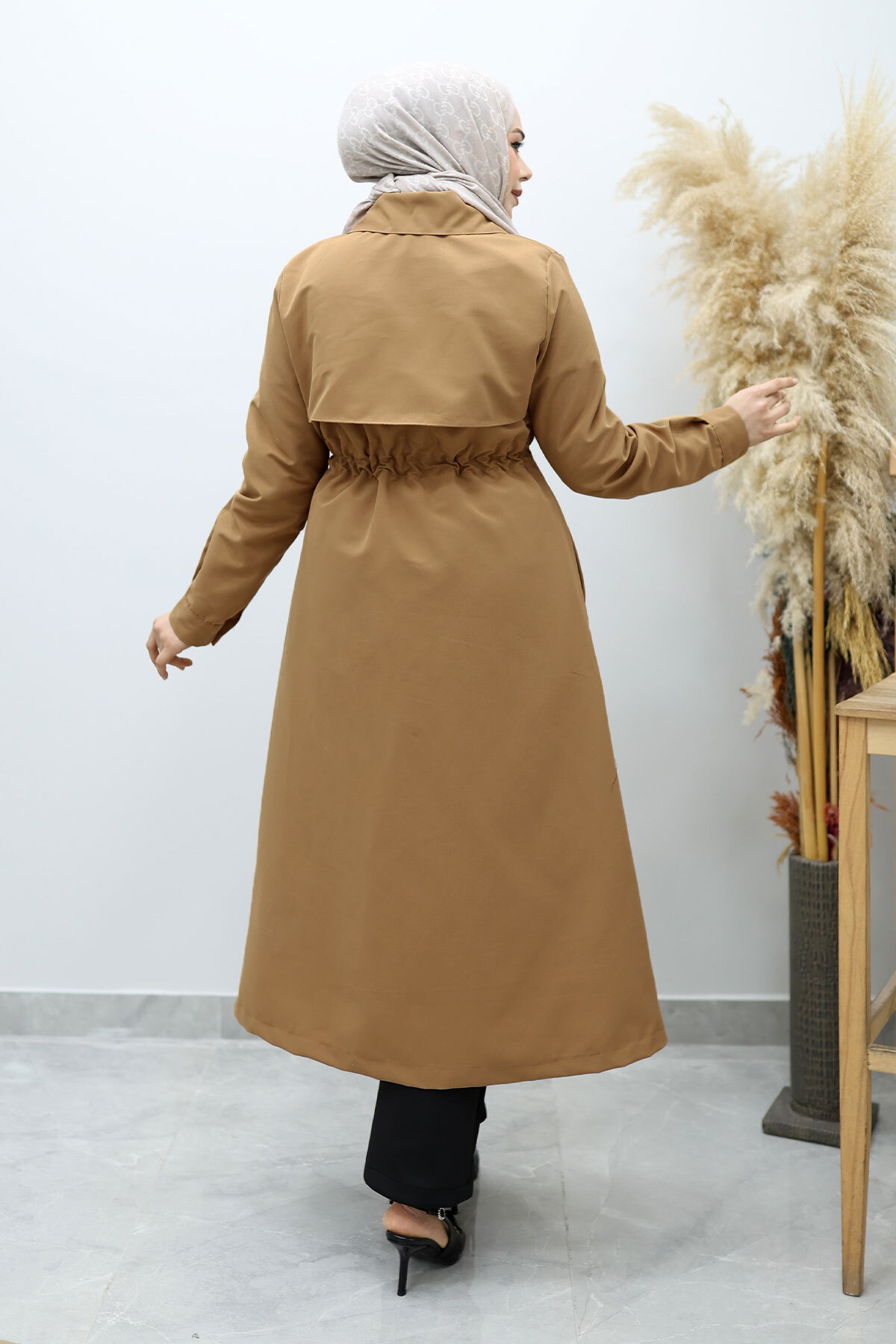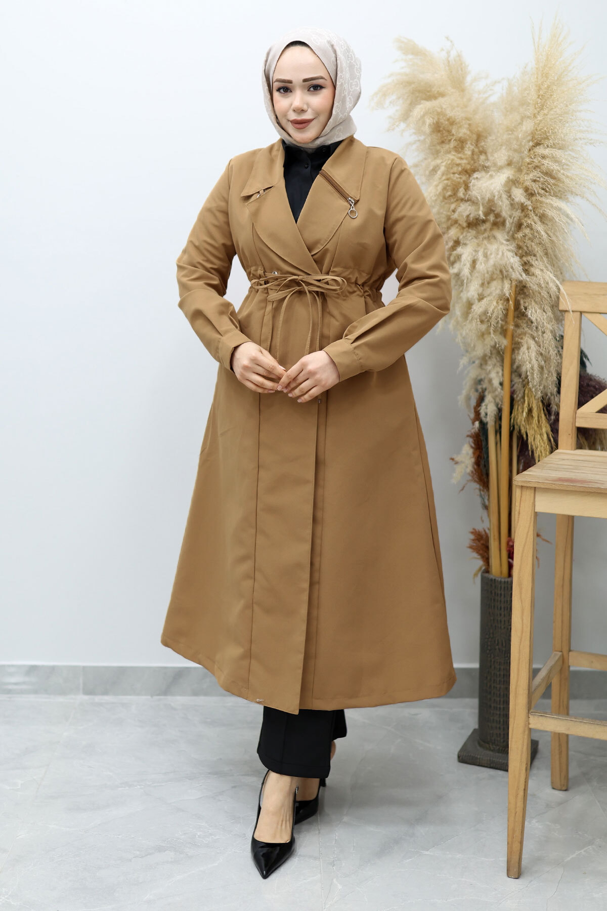 Beli Büzgülü Fermuar Detaylı Trençkot TSD260145 Taba Özellikleri