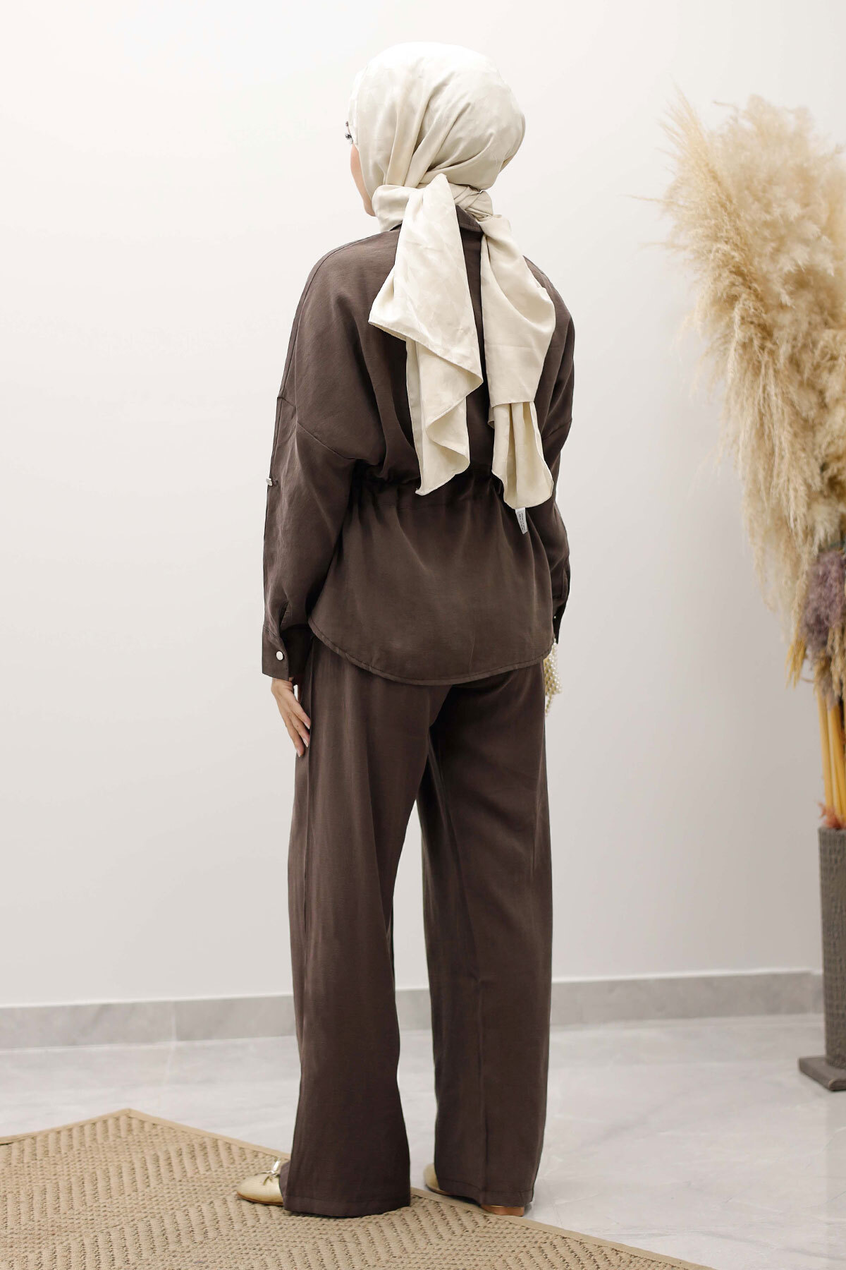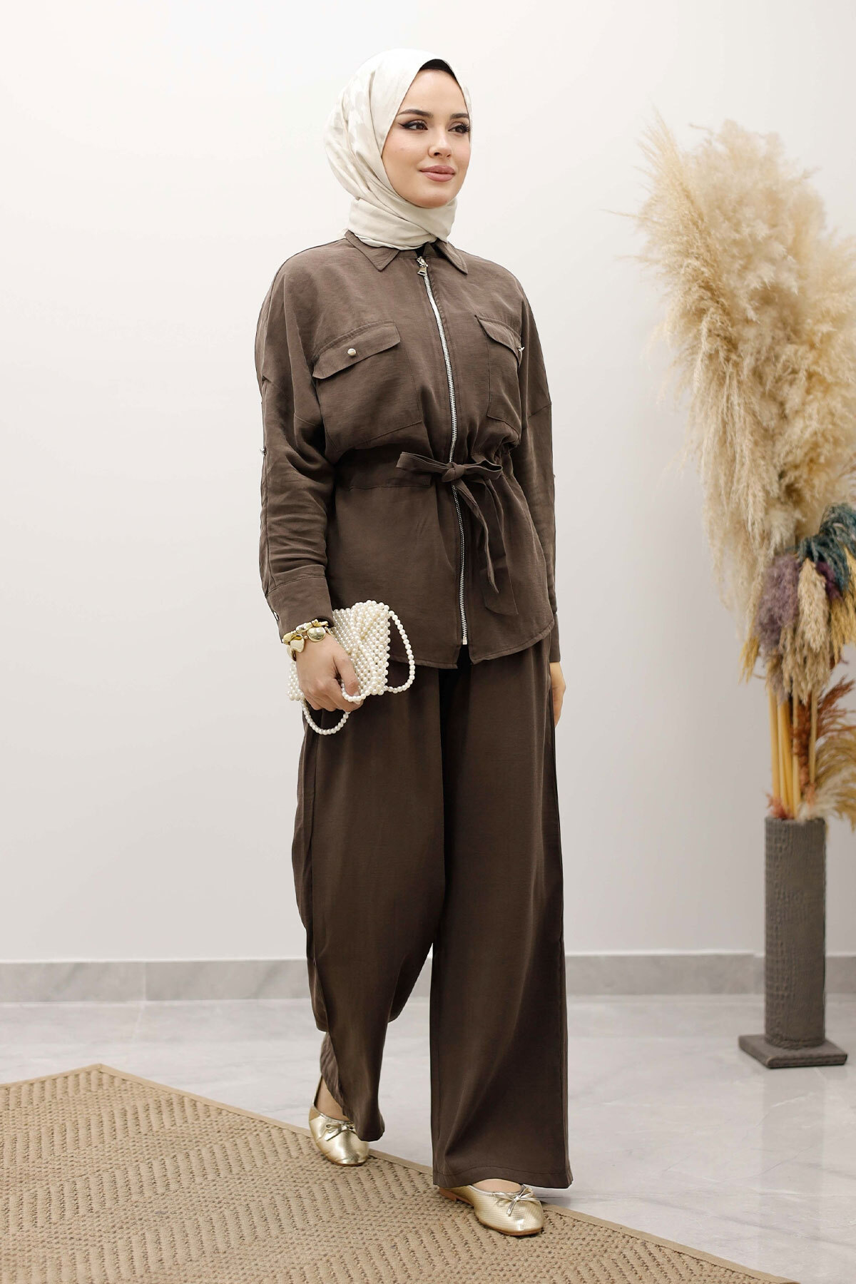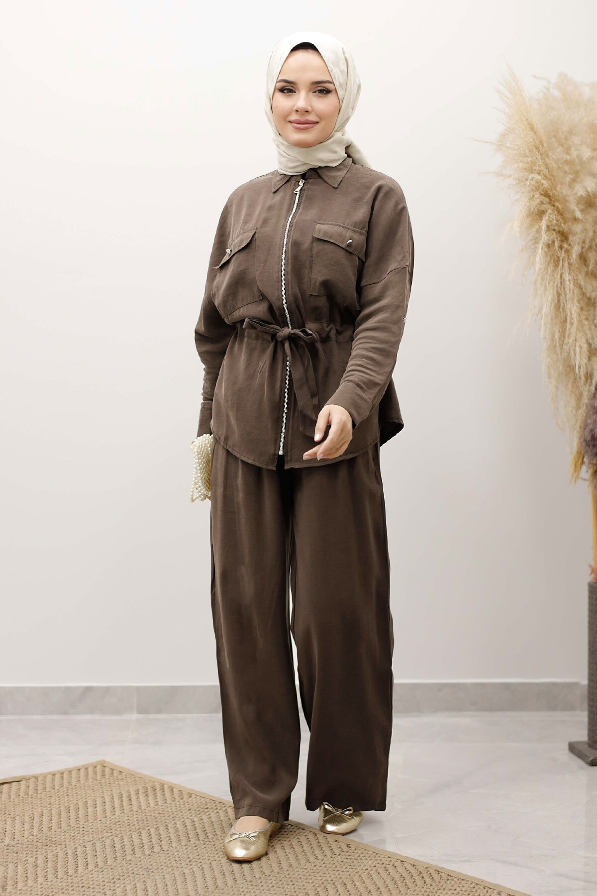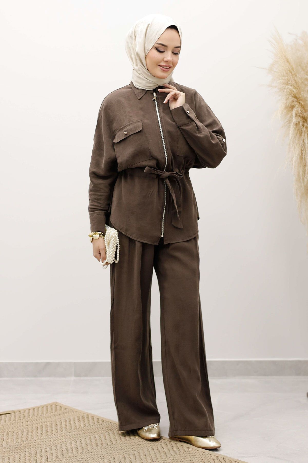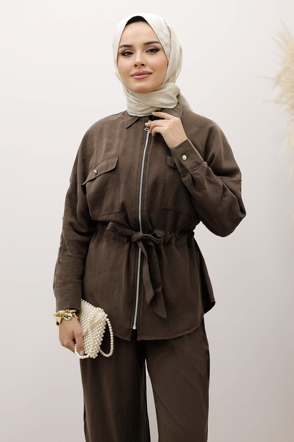 Beli Büzgülü Fermuarlı İkili Takım TSD250252 Kahverengi