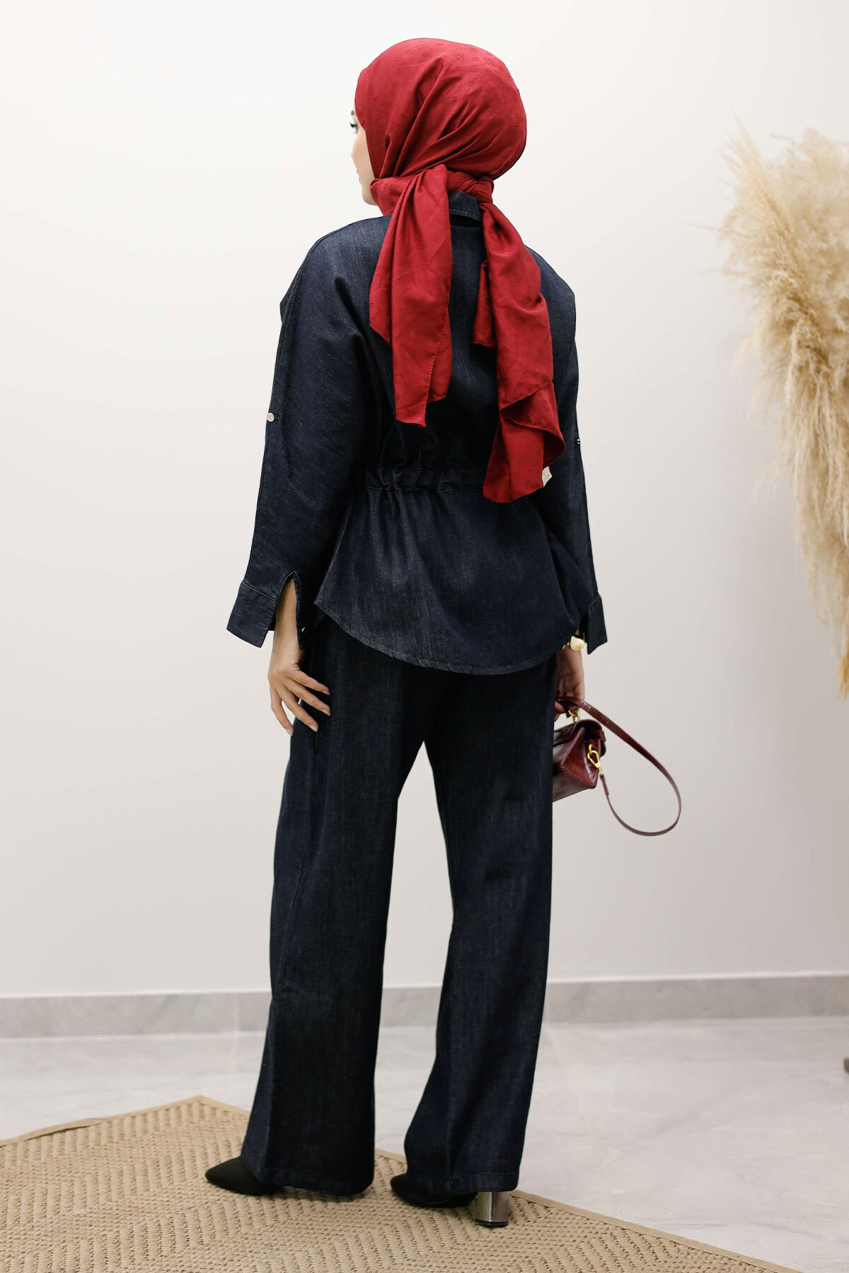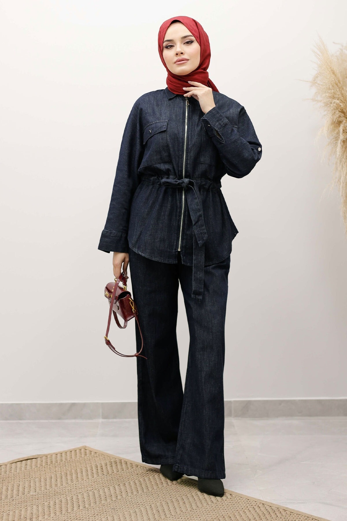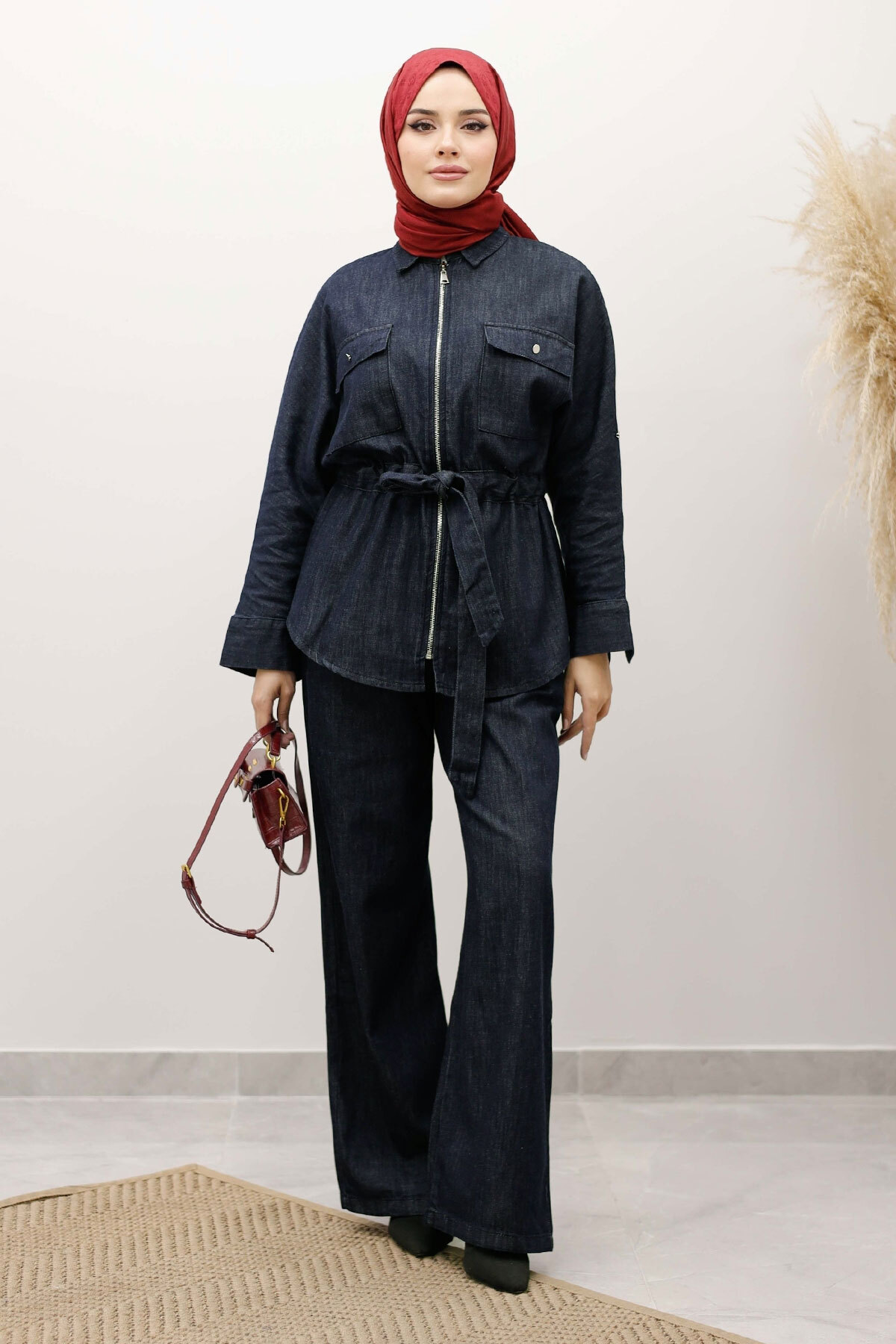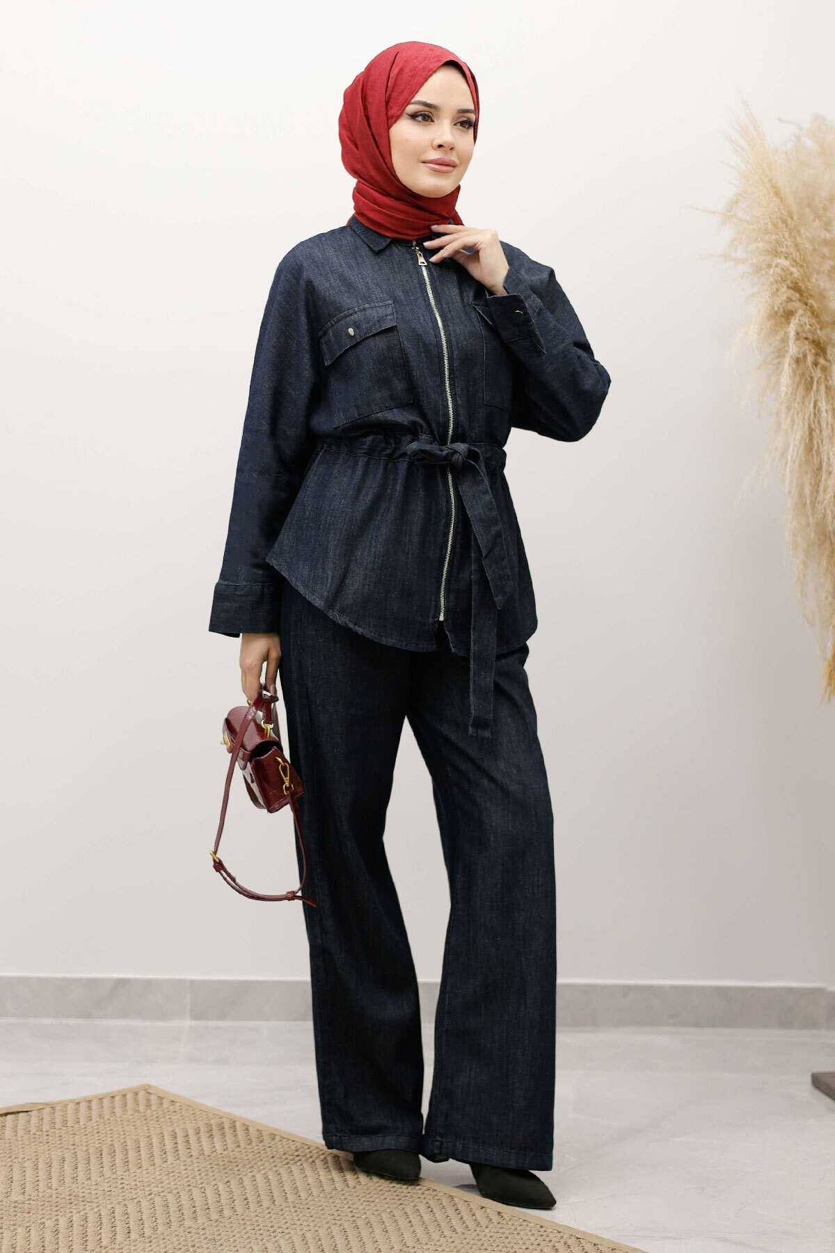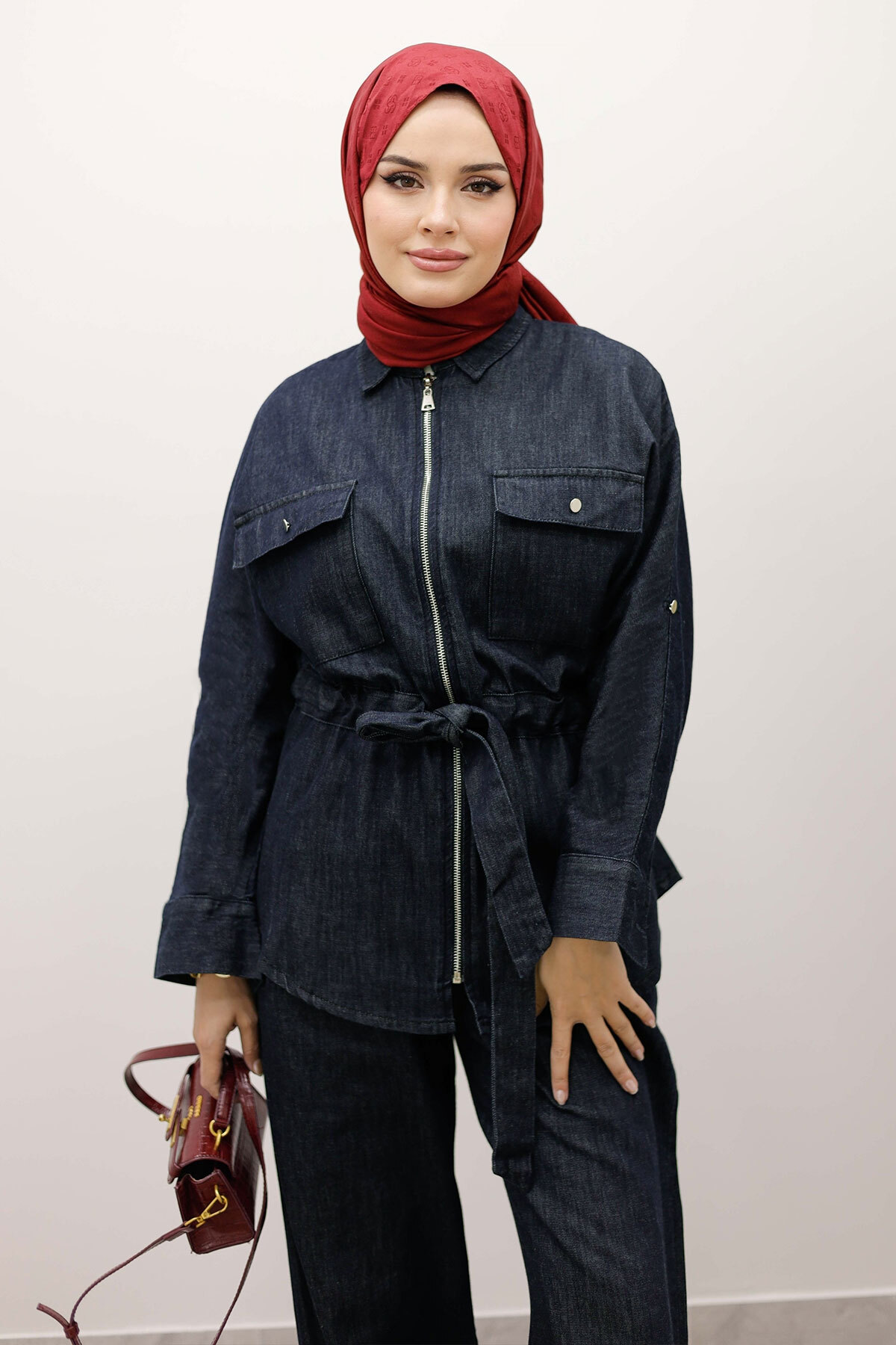 Beli Büzgülü Fermuarlı İkili Takım TSD250252 Koyu Mavi
