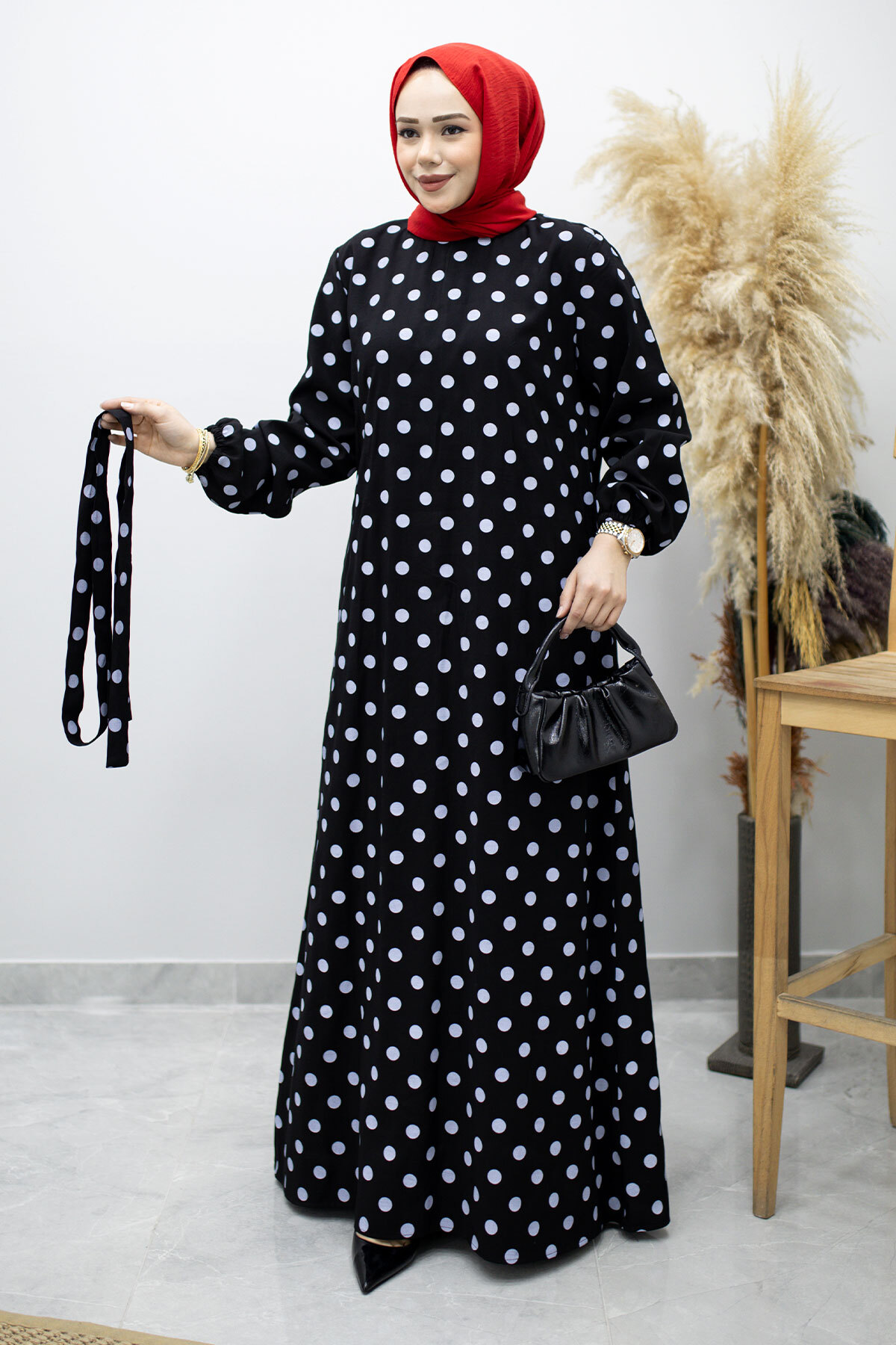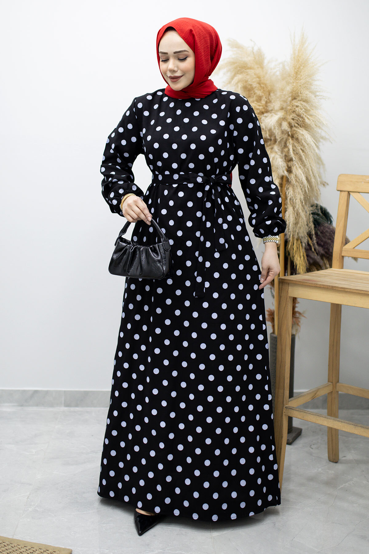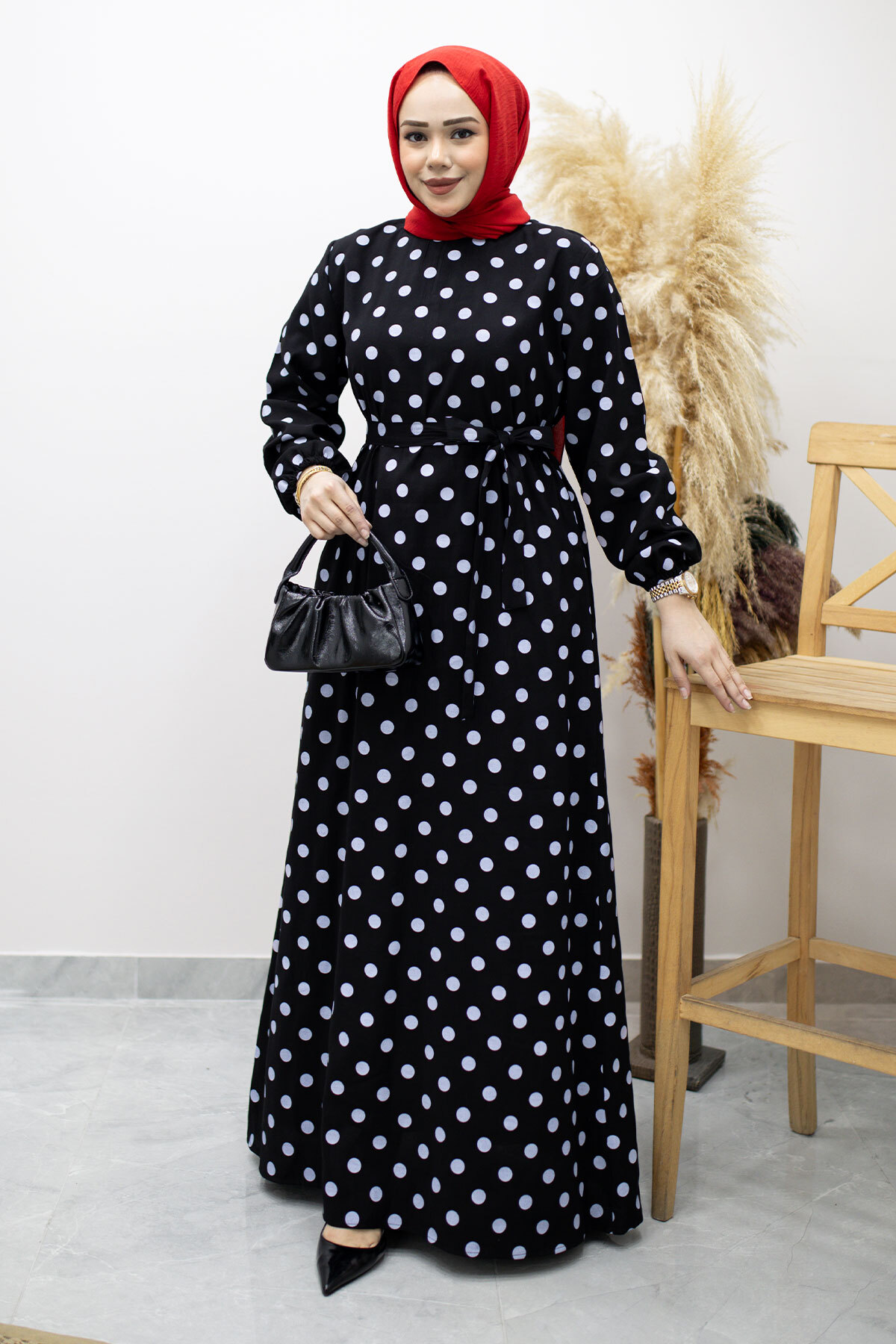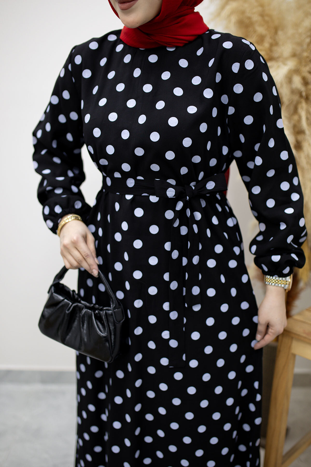 Beli Kuşaklı Puantiyeli Elbise TSD260206 Siyah Özellikleri