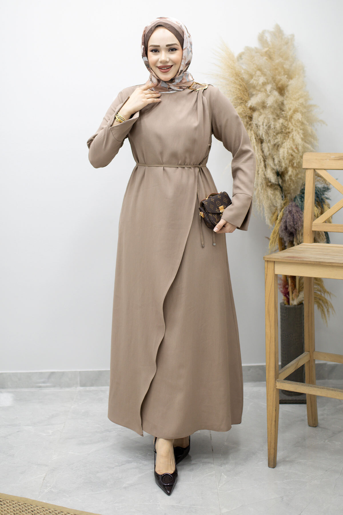 Broş Detaylı Kuşaklı Elbise TSD260198 Vizon Özellikleri