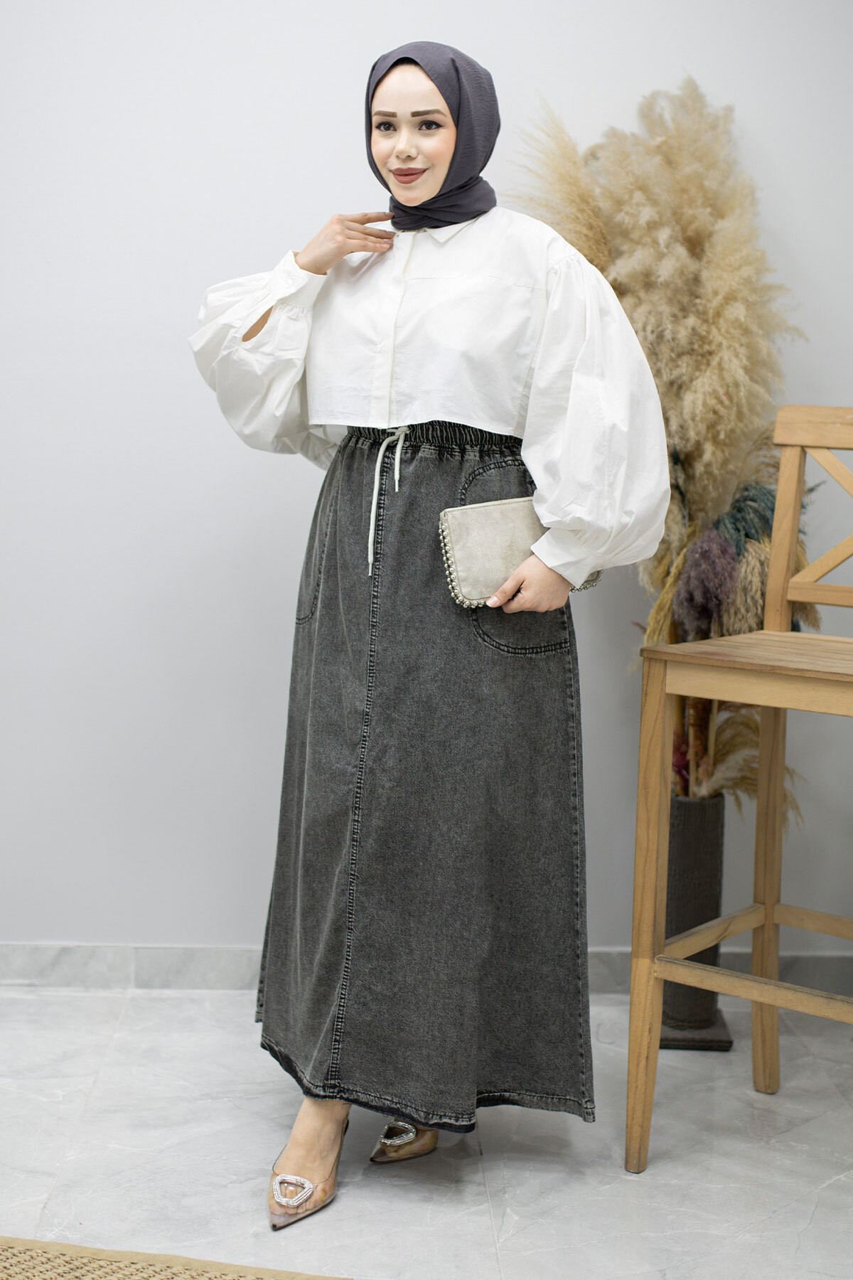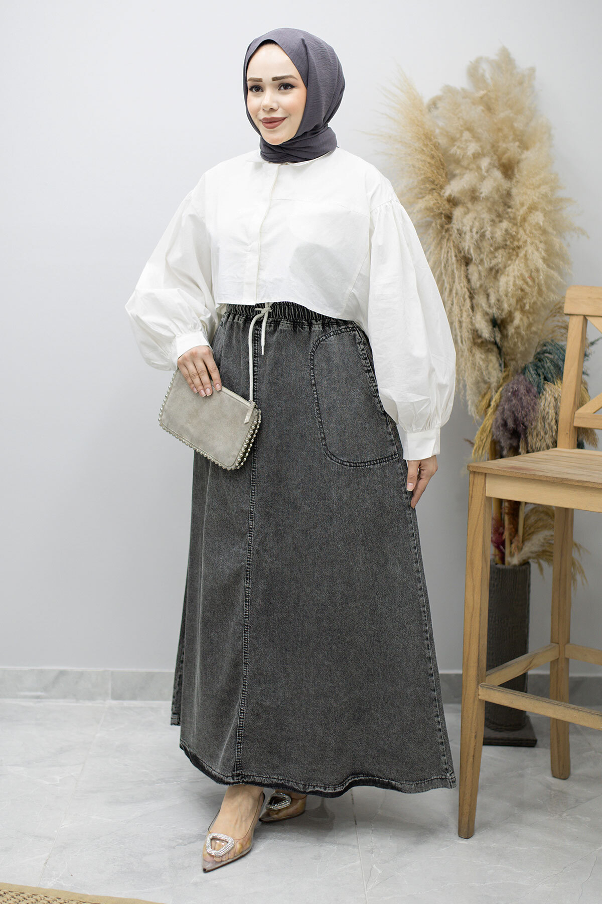 Ürün Özelliği : Yeni sezon Cepli Beli Lastikli Kot Etek modelidir.
