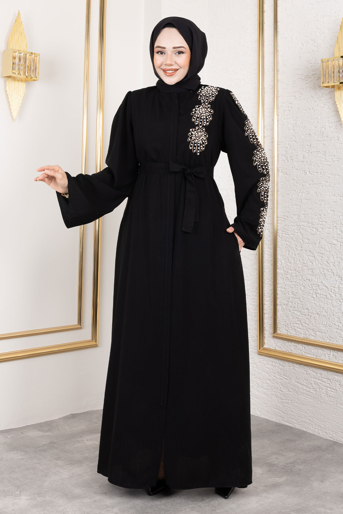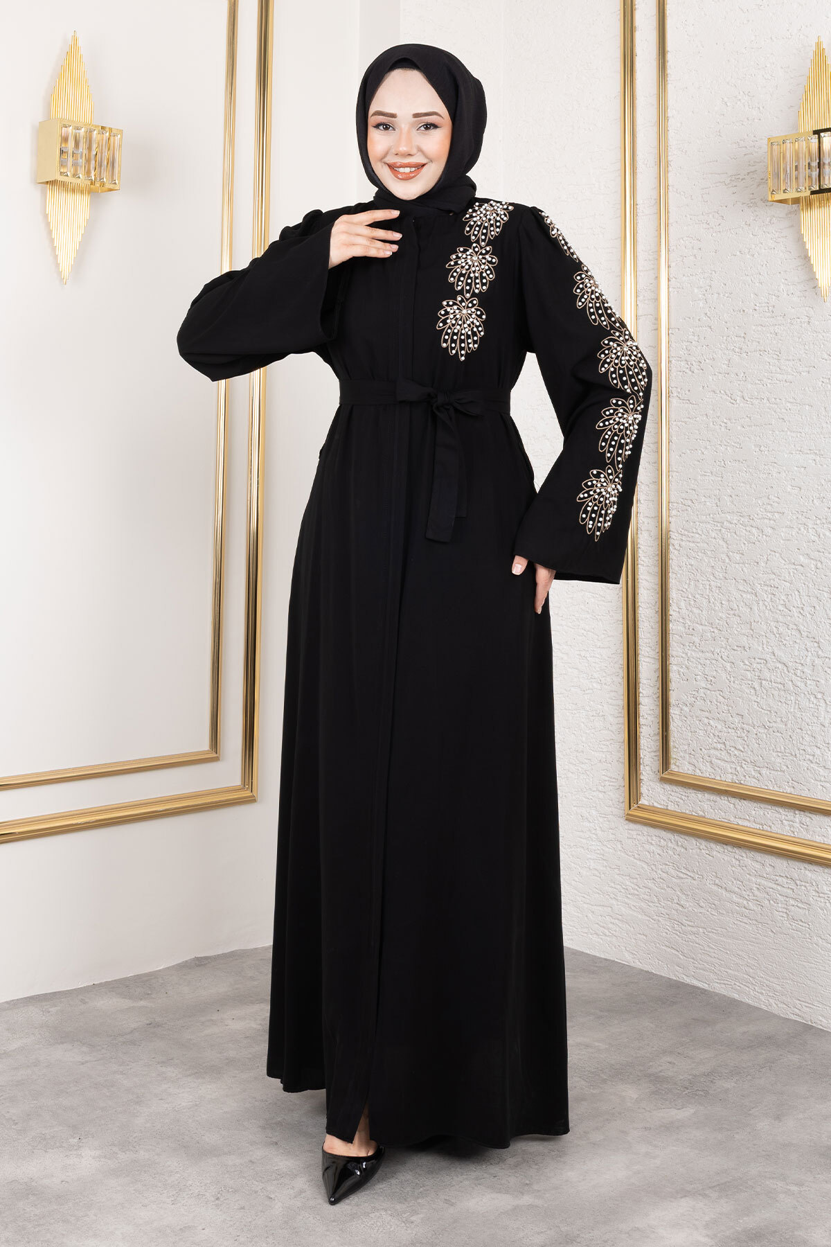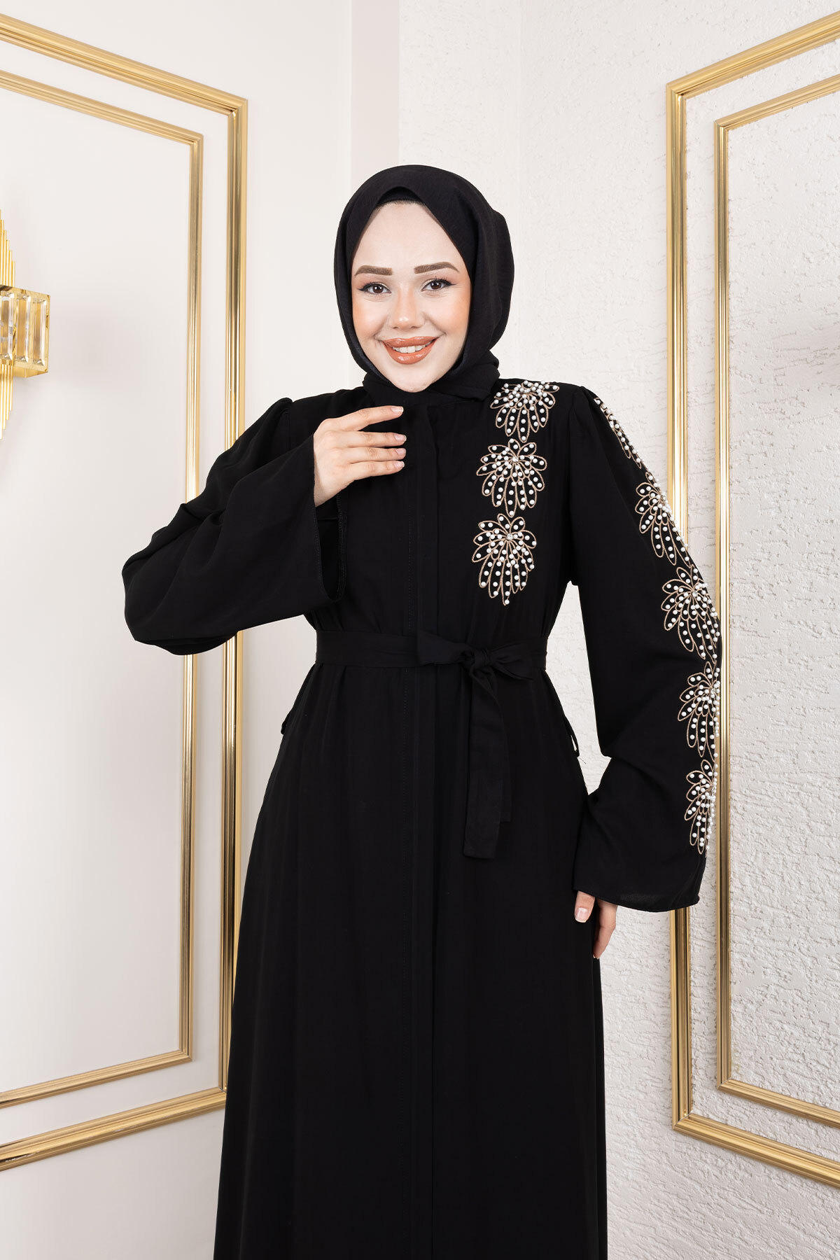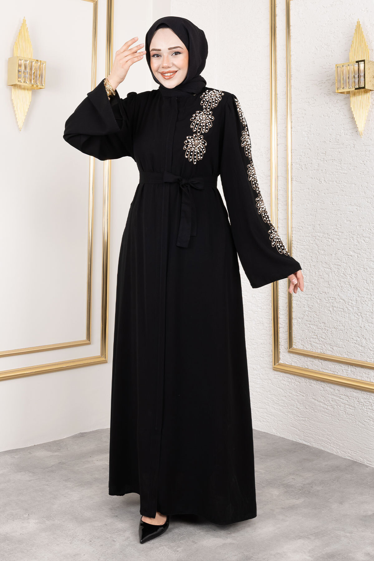 Ürün Özelliği : Yeni sezon Çiçek Desenli Boncuk İşlemeli Ferace modelidir. Boydan fermuar ile açılmaktadır. Omuzunda ve kolunda boncuk detayları vardır. Beli kuşaklıdır. Kolu düzdür. Cebi vardır. Astarsızdır. Ürün renginde konsept çekimlerinden dolayı ton farklılığı olabilir.