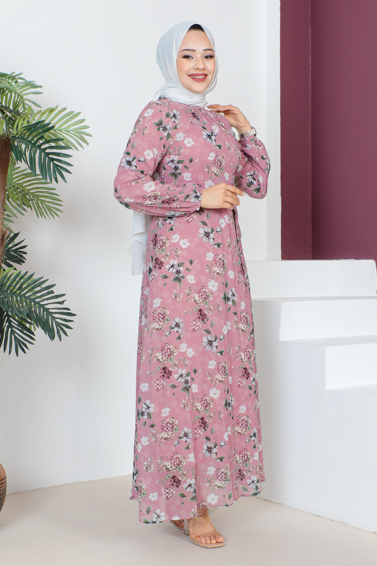 Çiçek Desenli Şifon Elbise TSD230607 Gül Kurusu Özellikleri