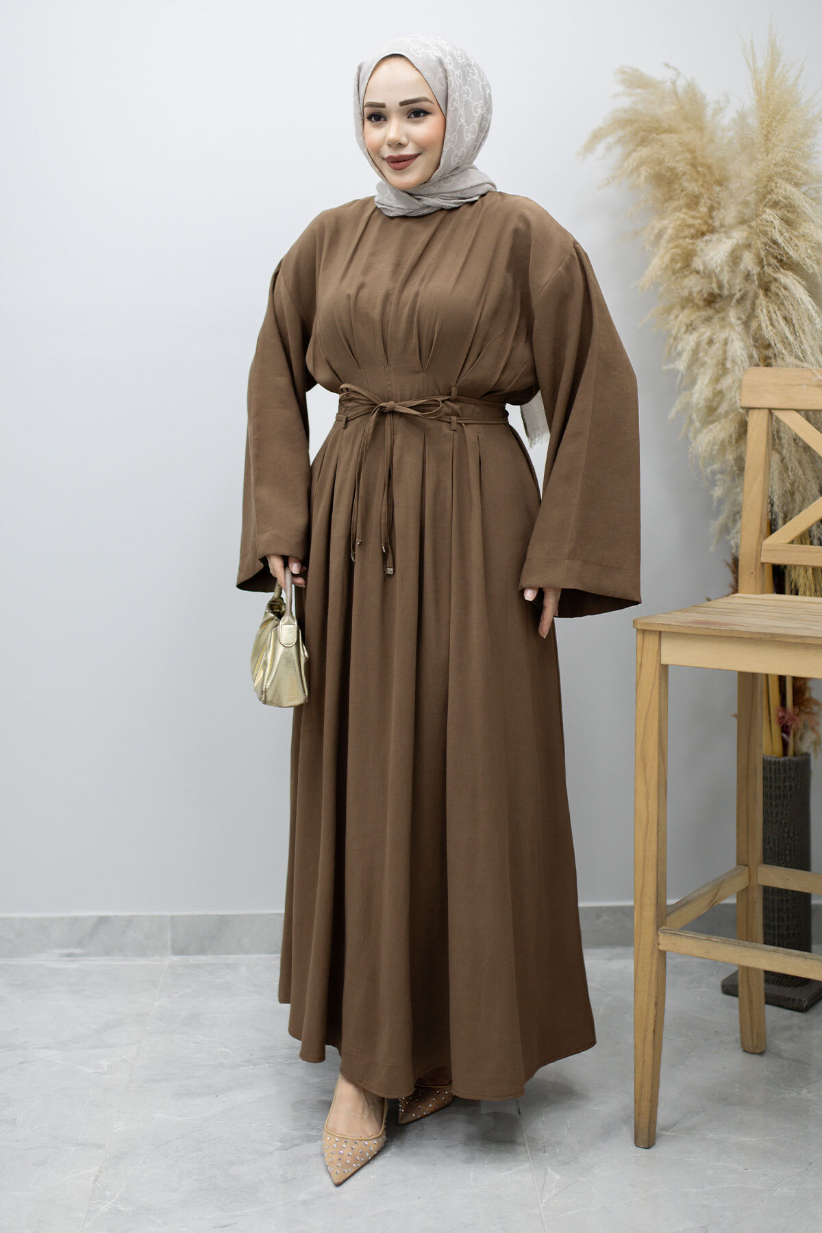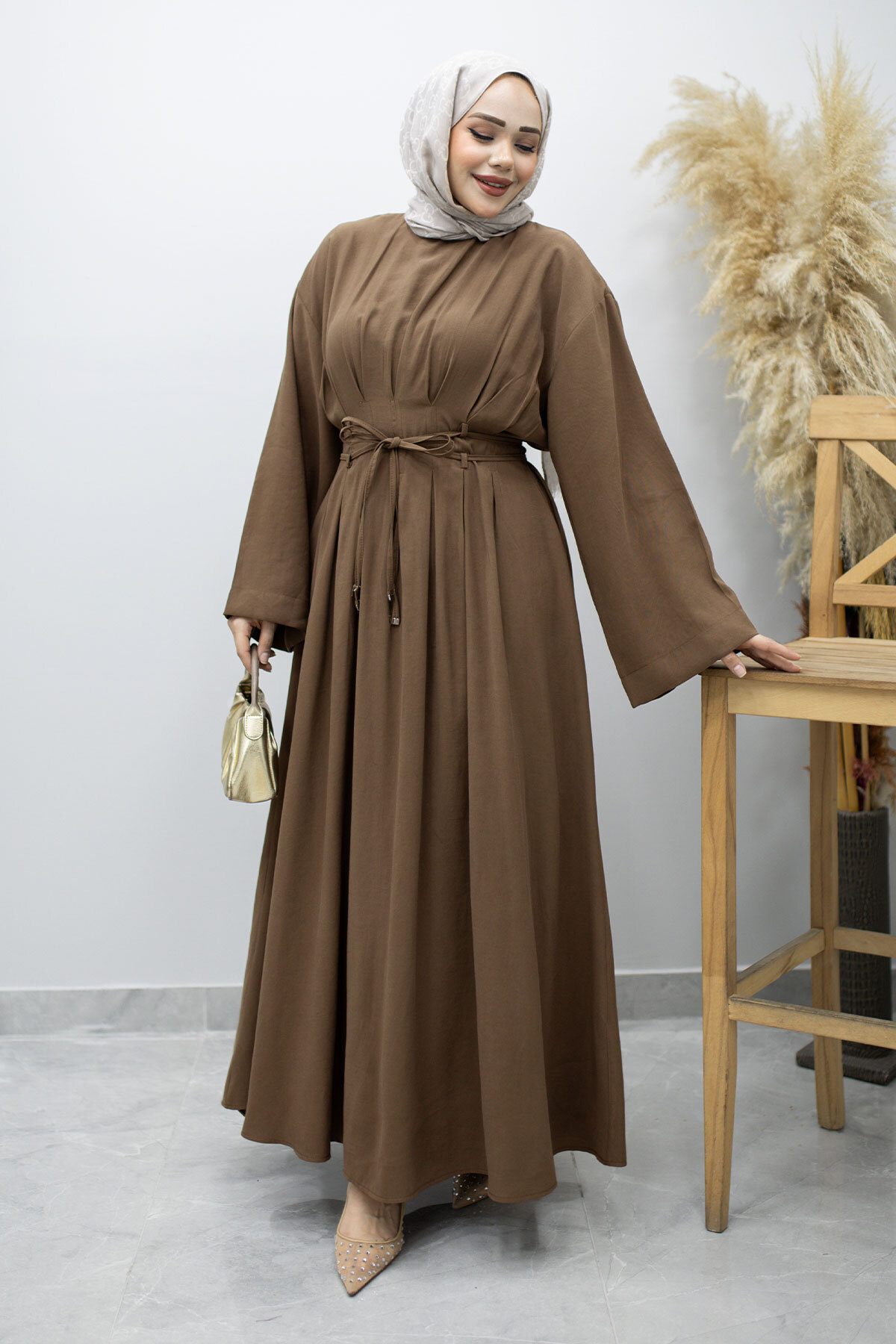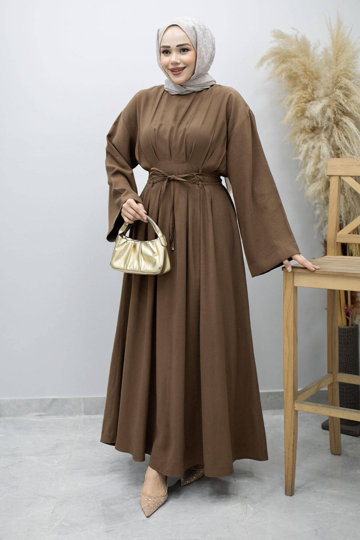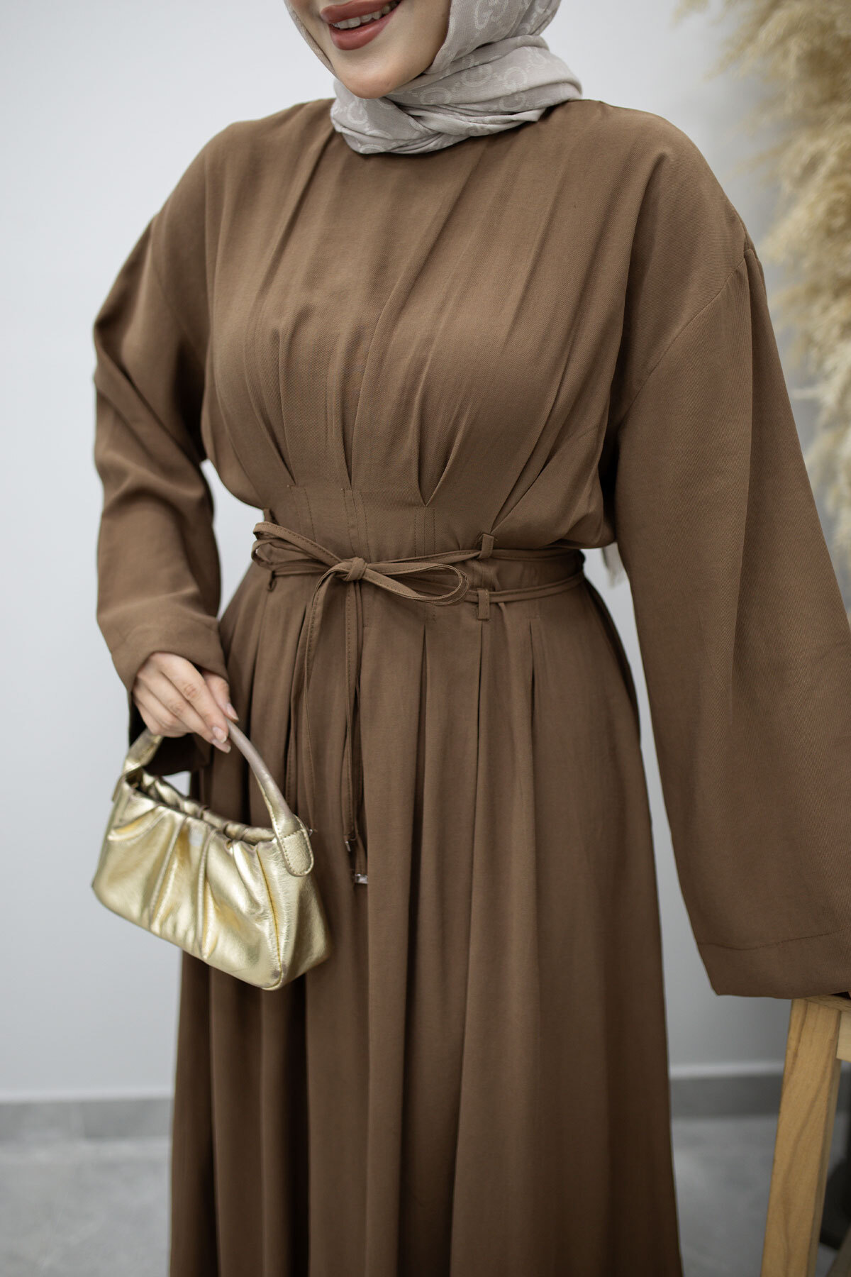 Çift Bağlamalı Pensli Elbise TSD260185 Kahverengi Özellikleri