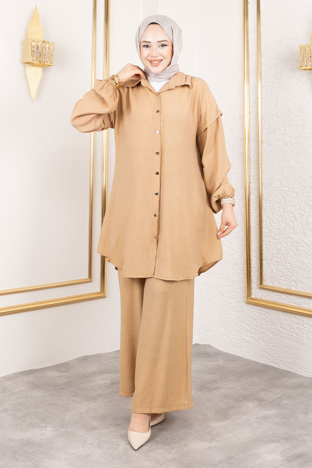 Ürün Özelliği : Yeni sezon Bileği Lastikli Düğmeli İkili Takım modelidir. Tunik boydan düğmelidir. Tuniğin bileği lastiklidir. Astarsızdır. Pantolonun yanlarında iki adet cebi bulunmaktadır. Ürün renginde konsept çekimlerinden dolayı ton farklılığı olabilir.