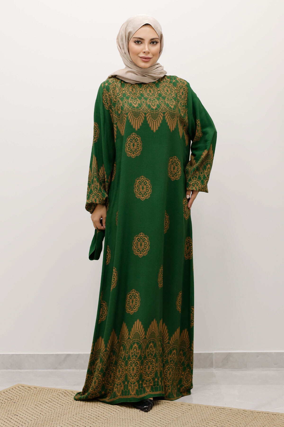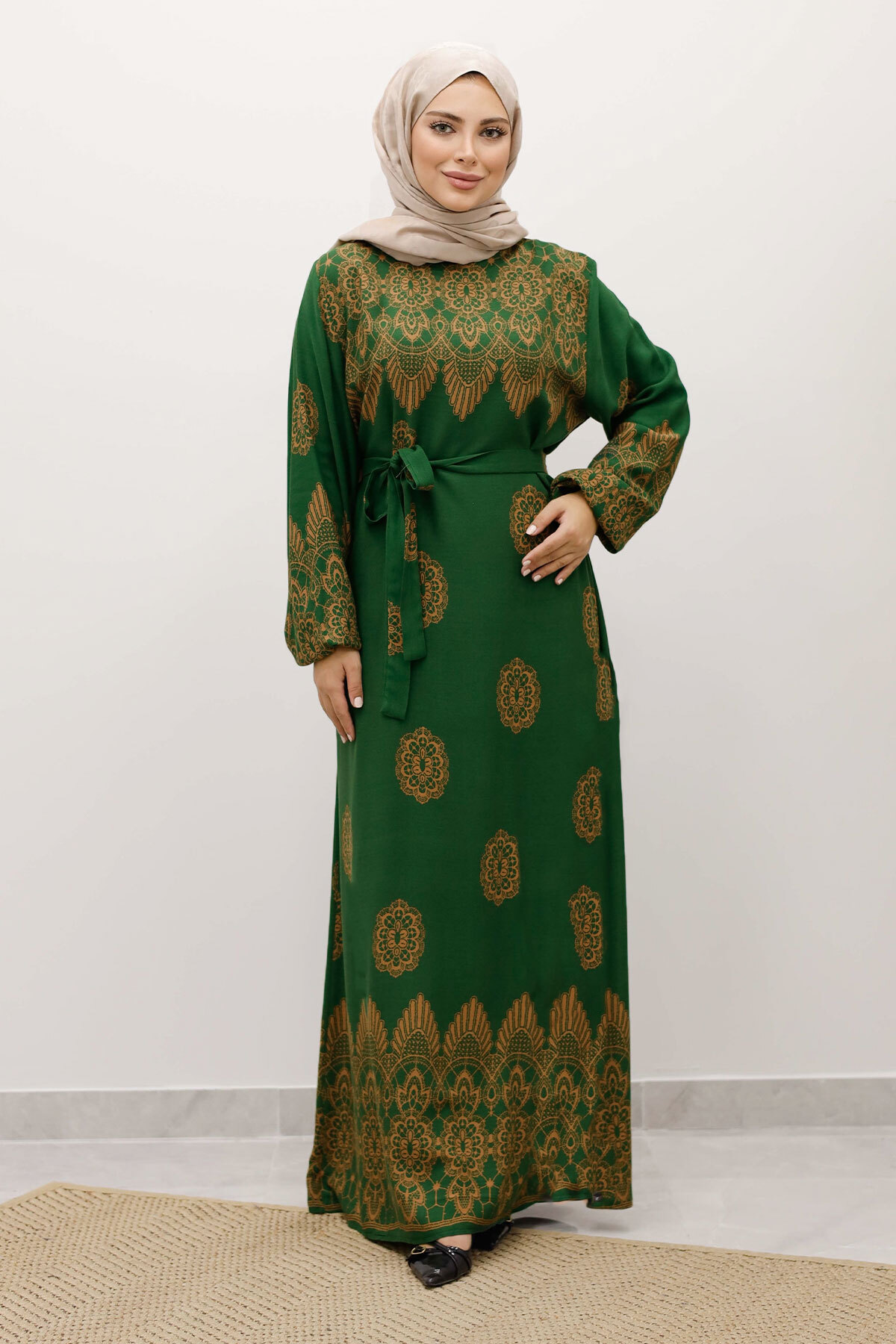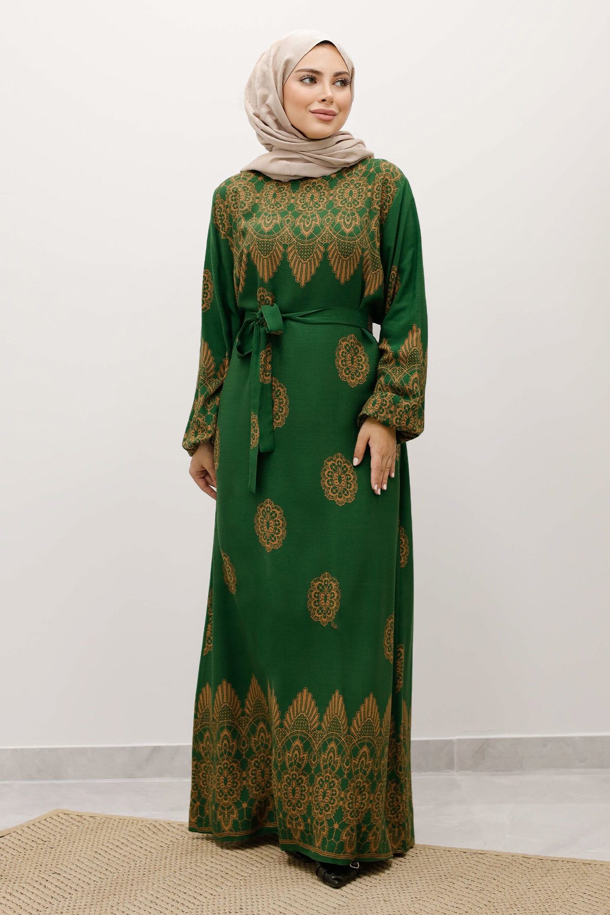 Çini Desenli Viskon Elbise TSD250237 Yeşil