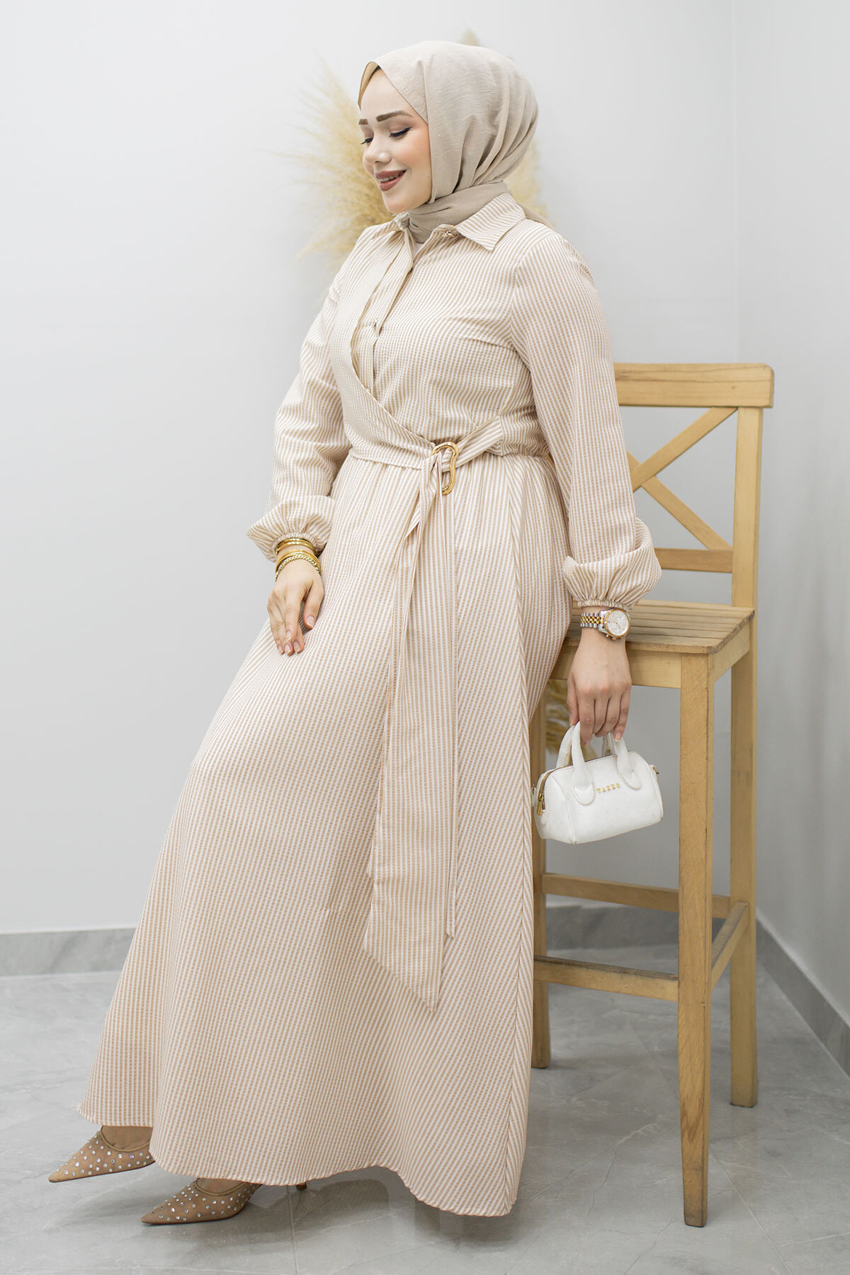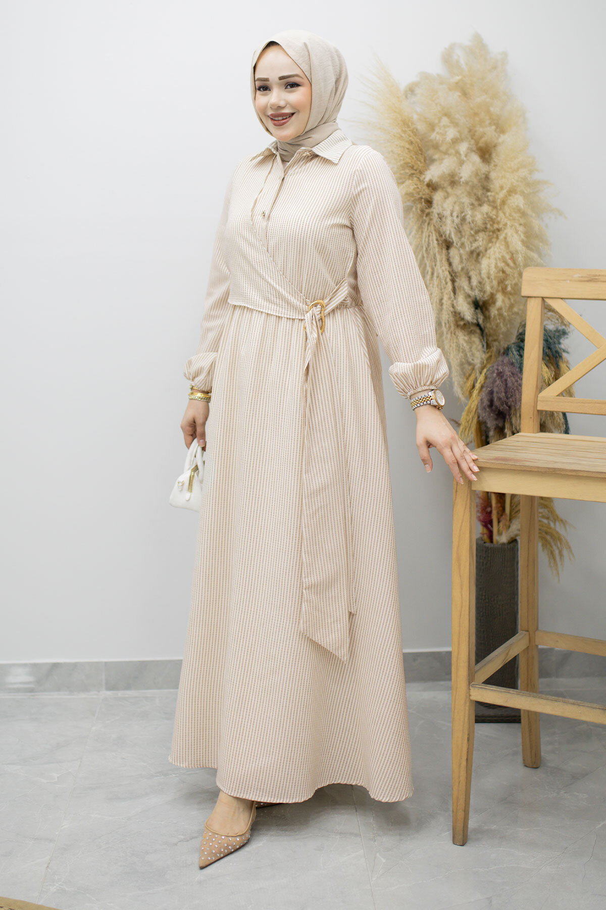Çizgili Tokalı Gömlek Elbise TSD260196 Bej Özellikleri