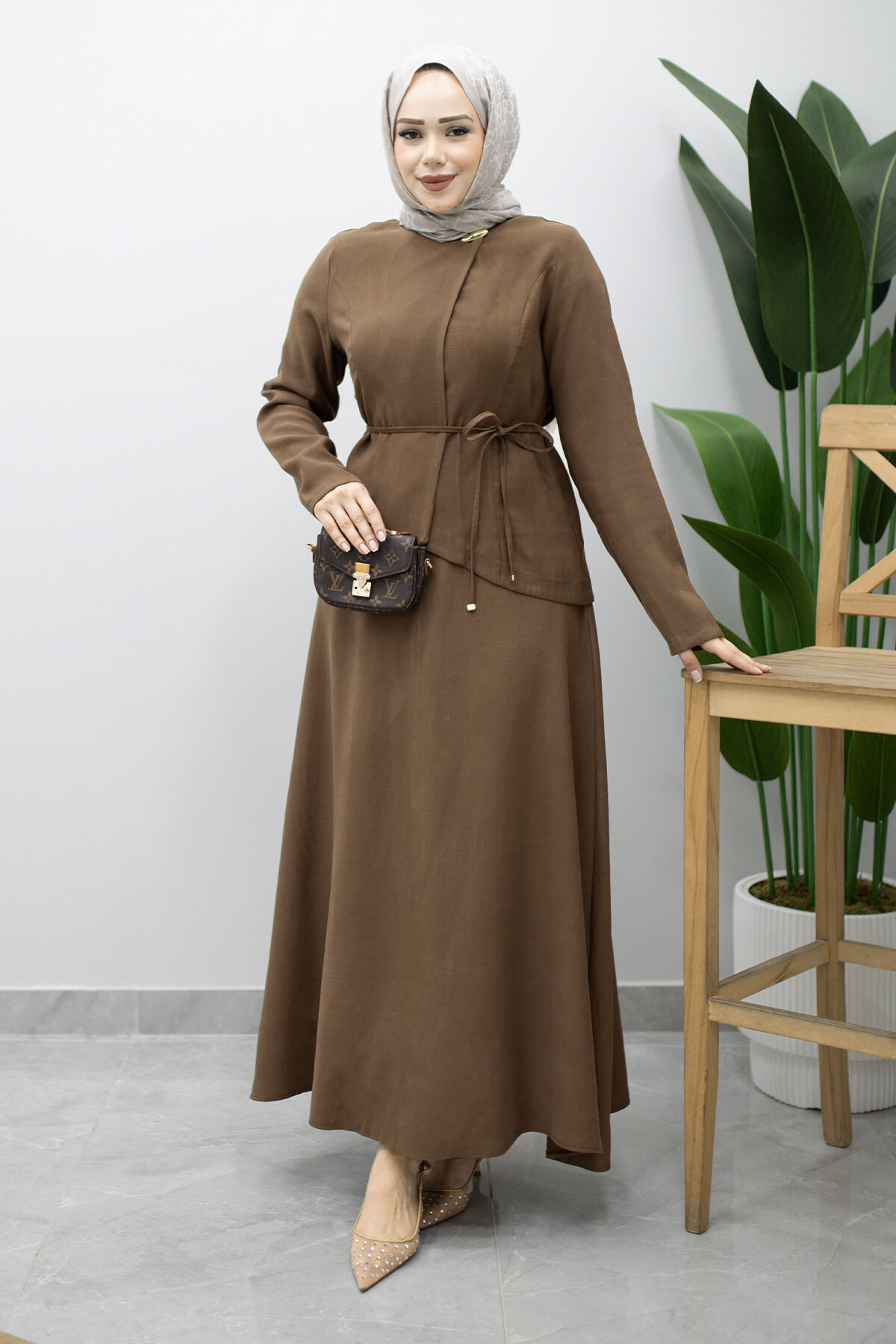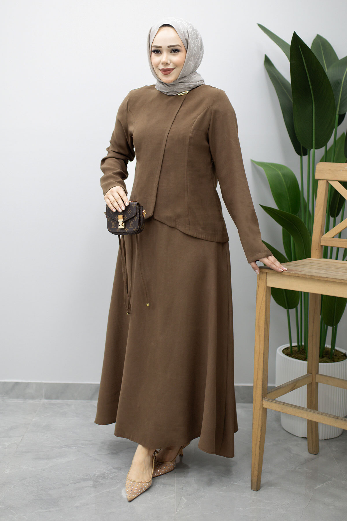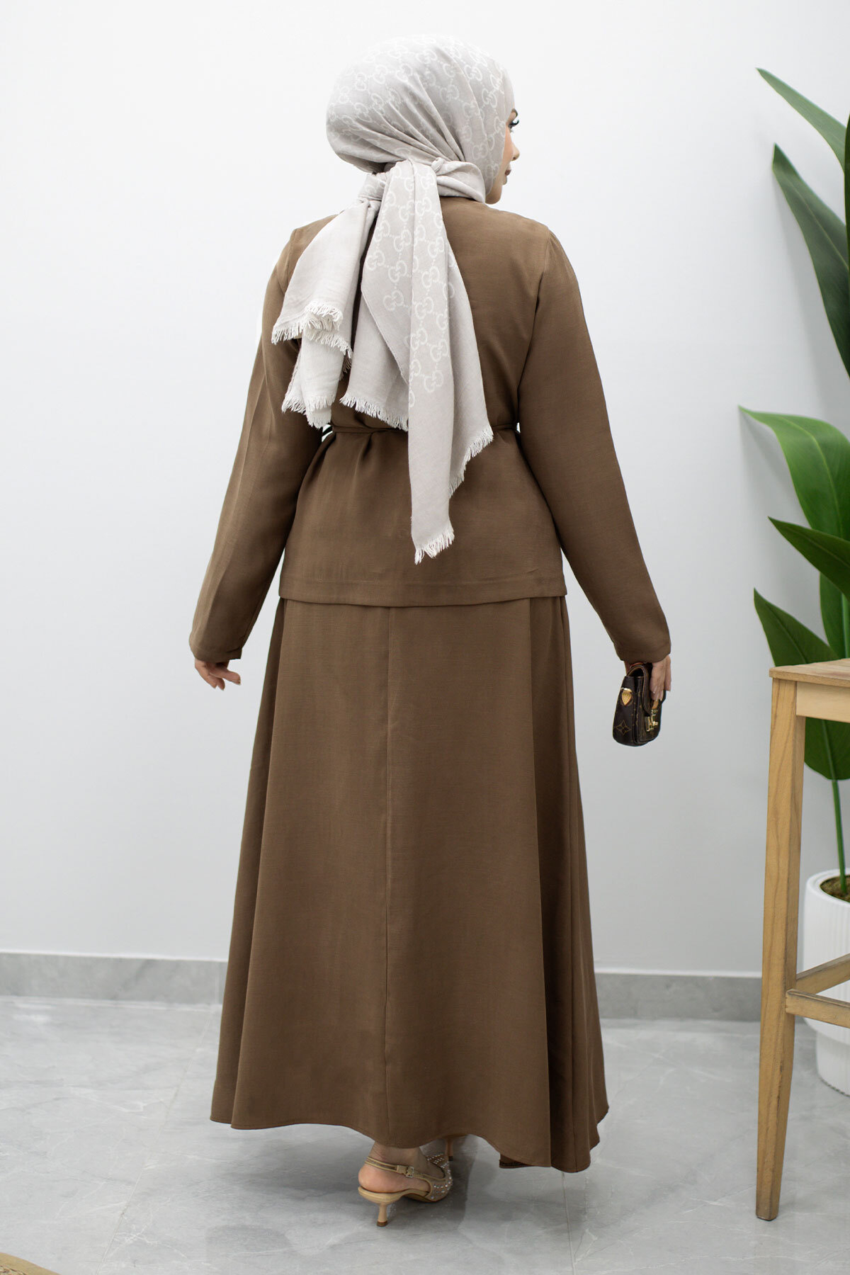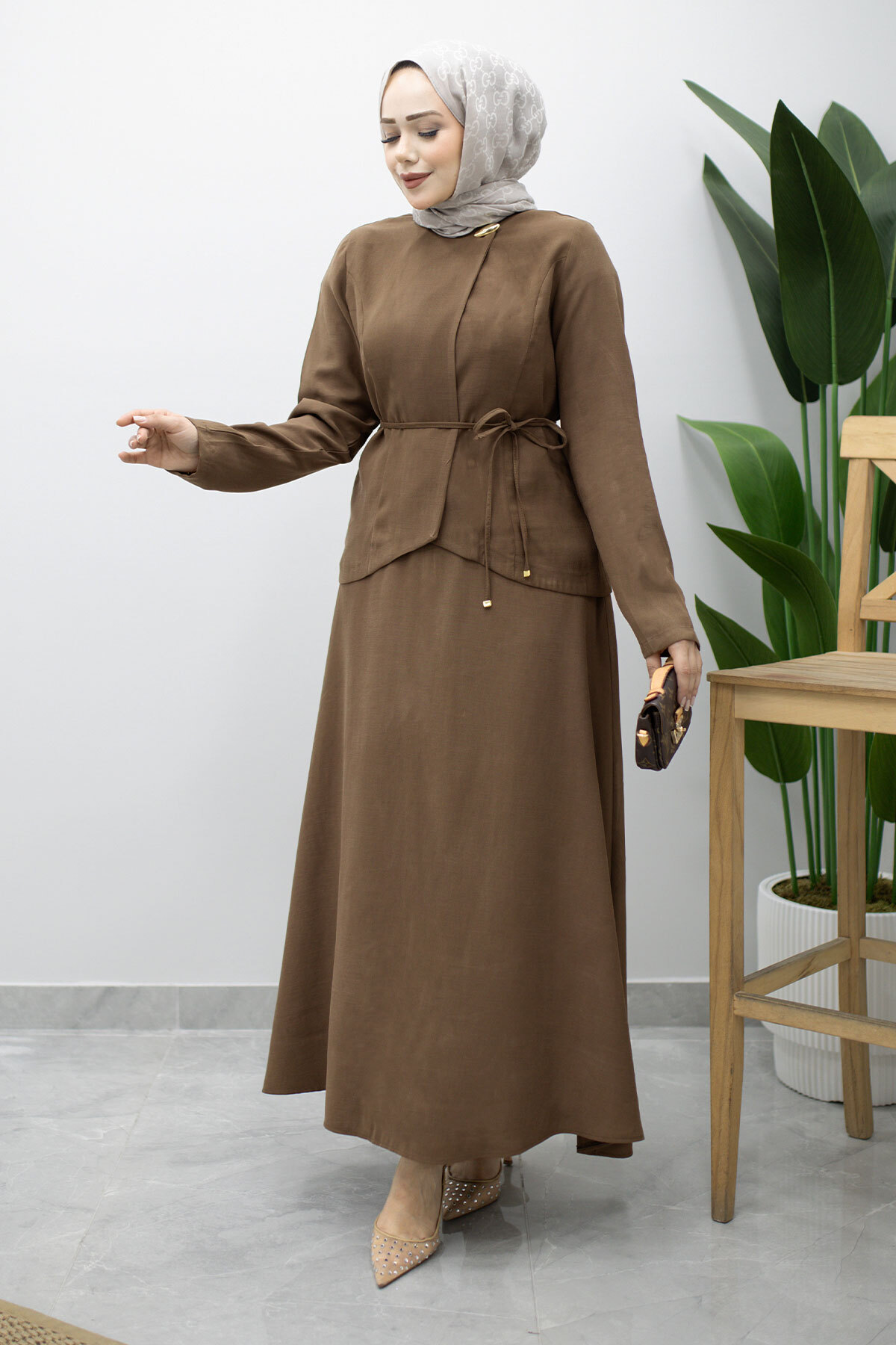 Dikiş Detaylı Düğmeli Etekli Takım TSD260201 Kahverengi