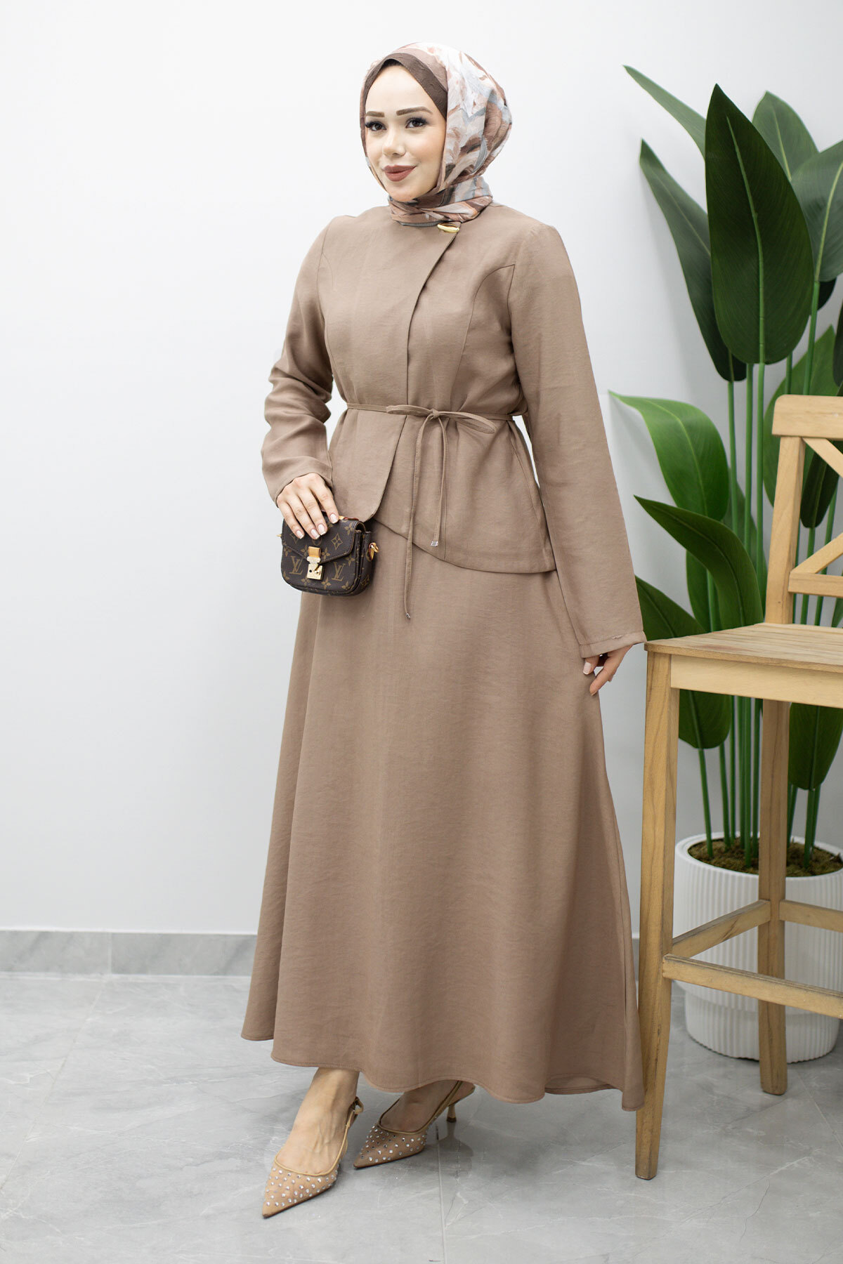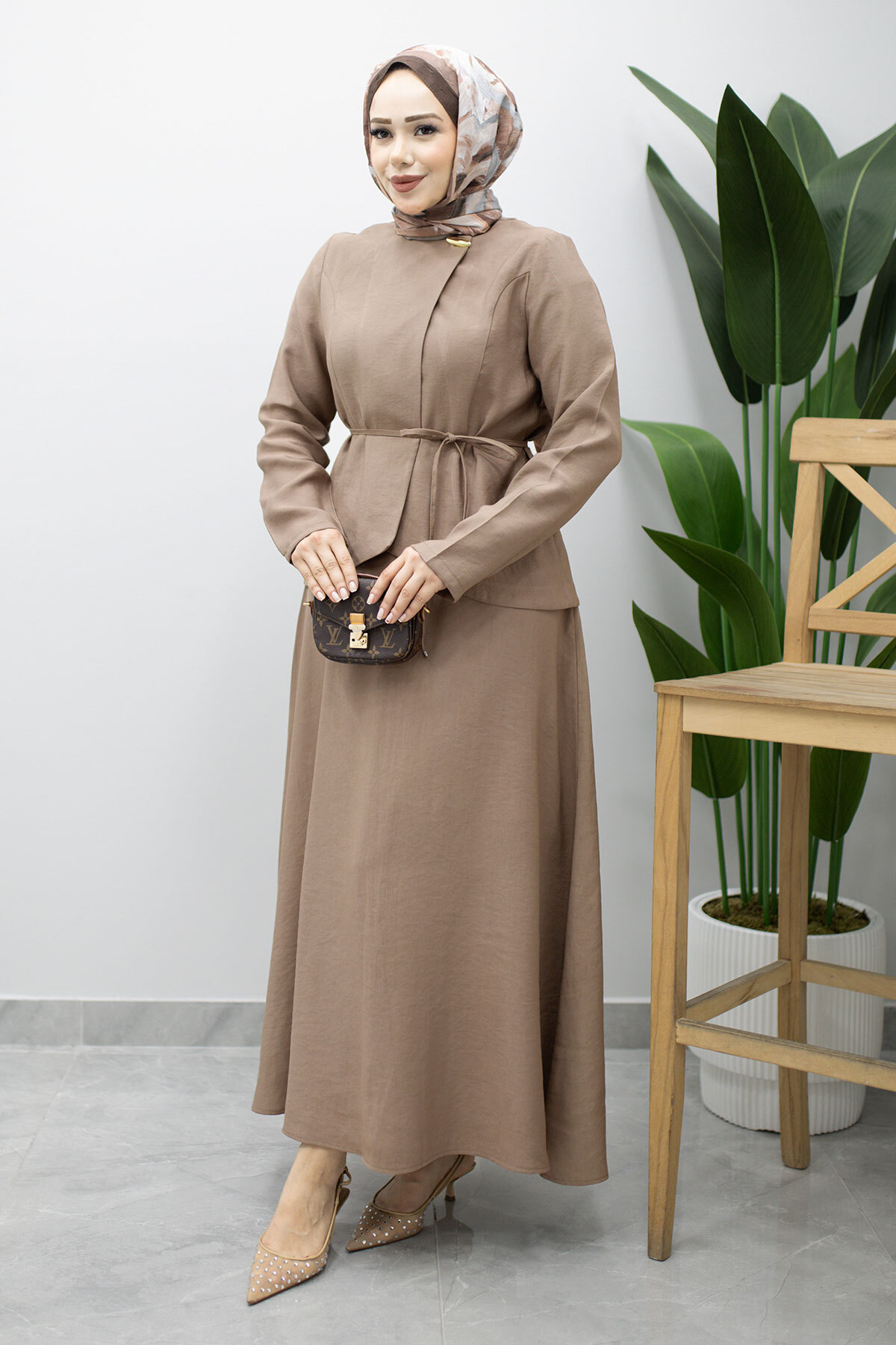 Dikiş Detaylı Düğmeli Etekli Takım TSD260201 Vizon