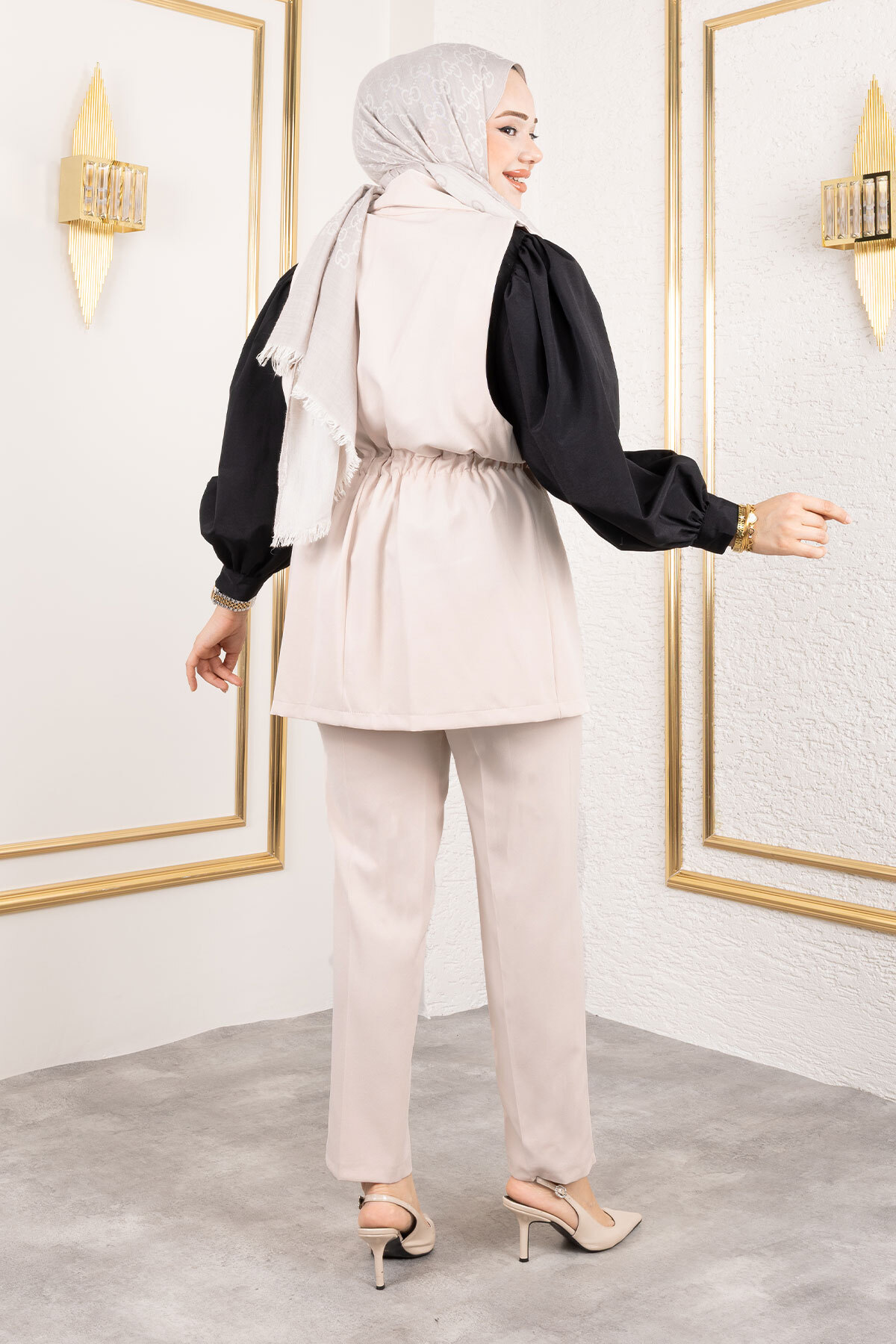 Düğme Detaylı Beli Lastikli Yelekli Takım TSD250190 Bej Özellikleri