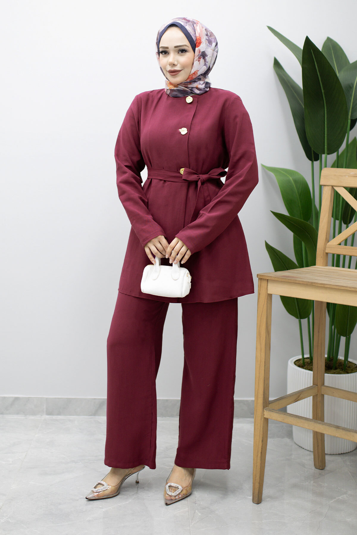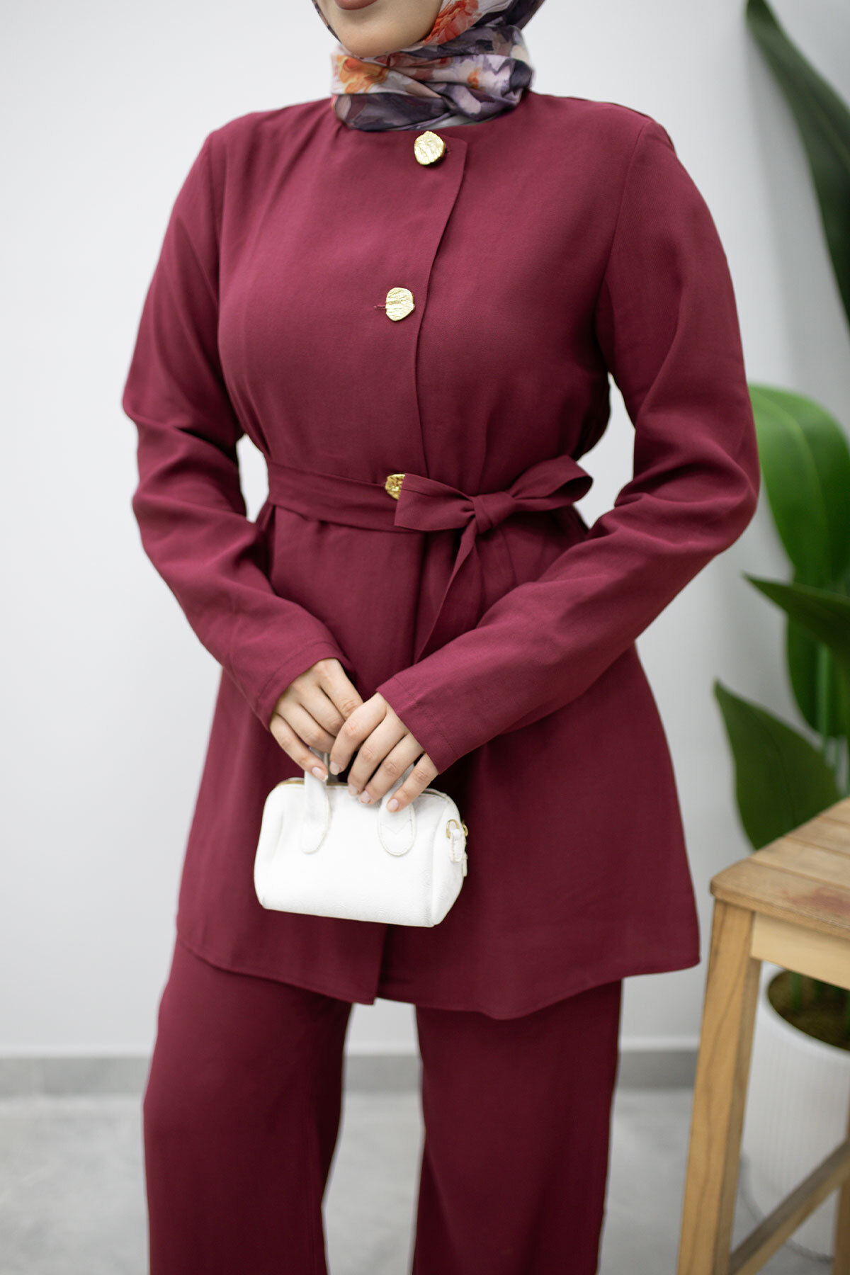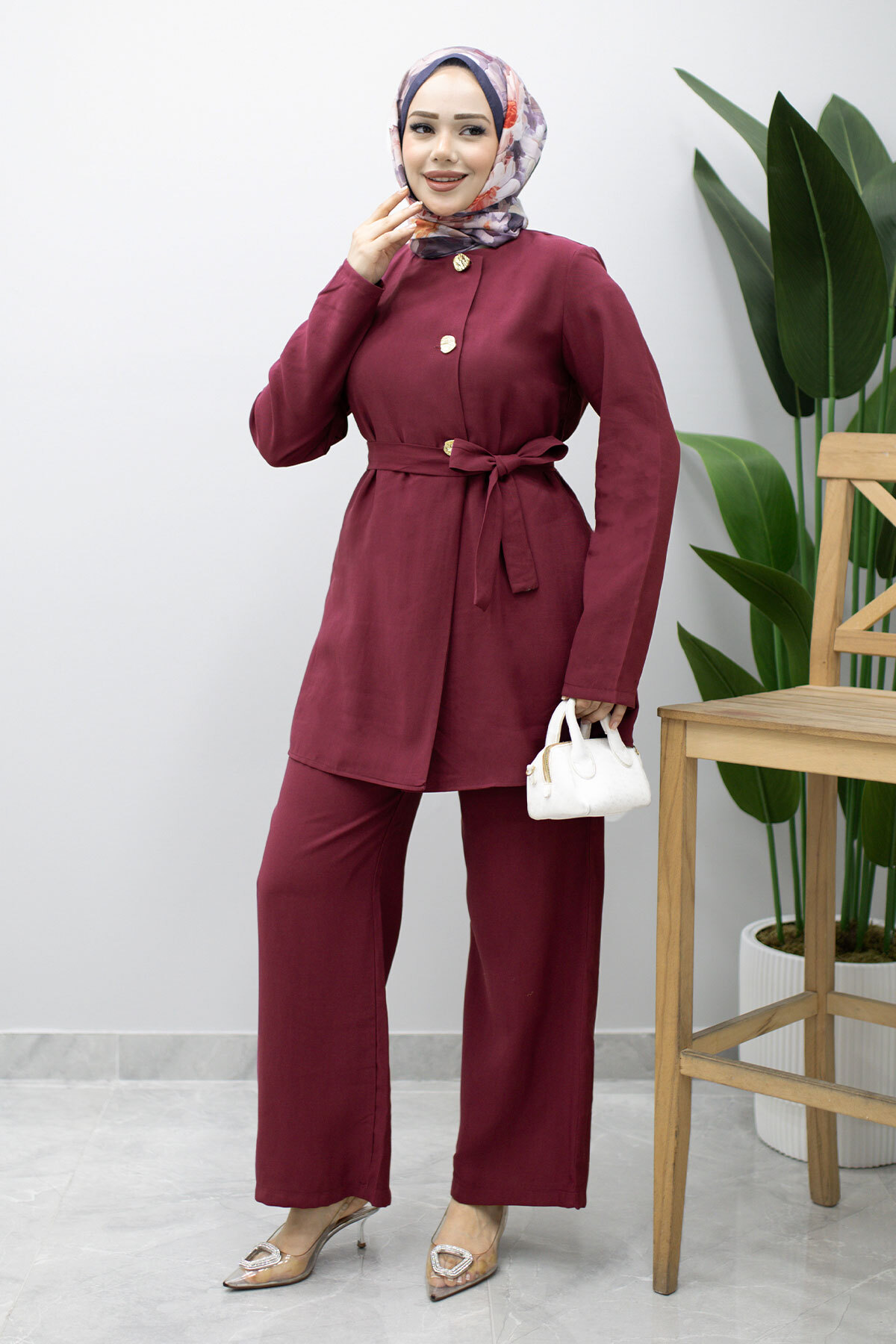 Ürün Özelliği : Yeni sezon Düğmeli Beli Kuşaklı İkili Takım modelidir.