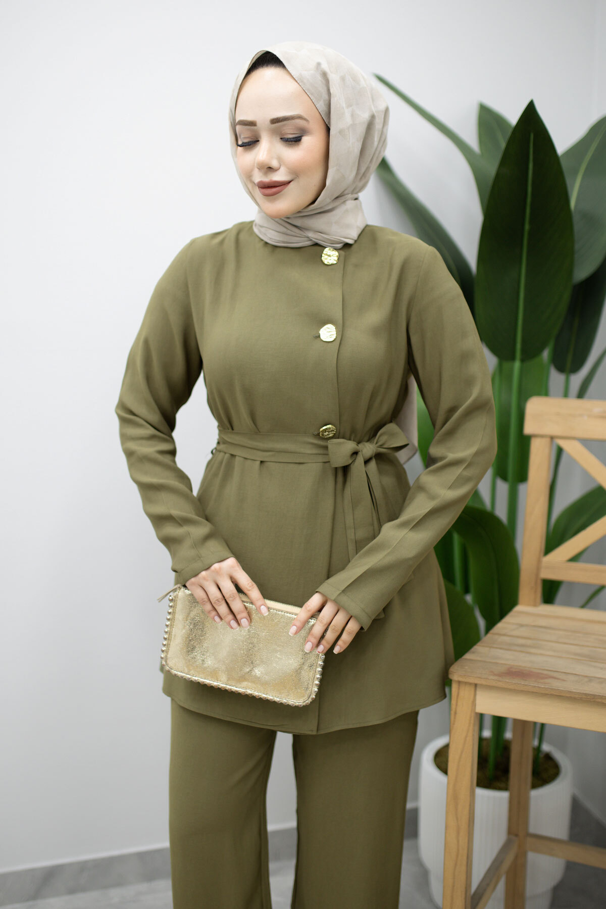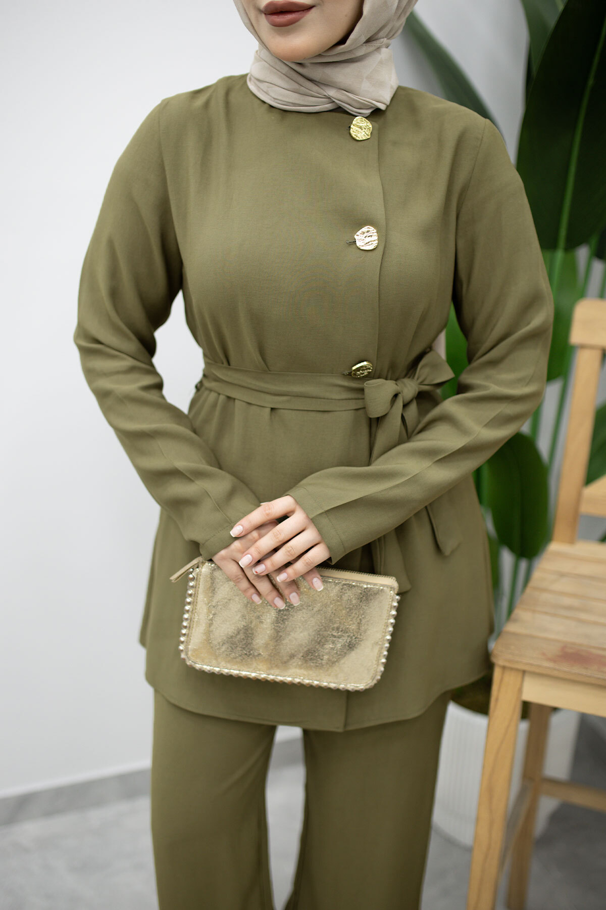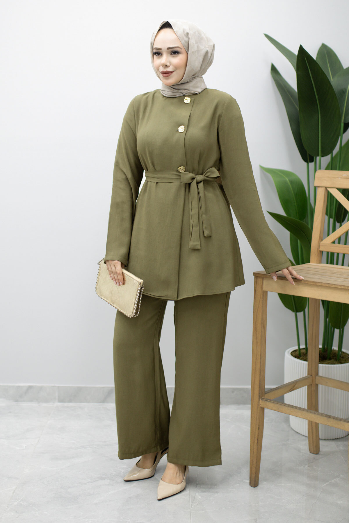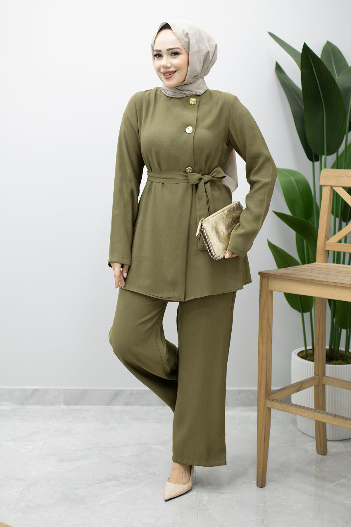 Düğmeli Beli Kuşaklı İkili Takım TSD260200 Haki