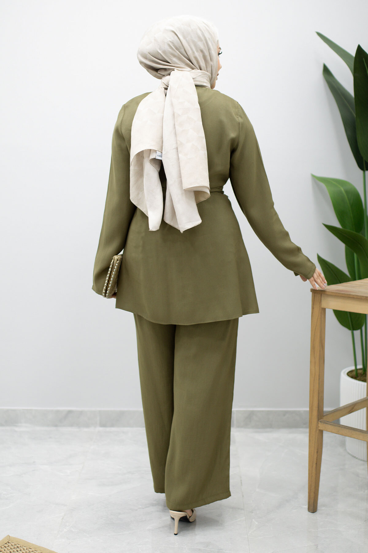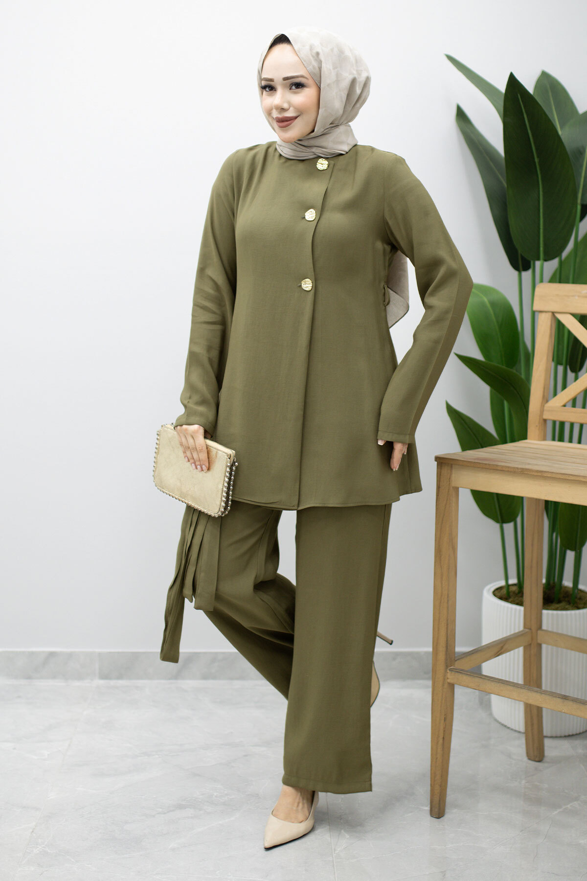 Düğmeli Beli Kuşaklı İkili Takım TSD260200 Haki Özellikleri