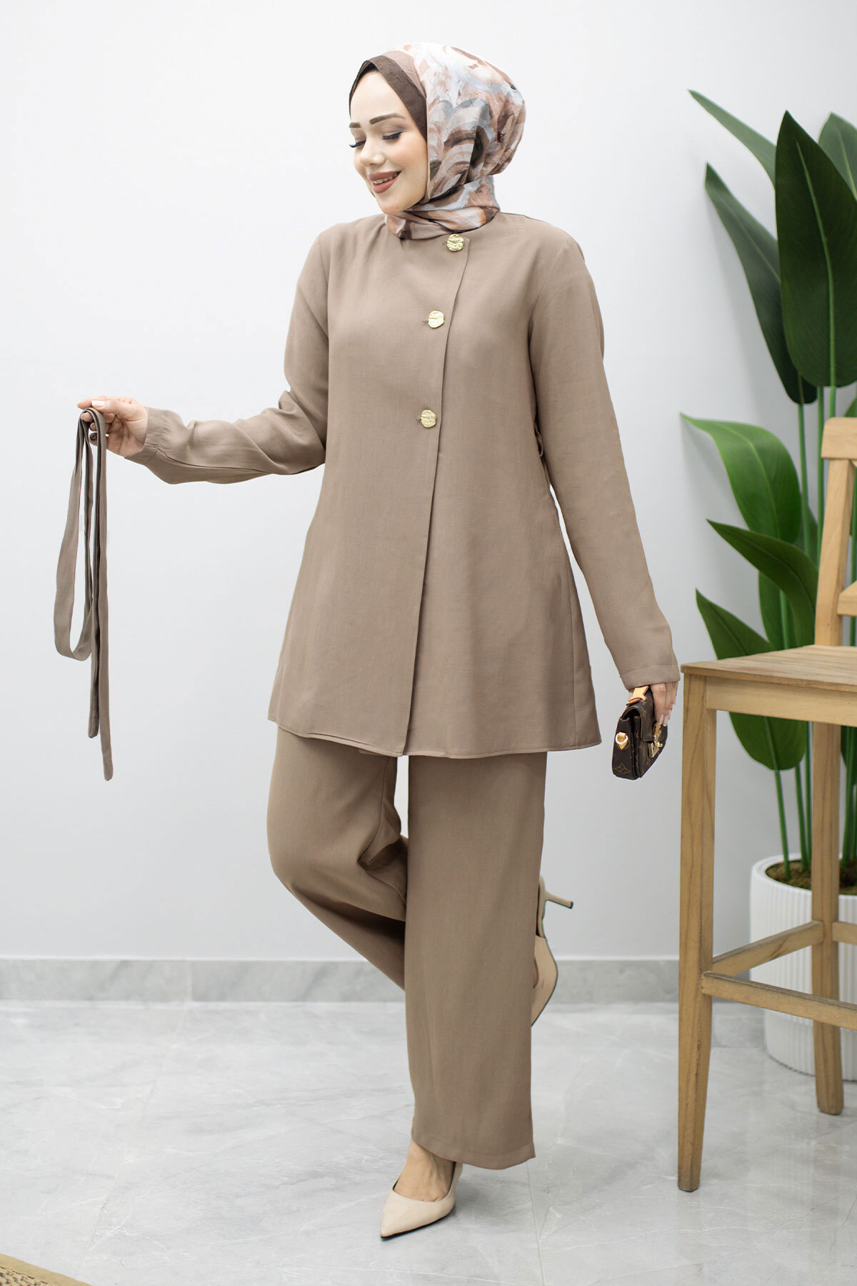 Düğmeli Beli Kuşaklı İkili Takım TSD260200 Vizon