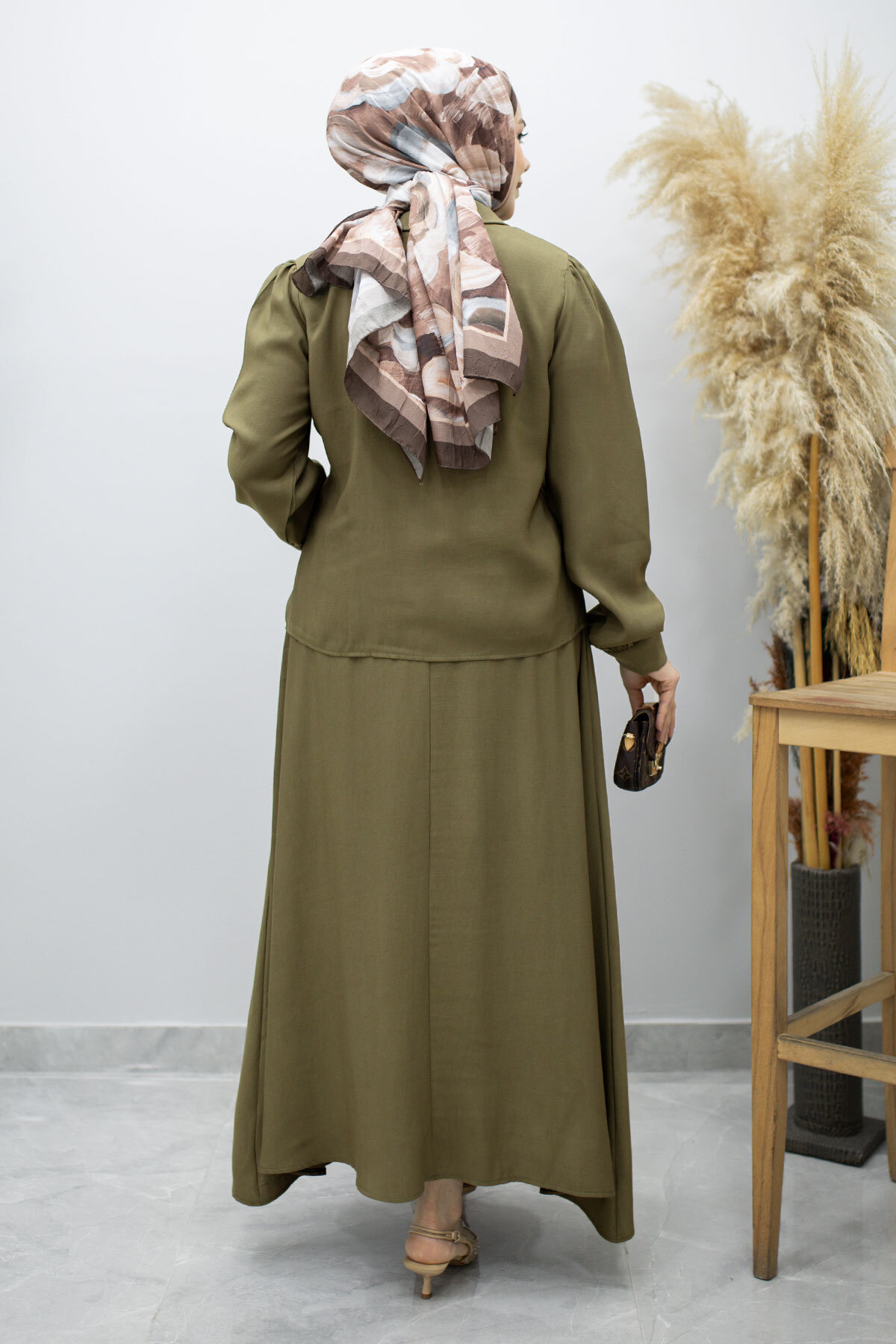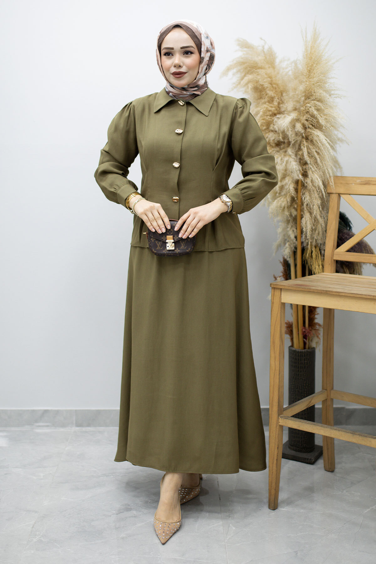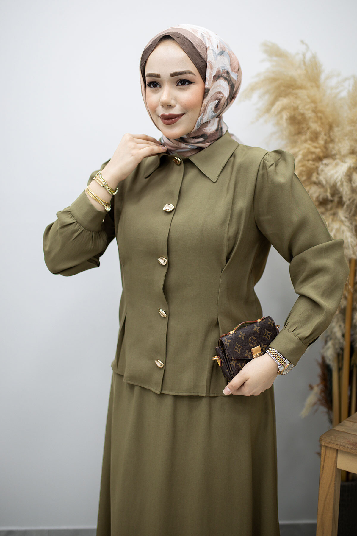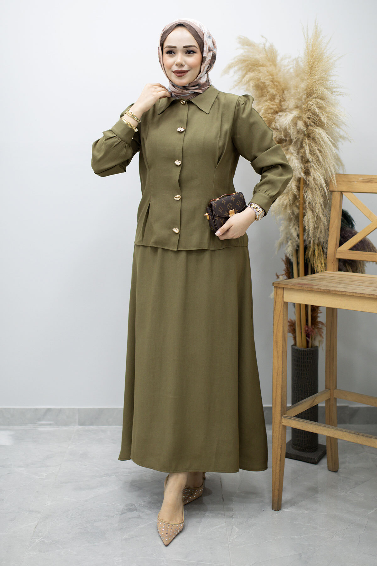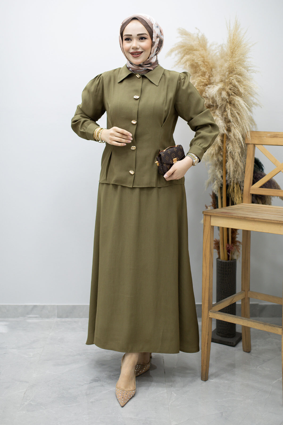 Düğmeli Pens Detaylı Etekli Takım TSD260188 Haki
