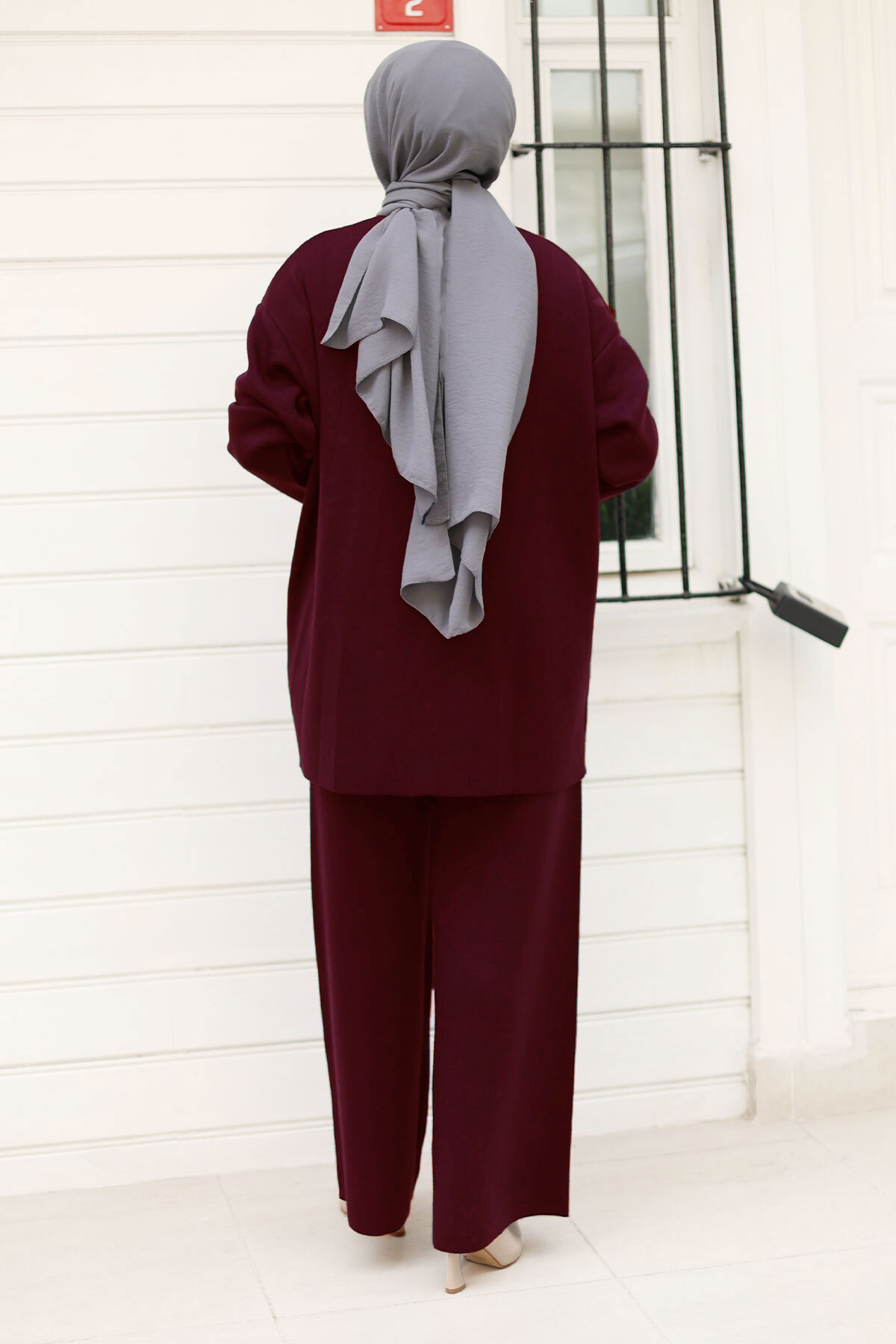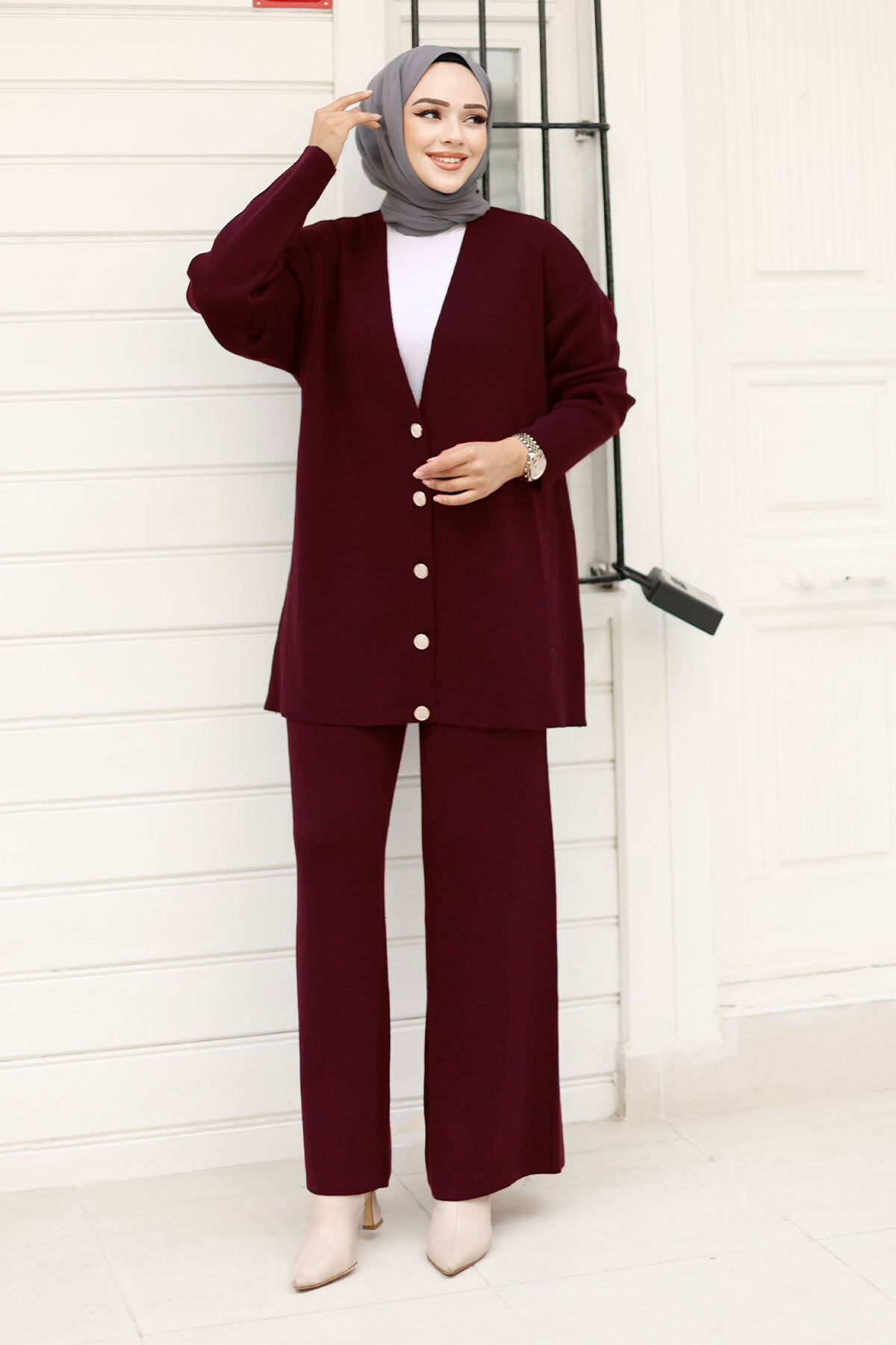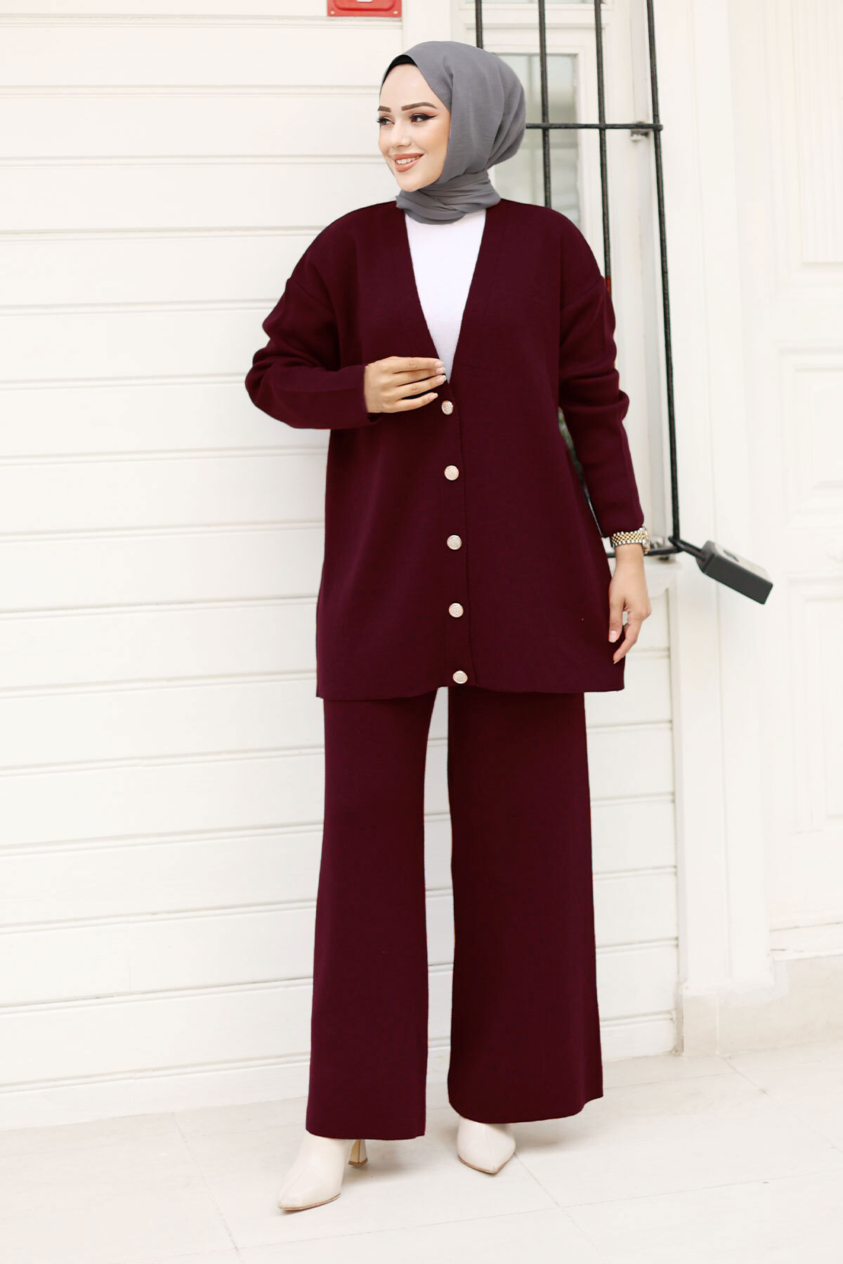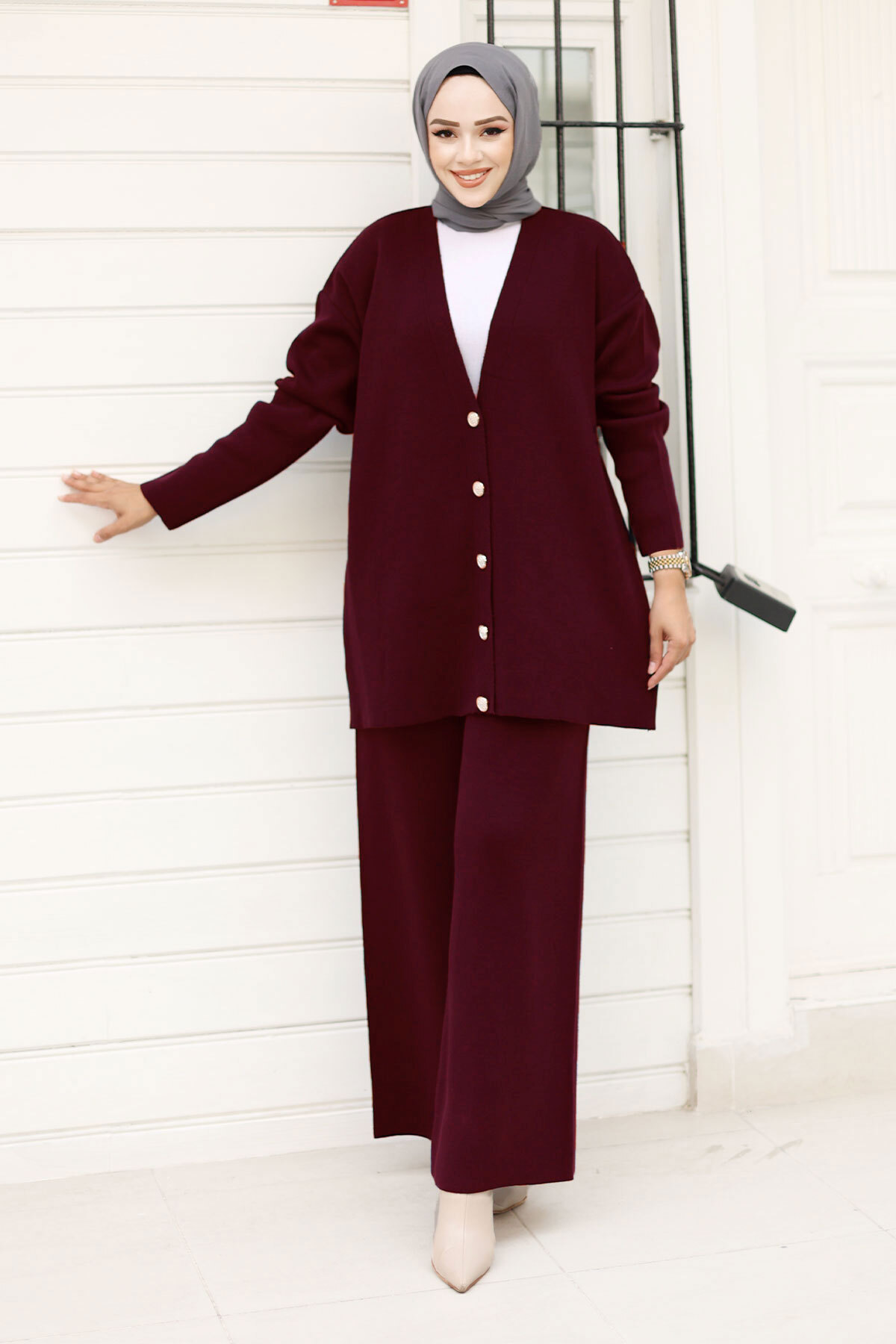 Düğmesi Taşlı Triko Hırka Takım TSD240932 Bordo  Özellikleri