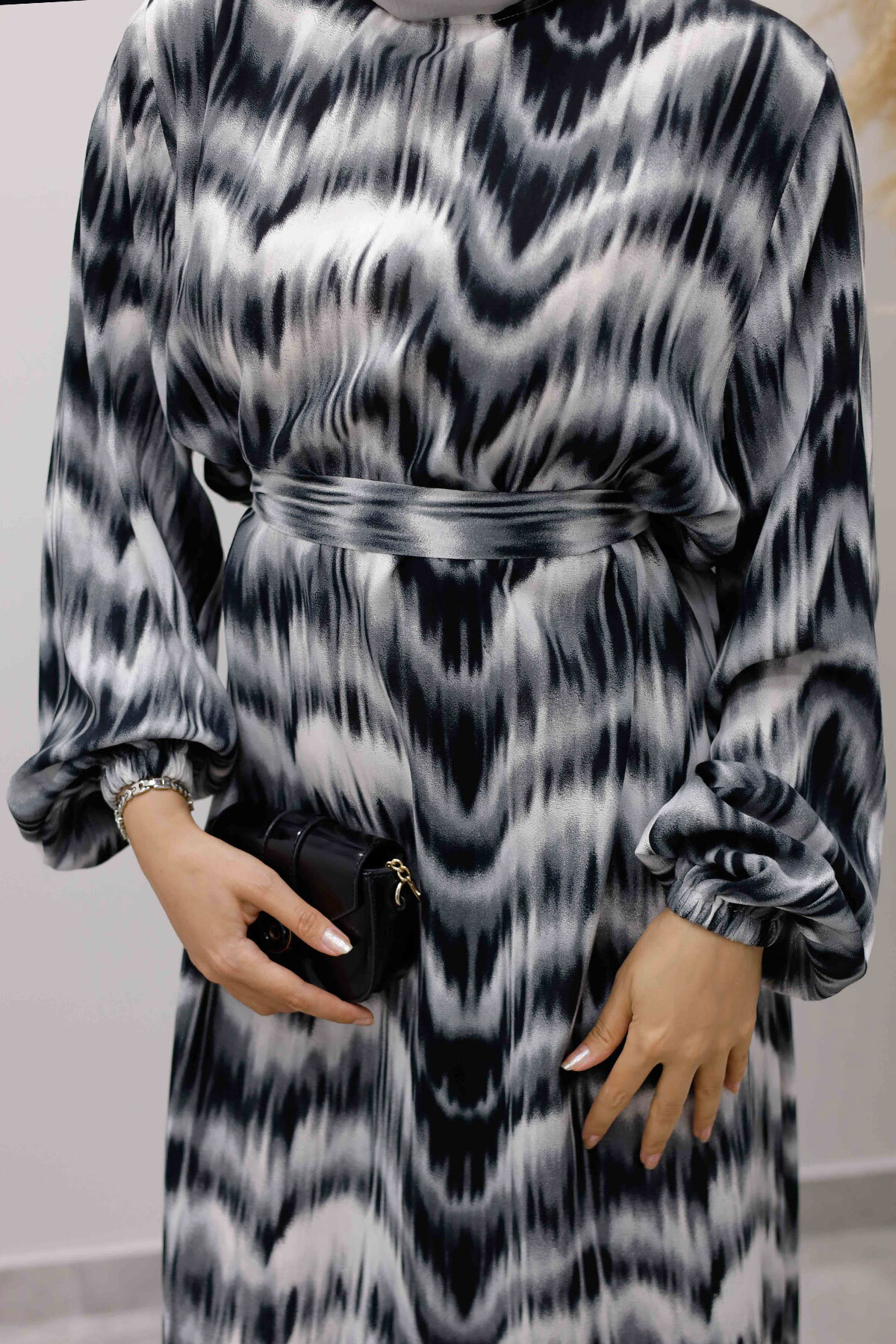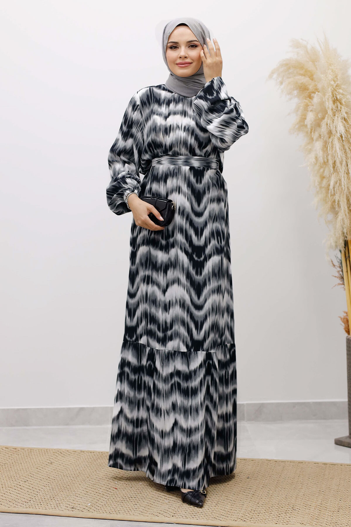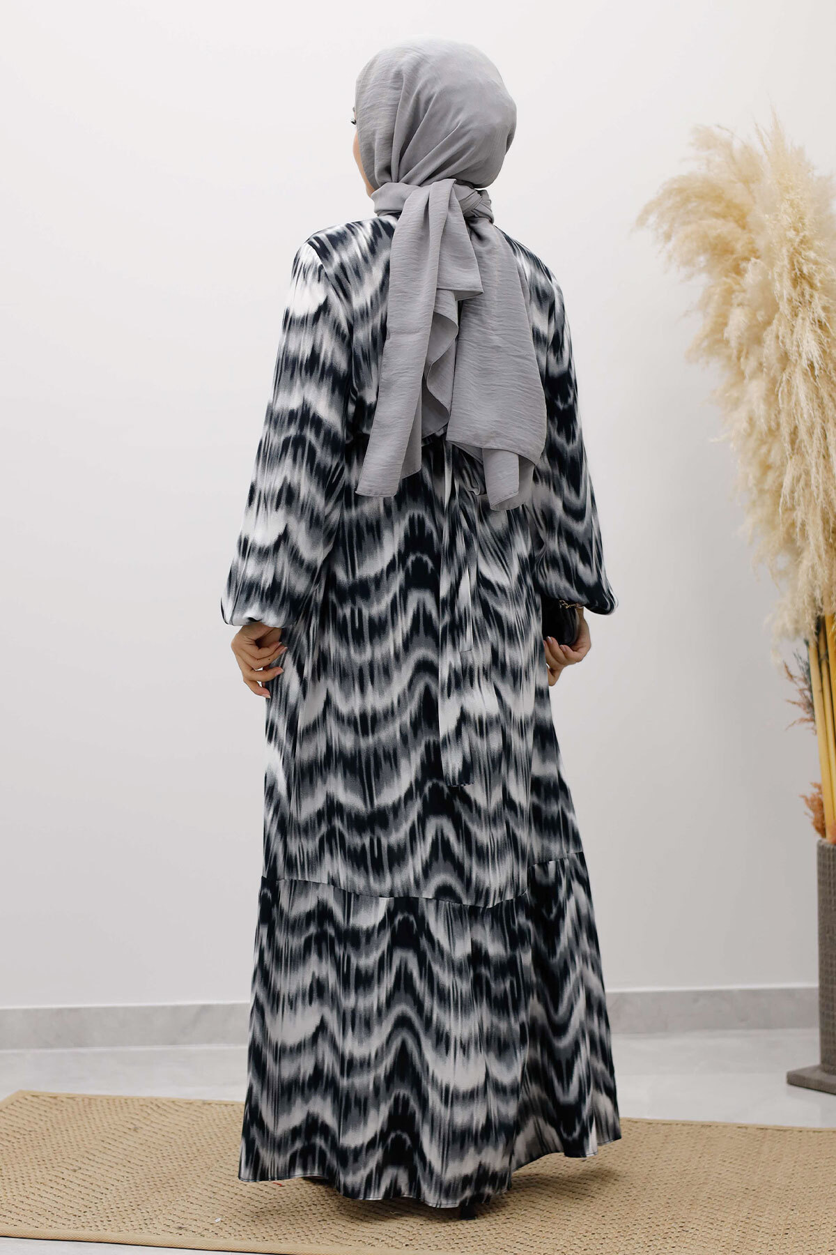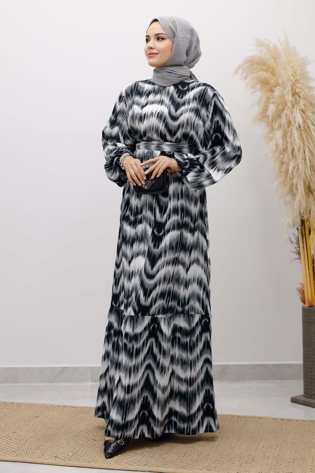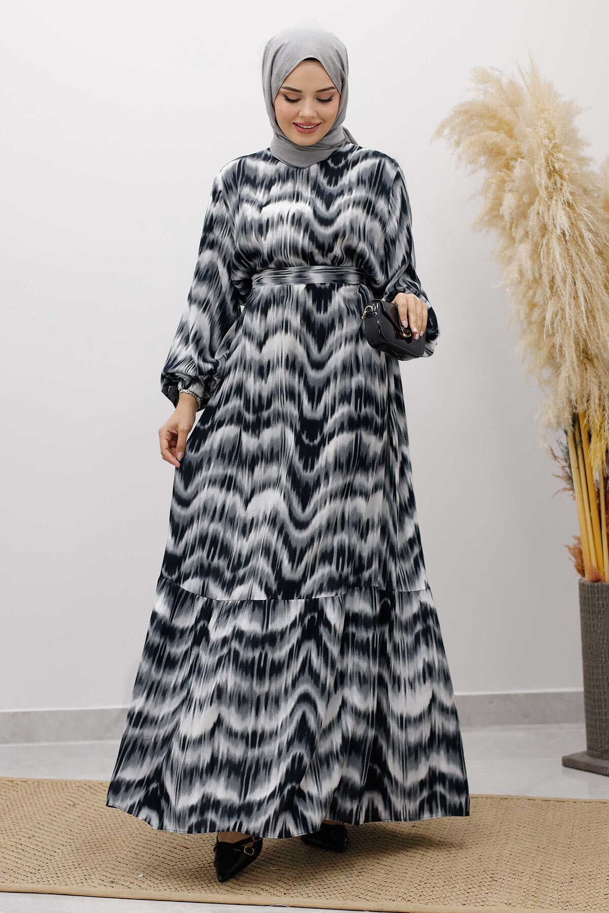 Eteği Volanlı Sulu Boya Desenli Viskon Elbise TSD250234 Siyah