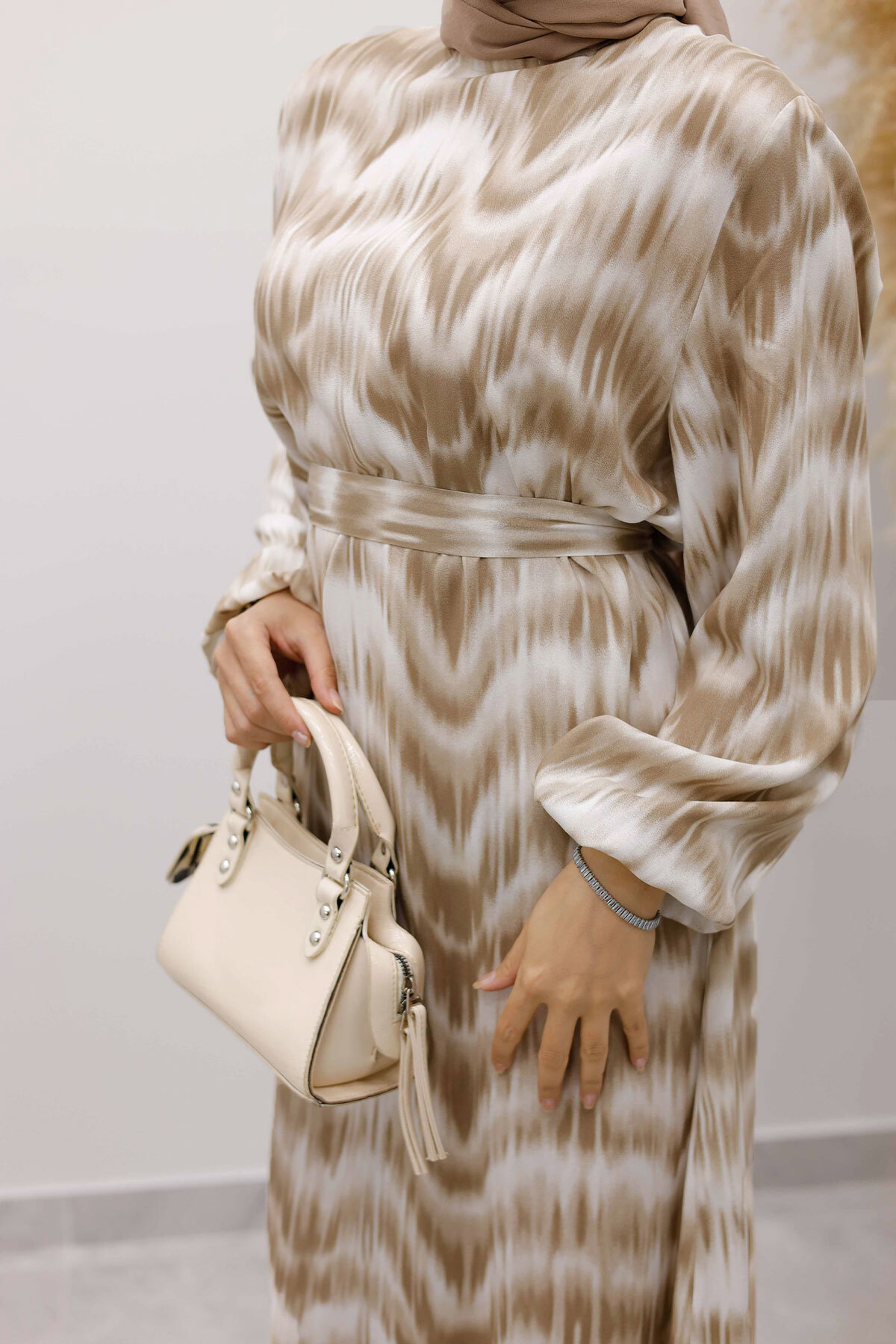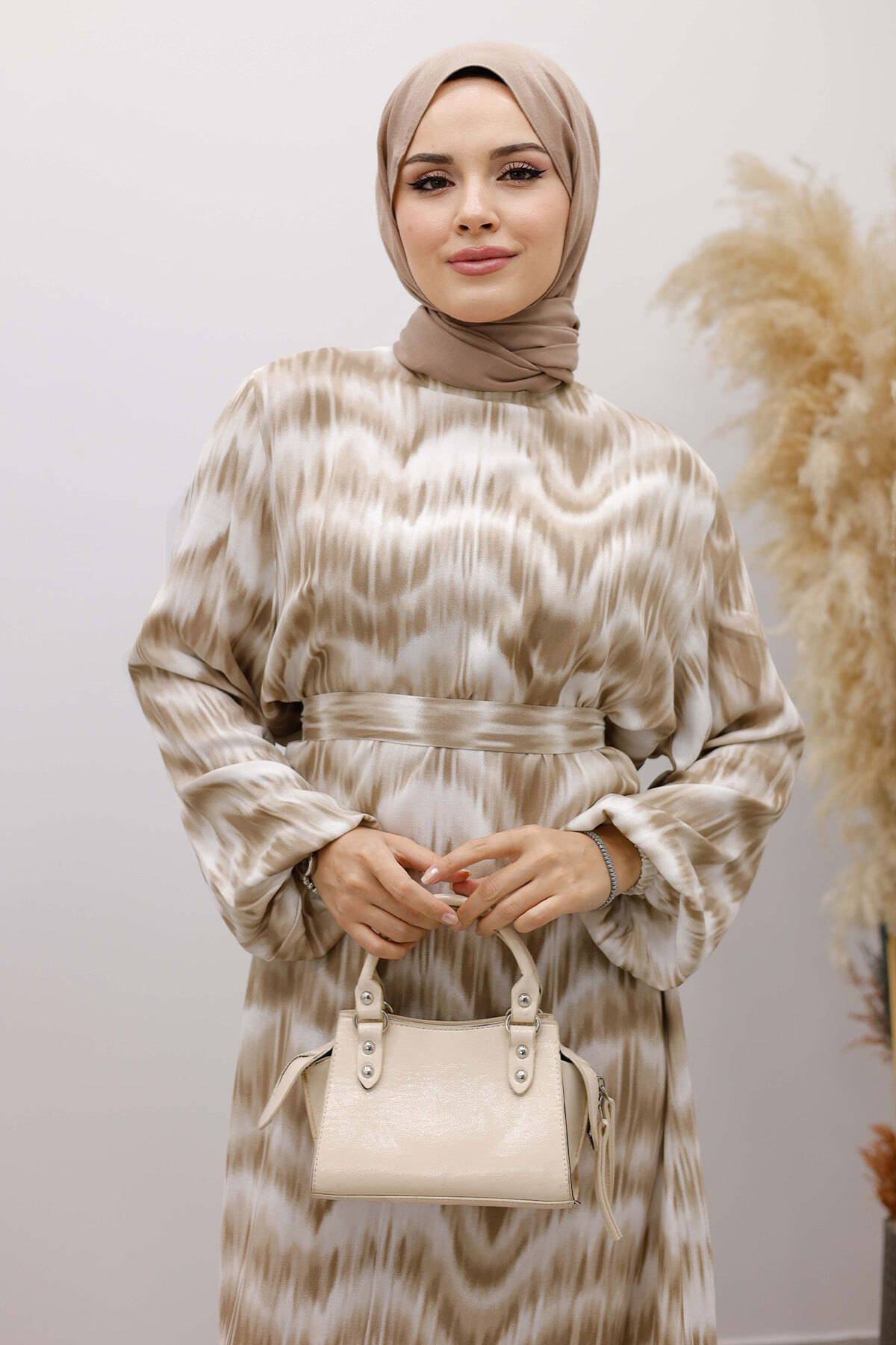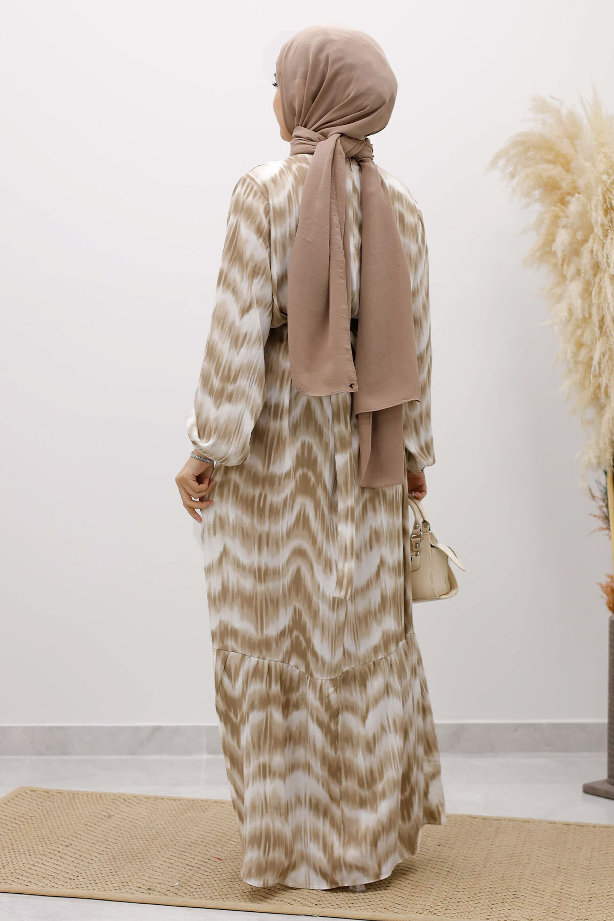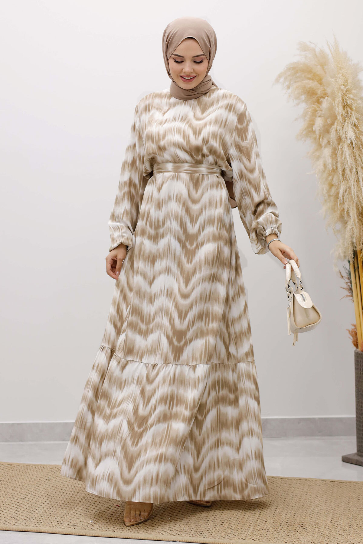 Eteği Volanlı Sulu Boya Desenli Viskon Elbise TSD250234 Vizon