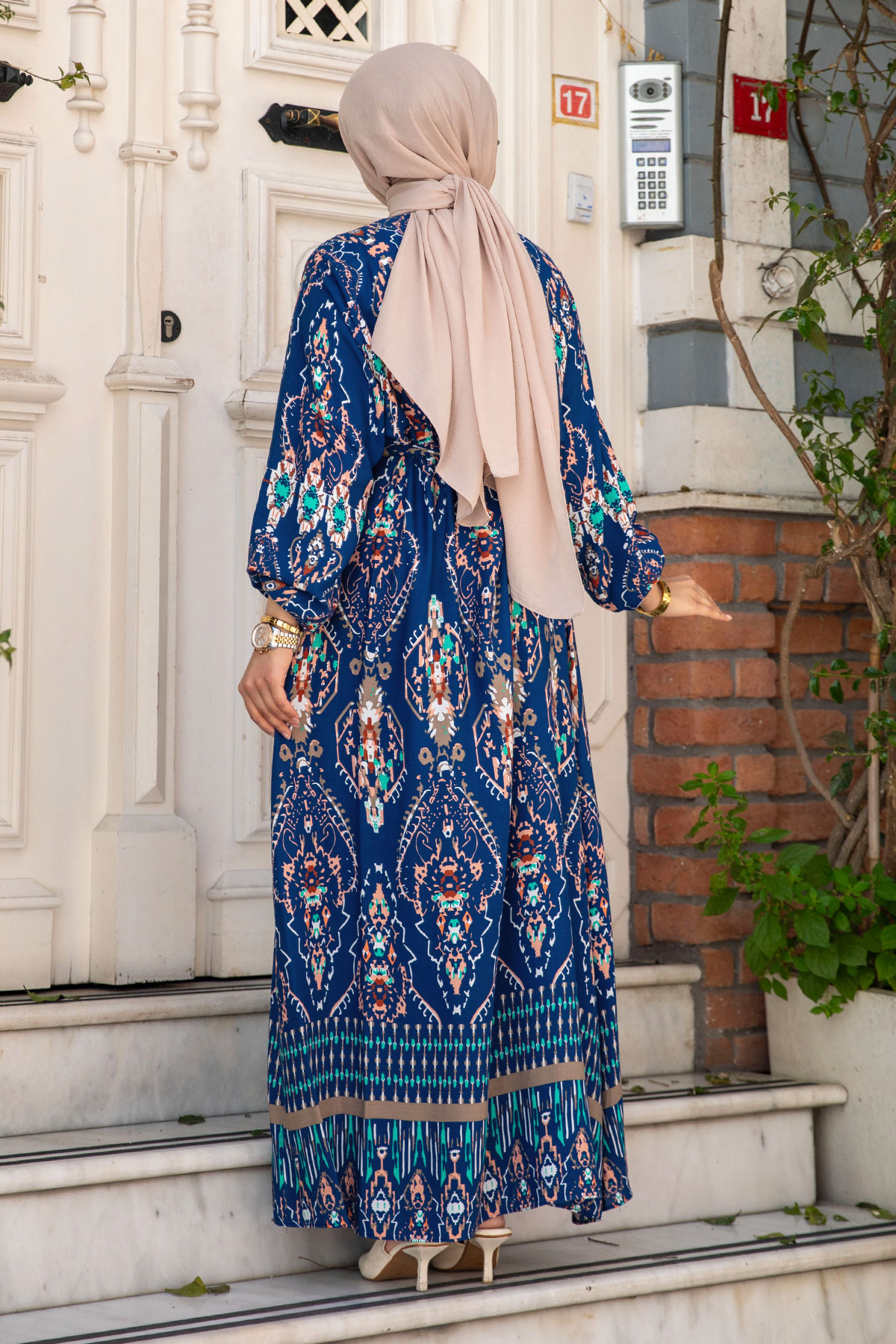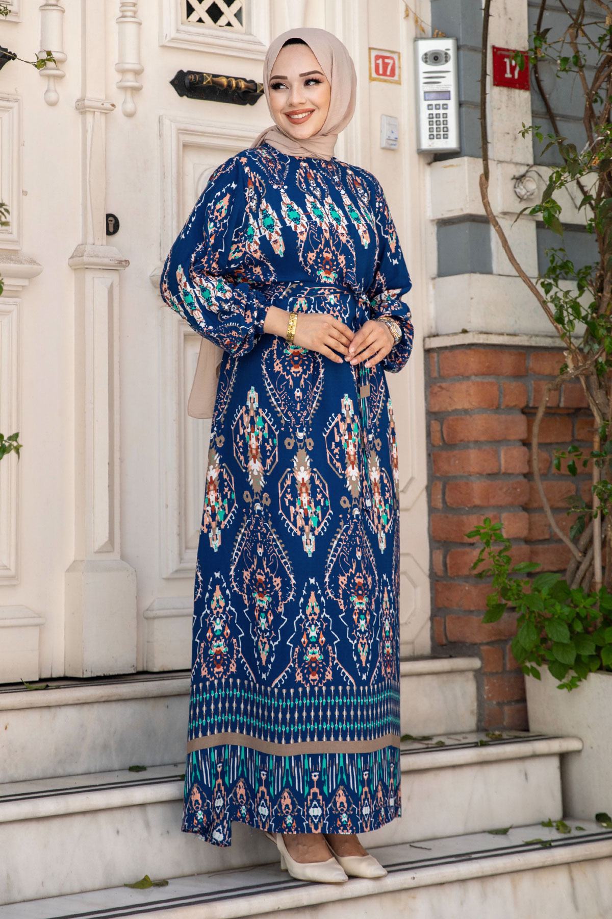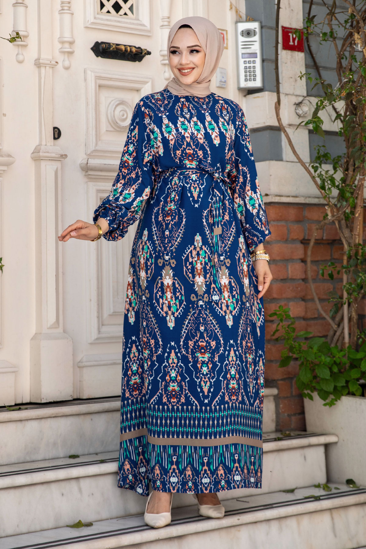 Etnik Desenli Beli Kuşaklı Viskon Elbise TSD240505 İndigo Özellikleri