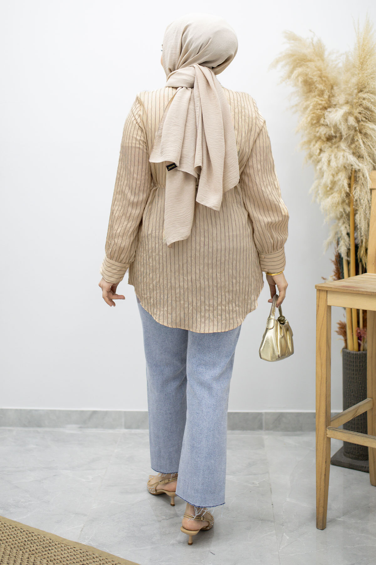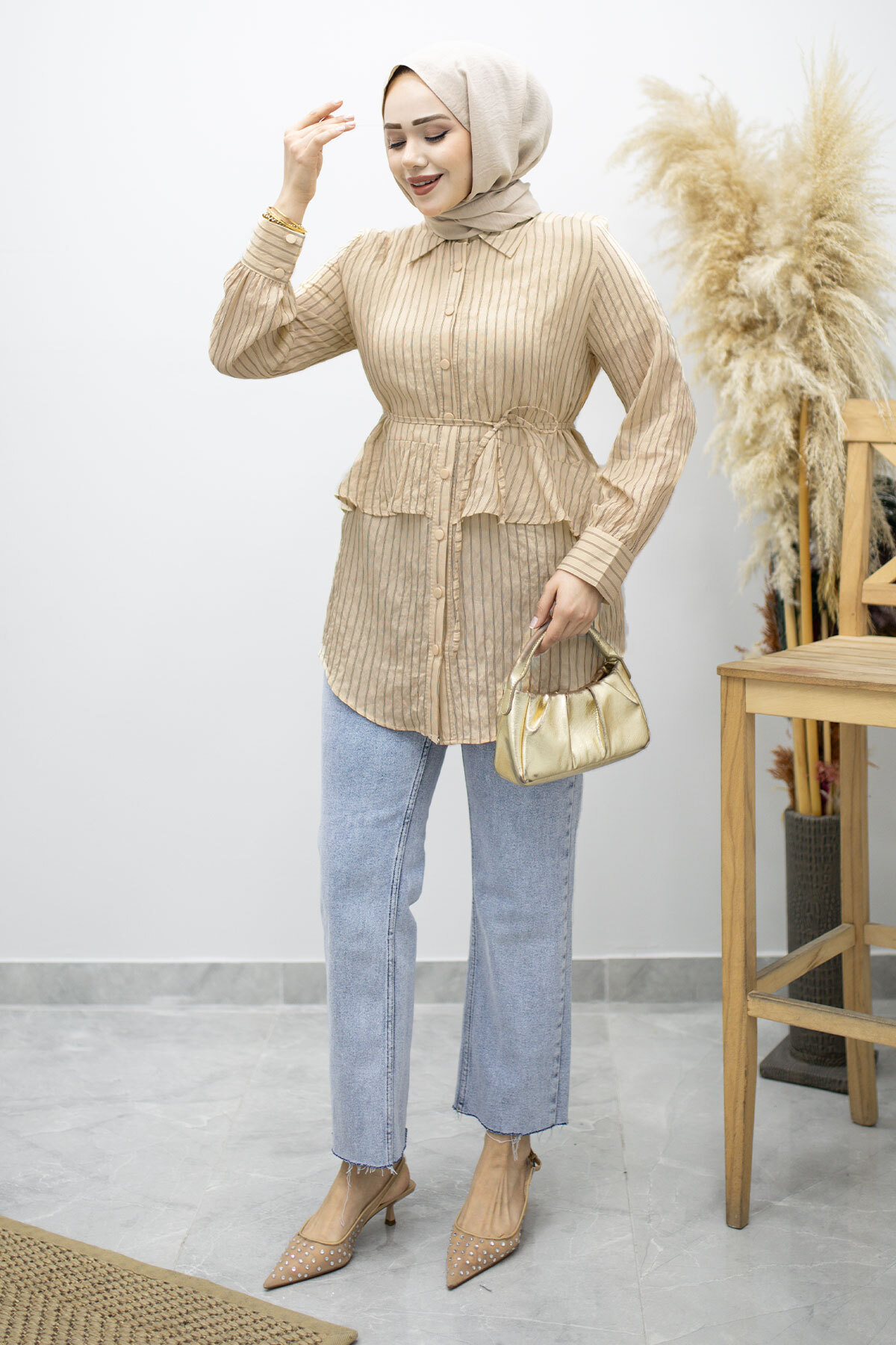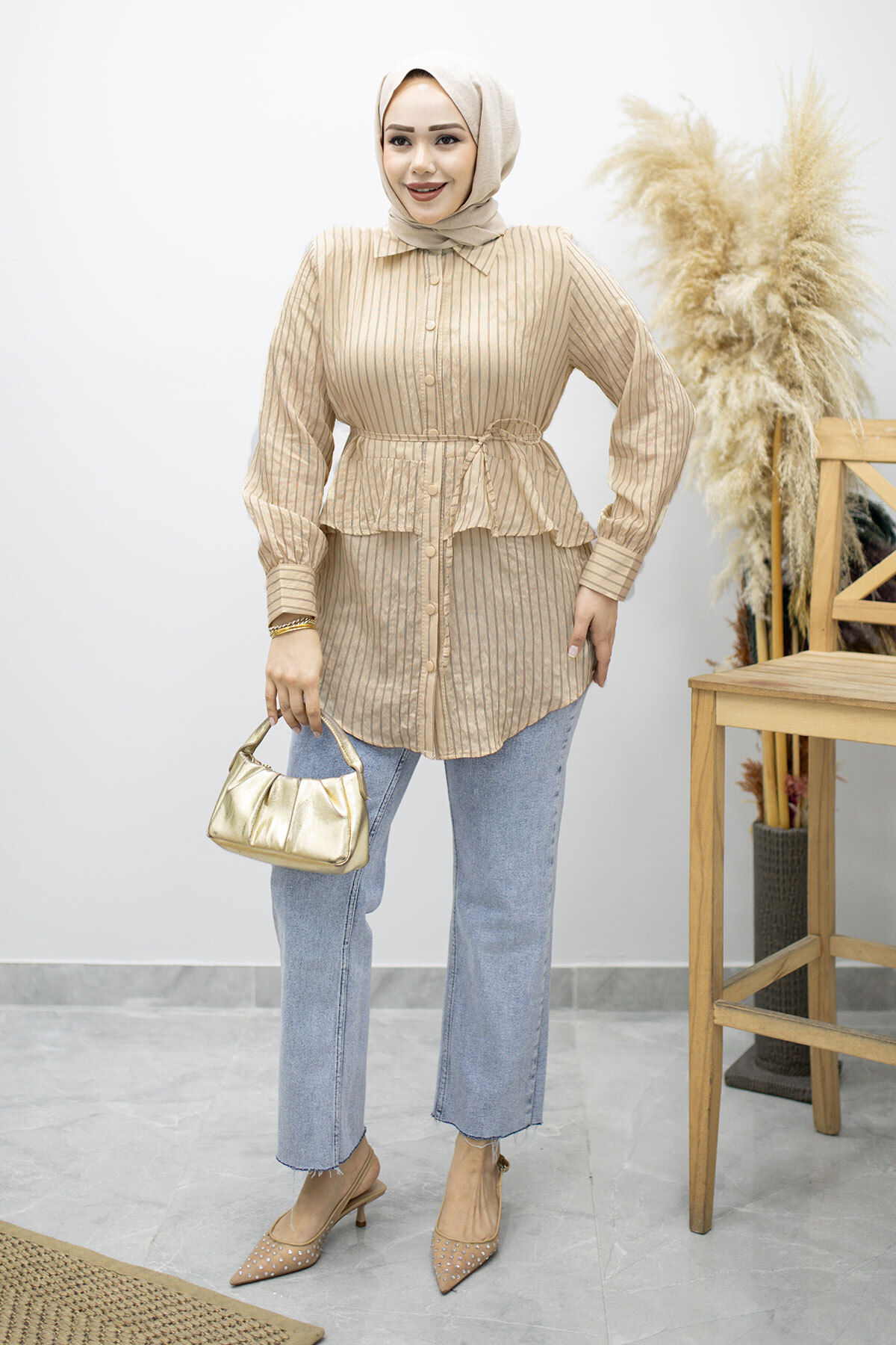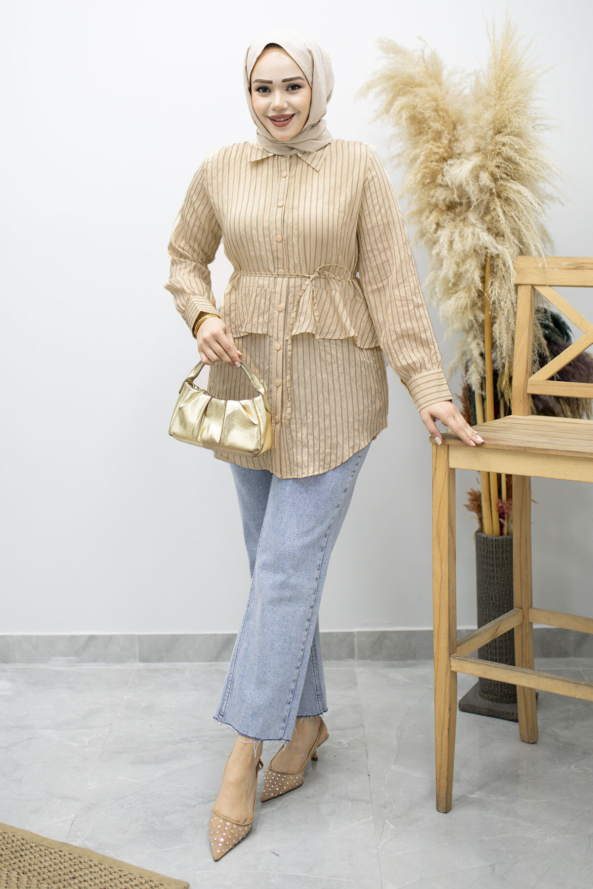 Fırfır Detaylı Çizgili Gömlek TSD260160 Bej