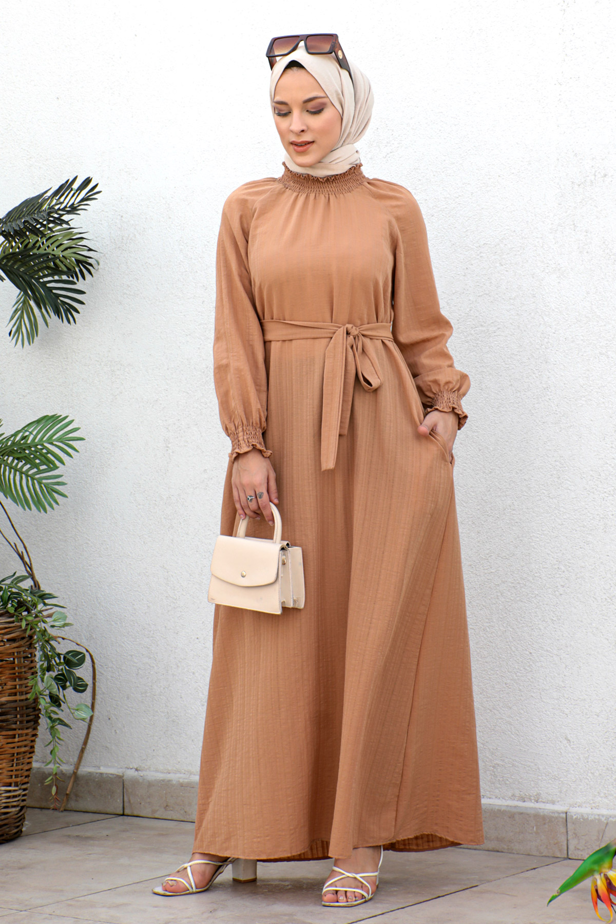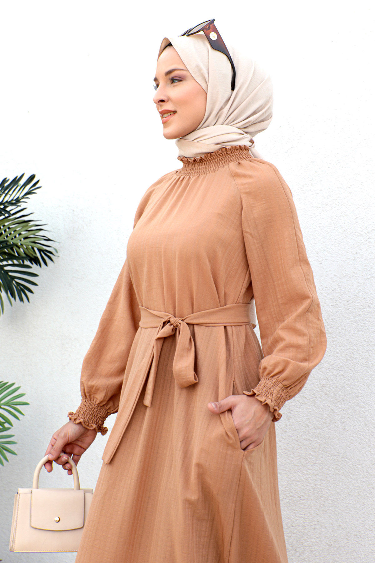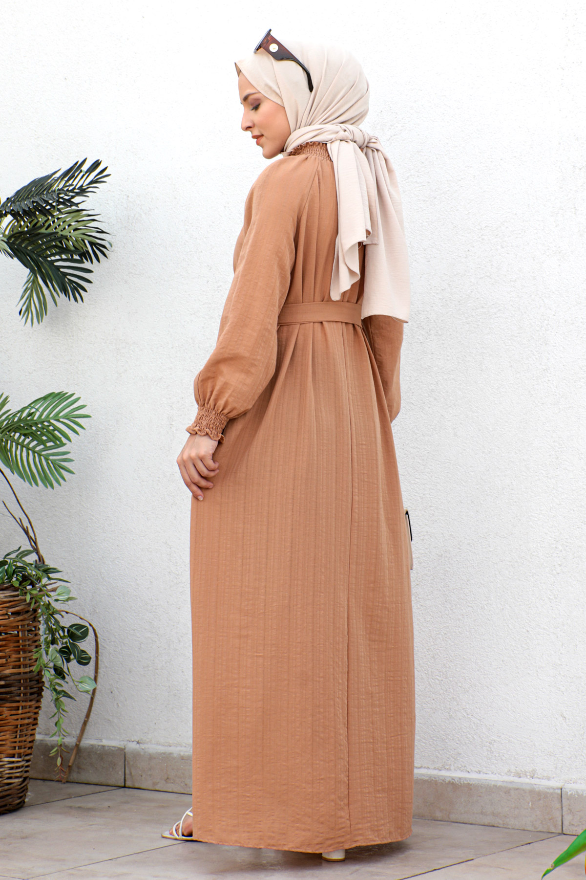 Gipe Detaylı Tesettür Elbise TSD221204 Taba