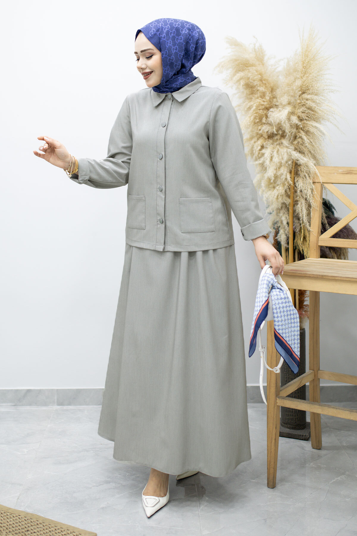 Gömleği Cepli Etekli Takım TSD260158 Açık Gri