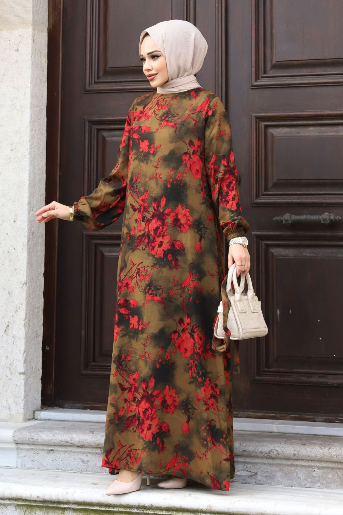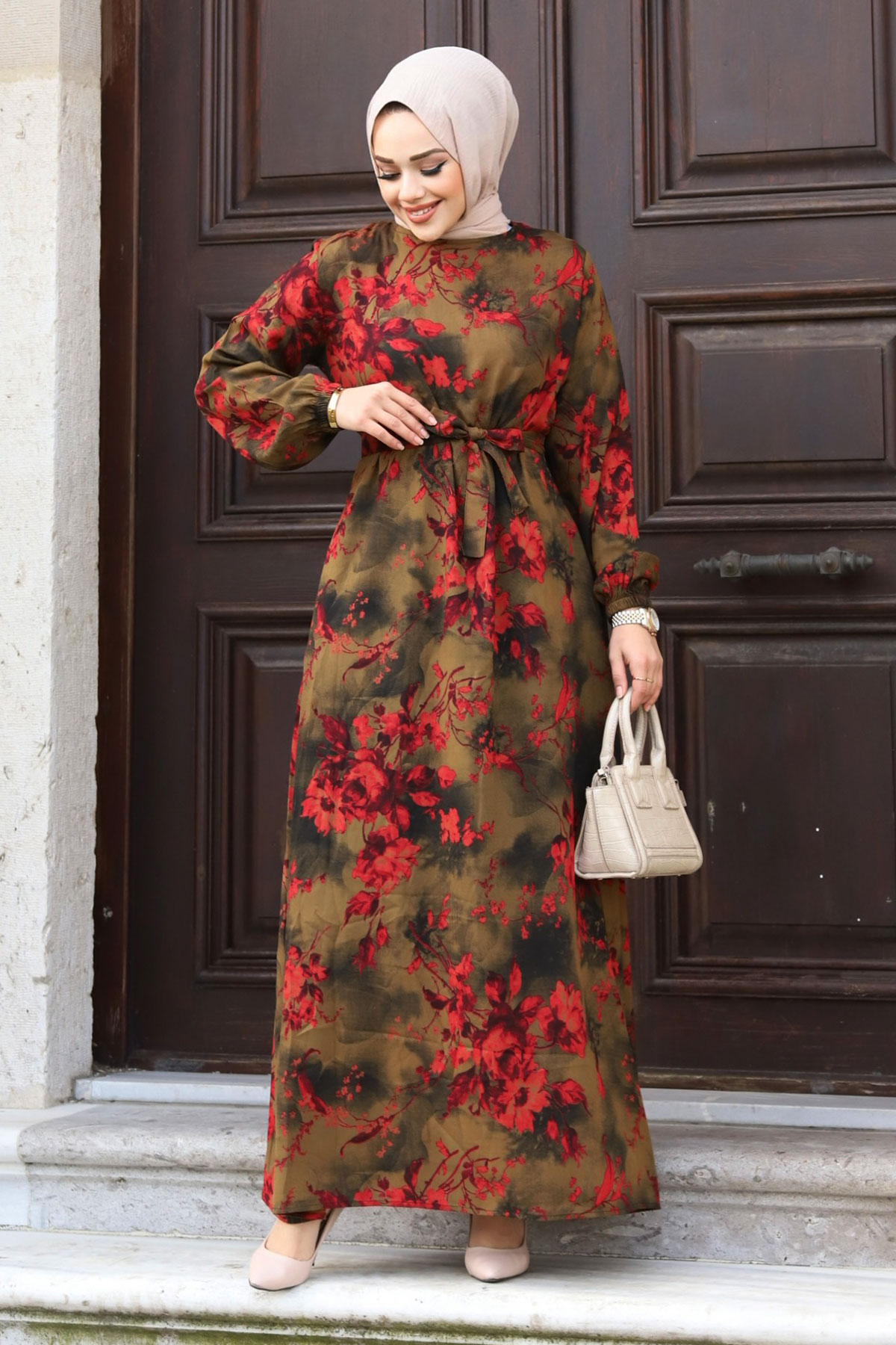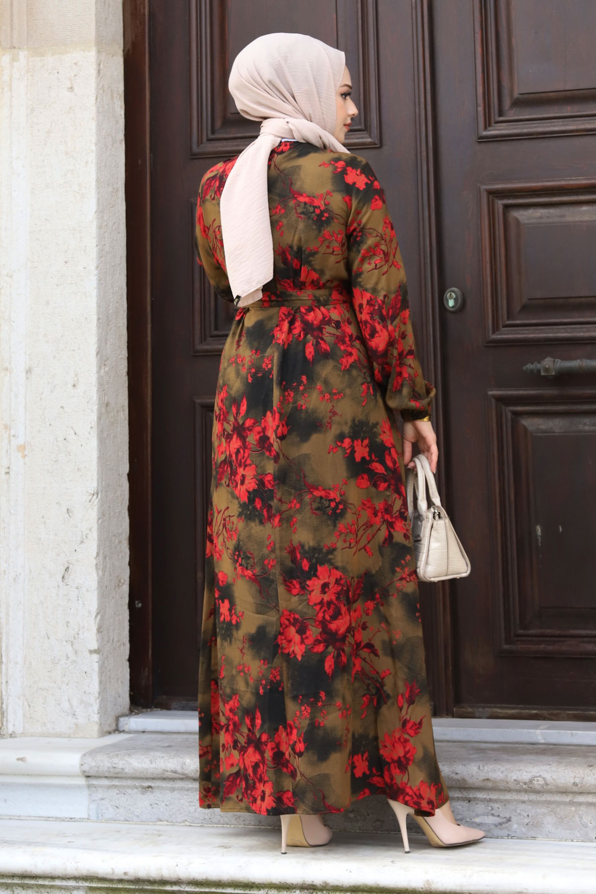 Gül Desenli Beli Kuşaklı Elbise TSD240207 Haki