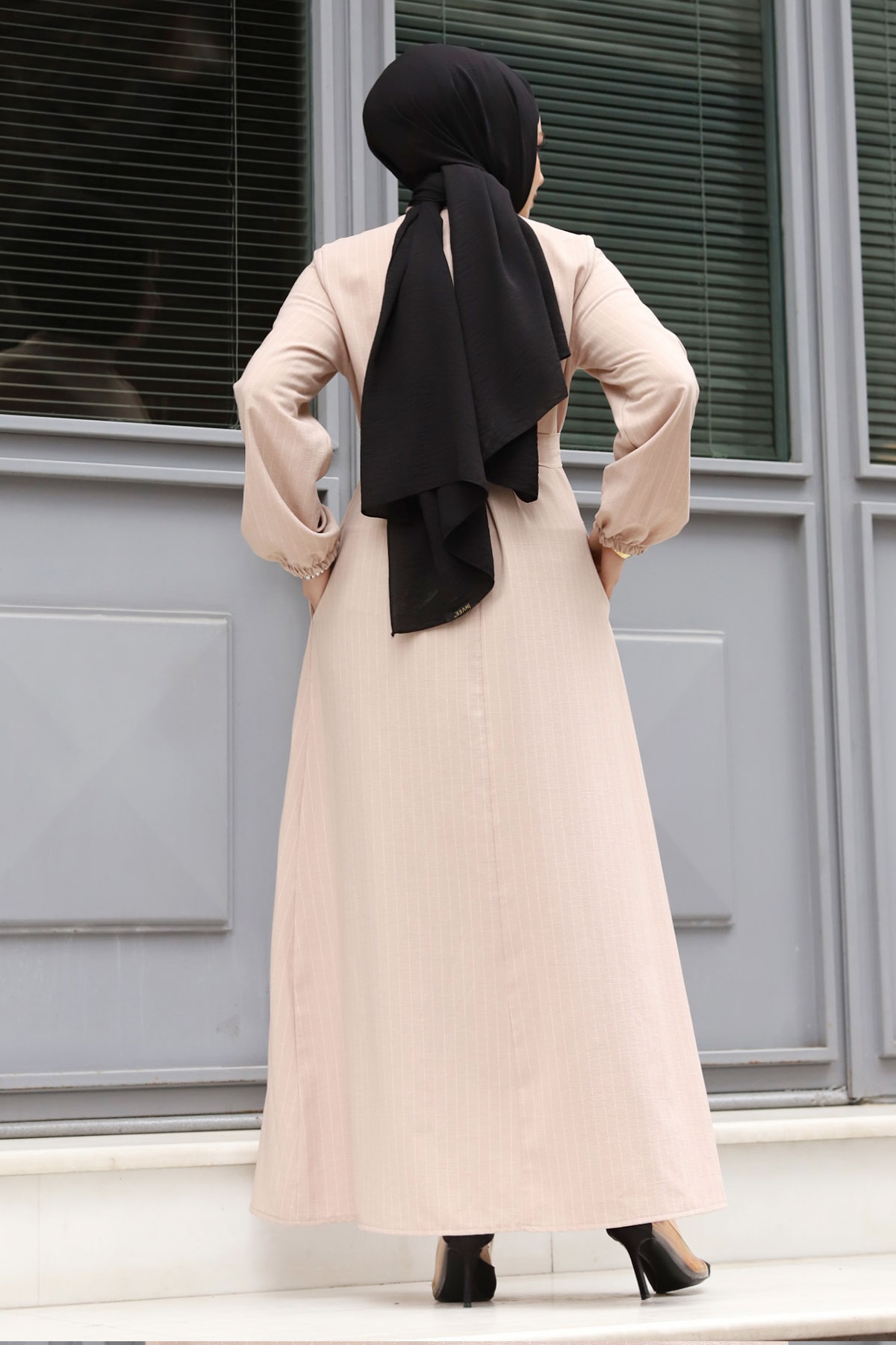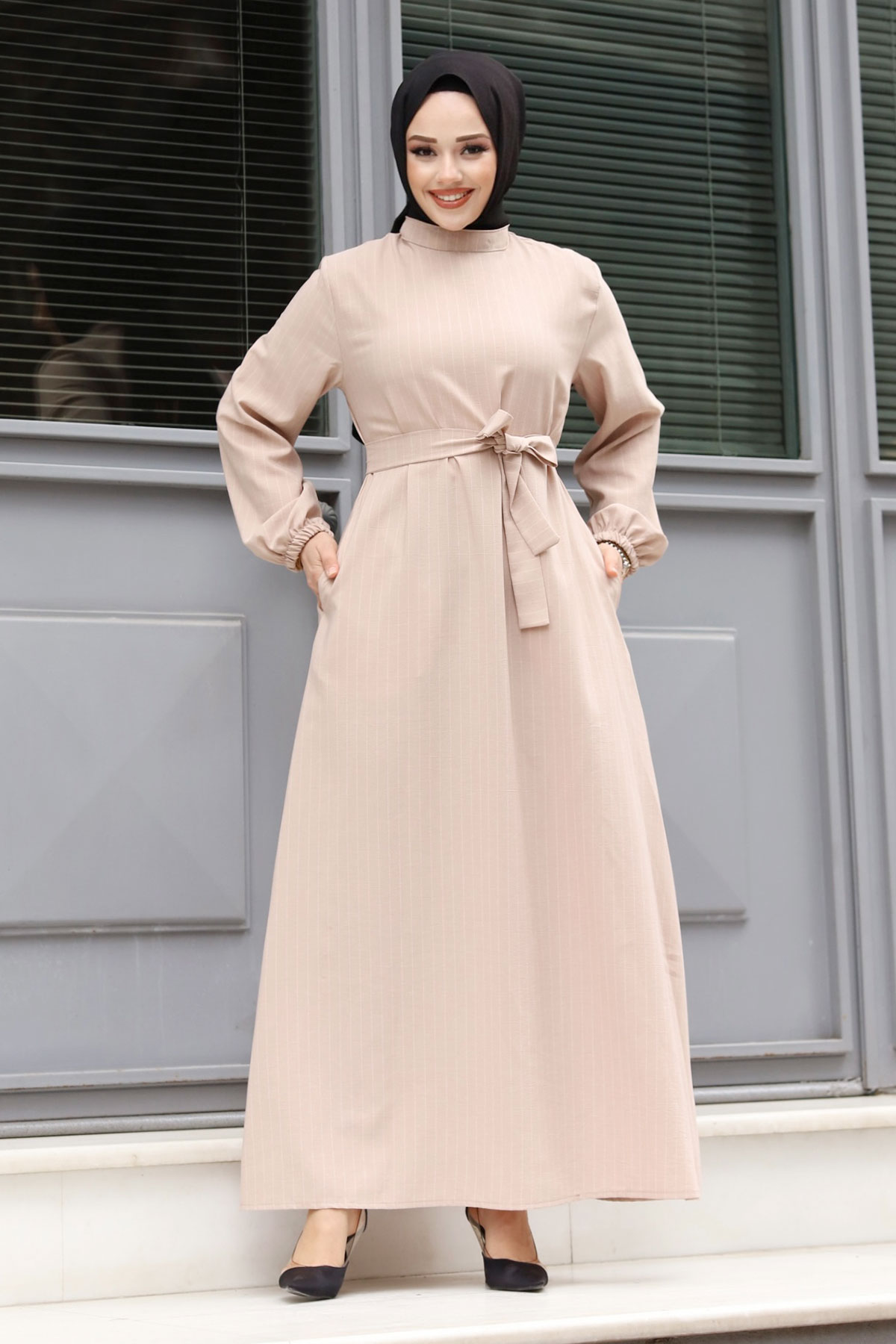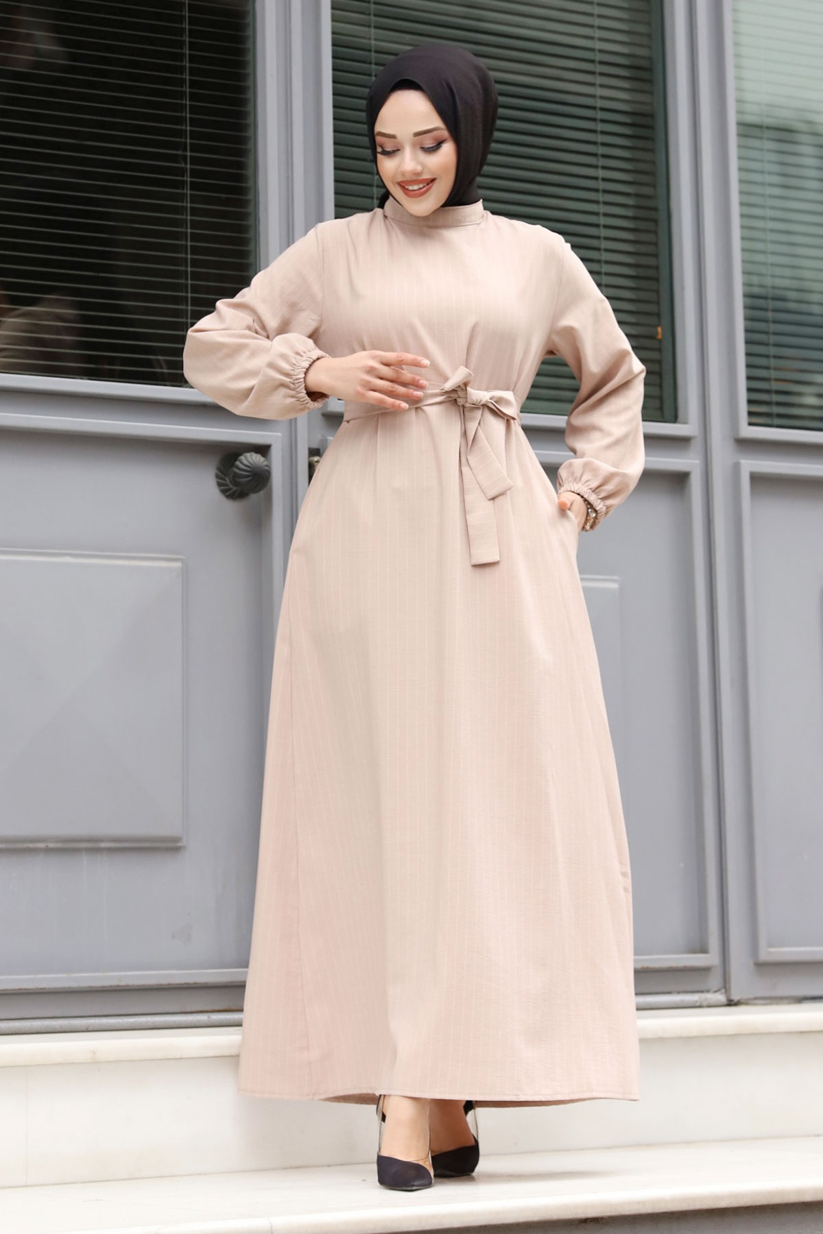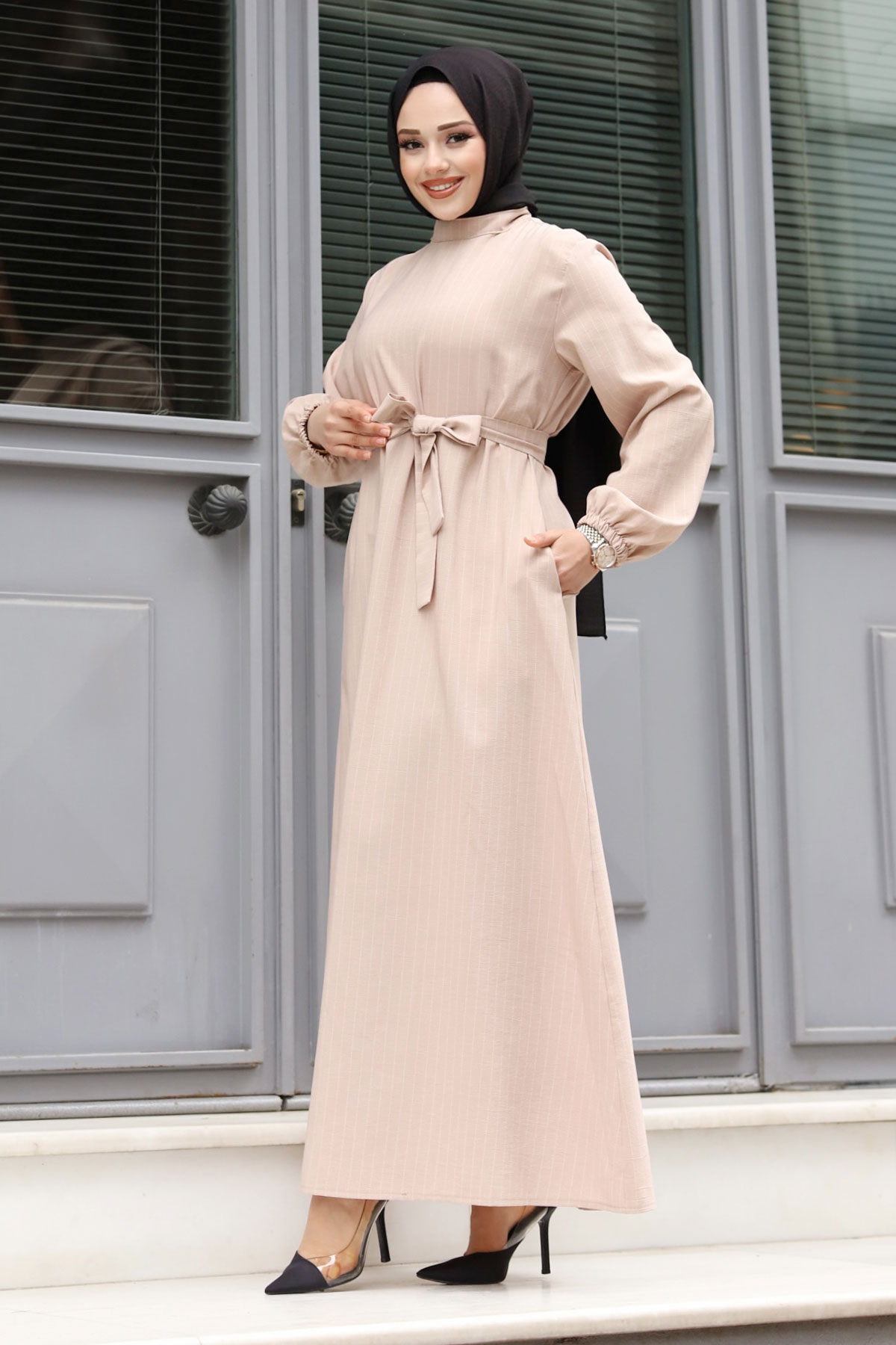 Ürün Özelliği : Yeni sezon Hakim Yaka Beli Kuşaklı Tesettür Elbise modelidir. Belinde çıkarılabilir kuşak mevcuttur. Kol ucu lastiklidir. Yakası hakim yakadır. Arkadan fermuar ile açılır. Yanlarında kullanılabilir cepleri mevcuttur. Astarsızdır. Ürün renginde konsept çekimlerinden dolayı ton farklılığı olabilir.