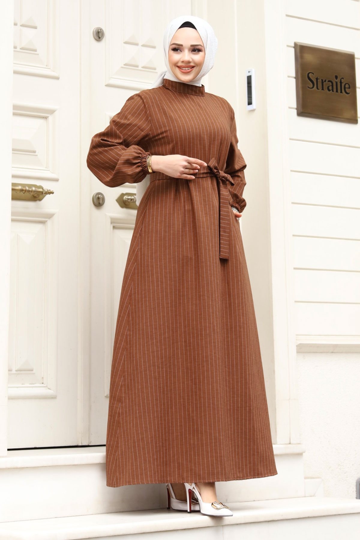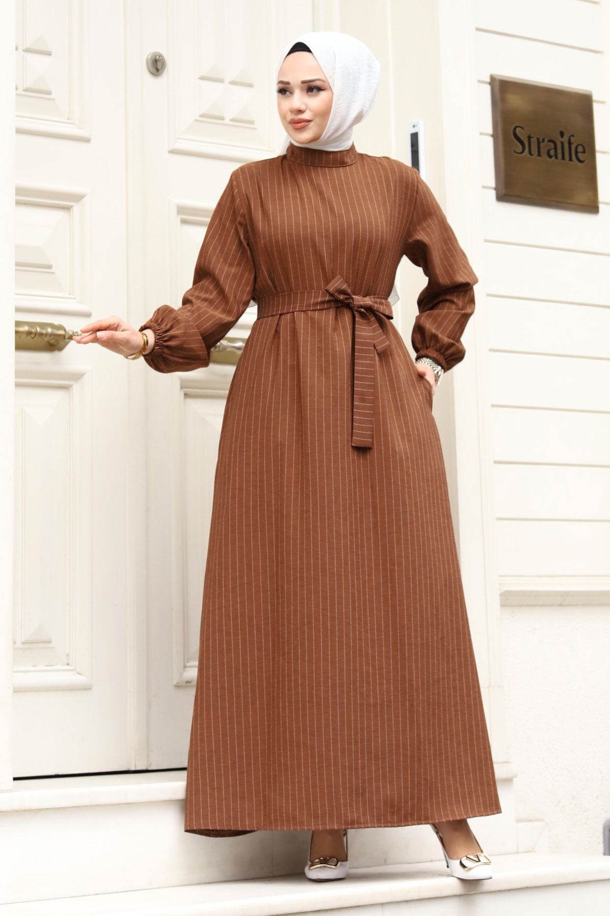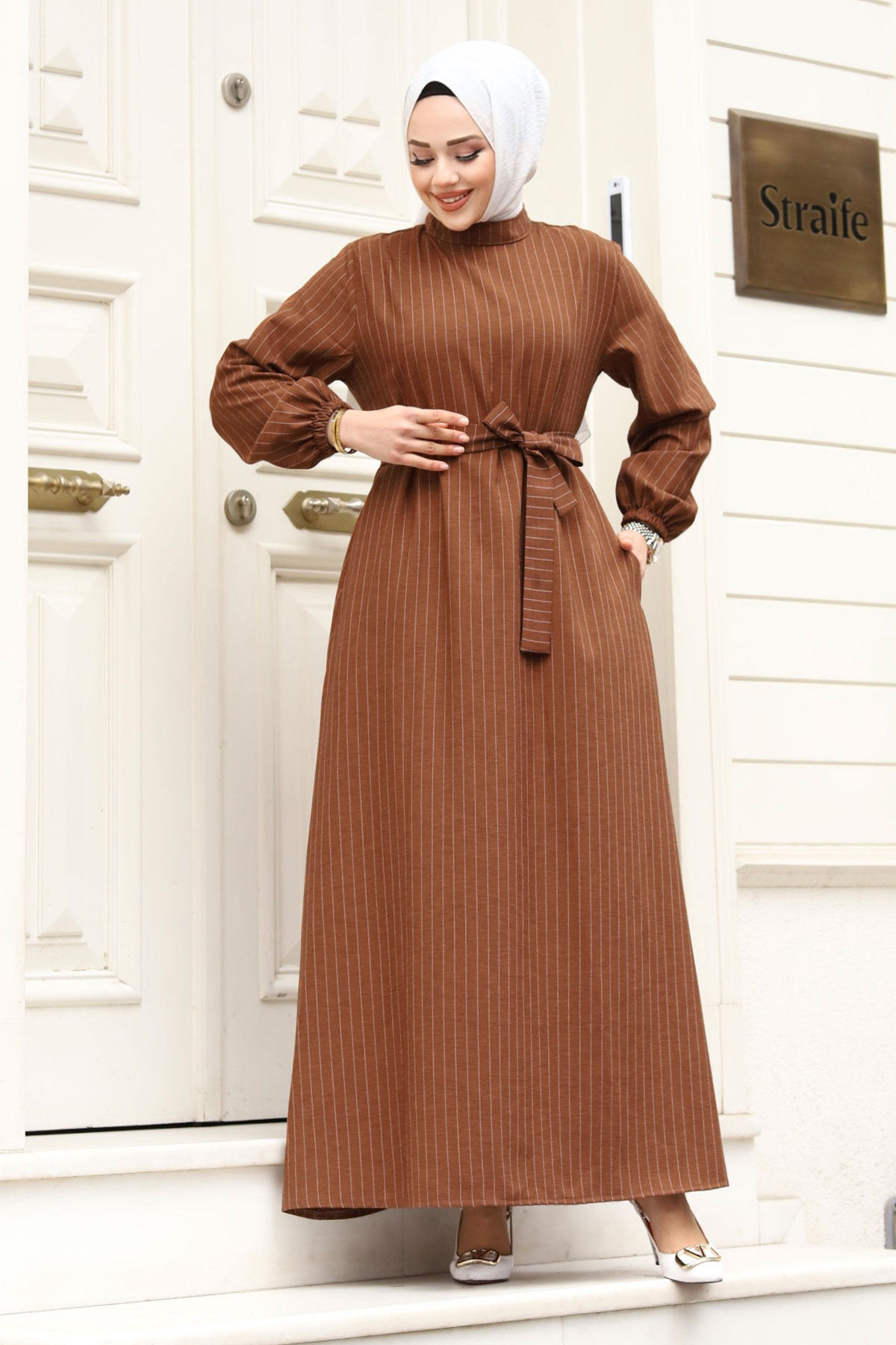 Ürün Özelliği : Yeni sezon Hakim Yaka Beli Kuşaklı Tesettür Elbise modelidir. Belinde çıkarılabilir kuşak mevcuttur. Kol ucu lastiklidir. Yakası hakim yakadır. Arkadan fermuar ile açılır. Yanlarında kullanılabilir cepleri mevcuttur. Astarsızdır. Ürün renginde konsept çekimlerinden dolayı ton farklılığı olabilir.