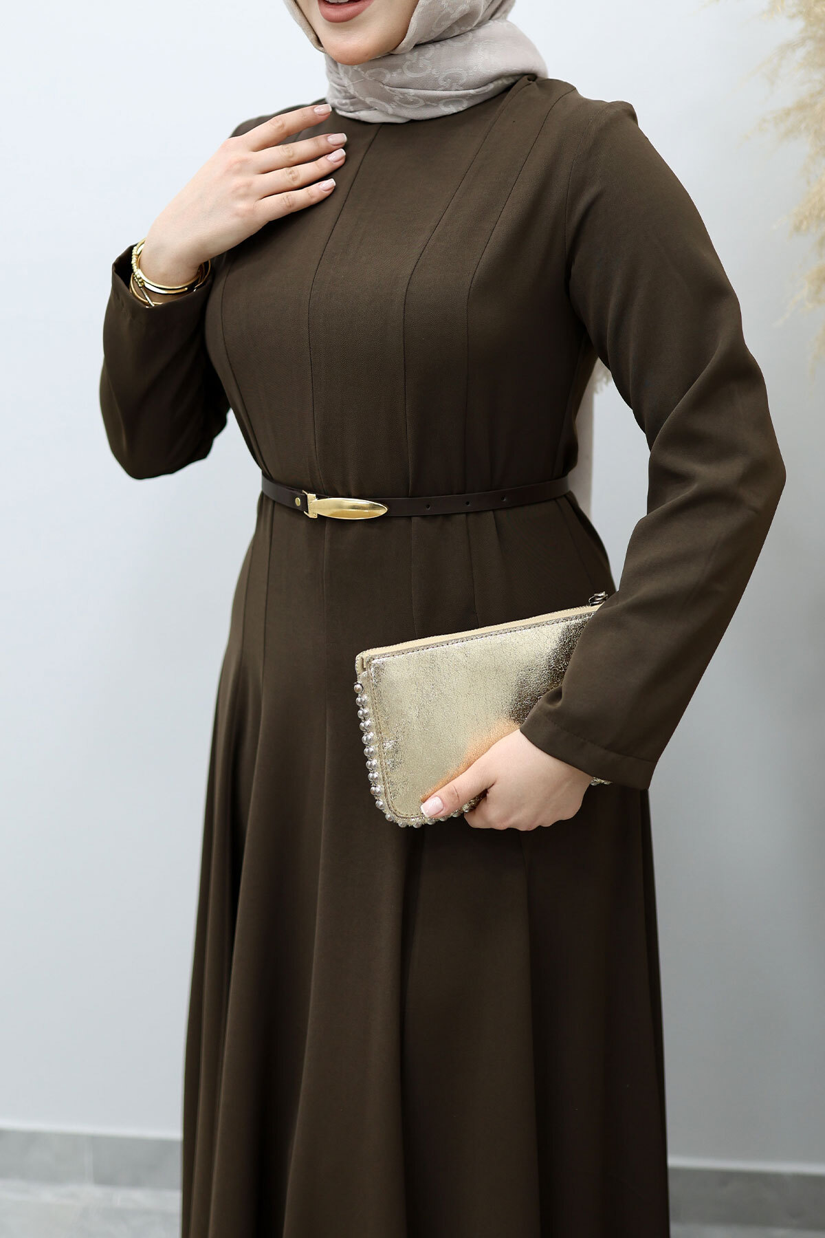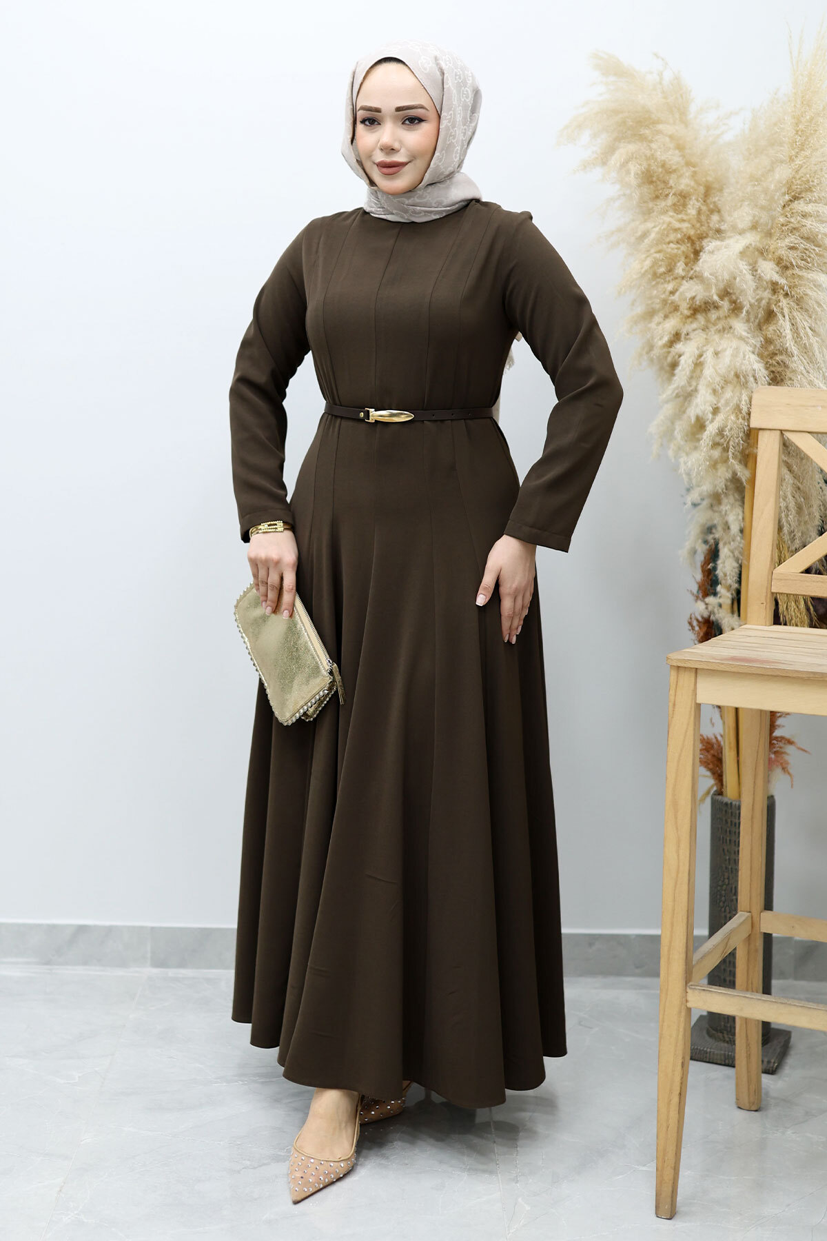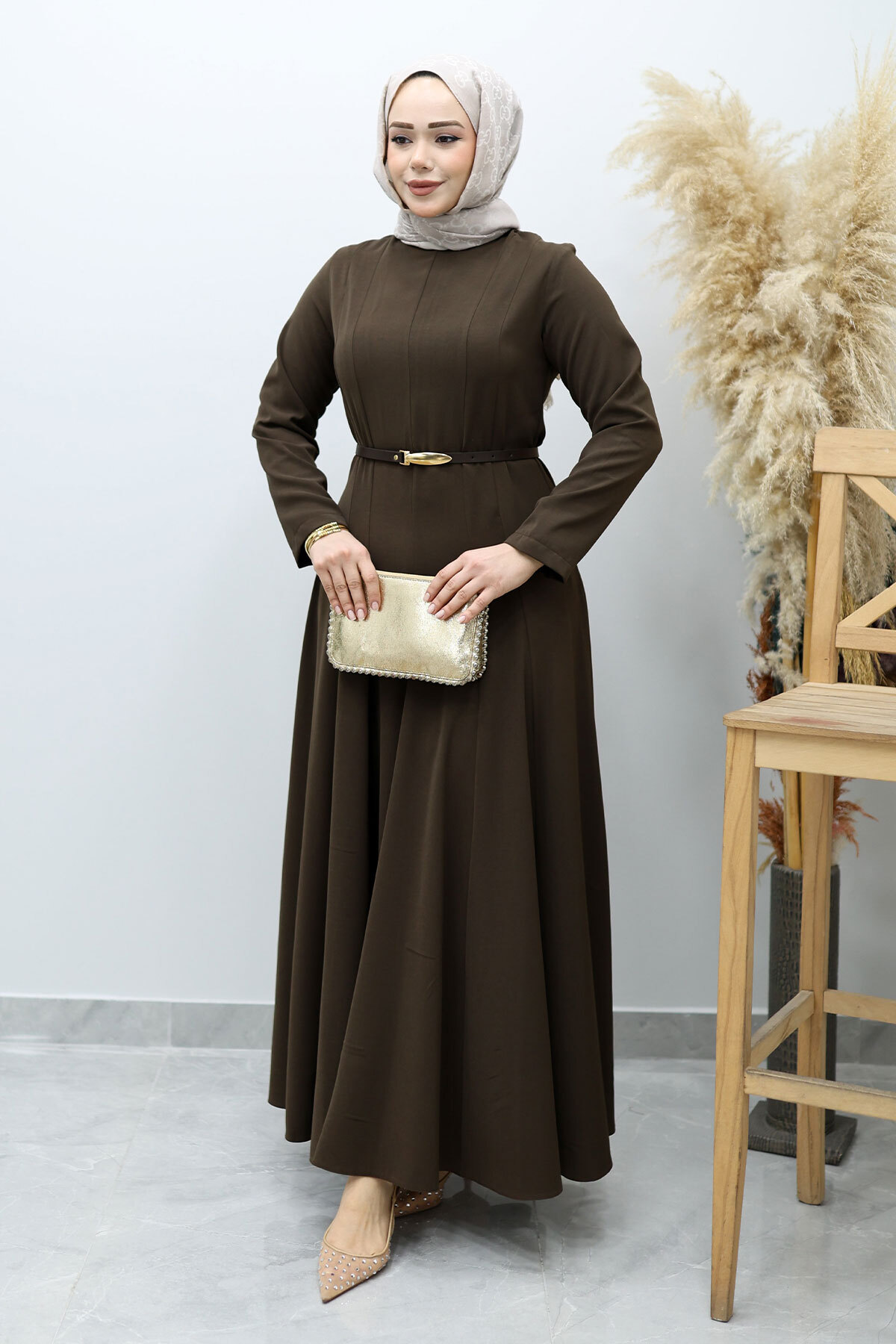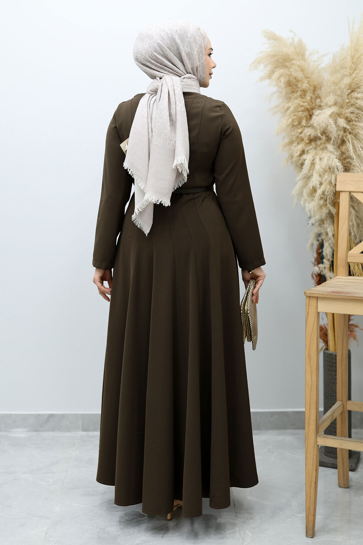 Hakim Yaka Pensli Kemerli Elbise TSD260151 Kahverengi