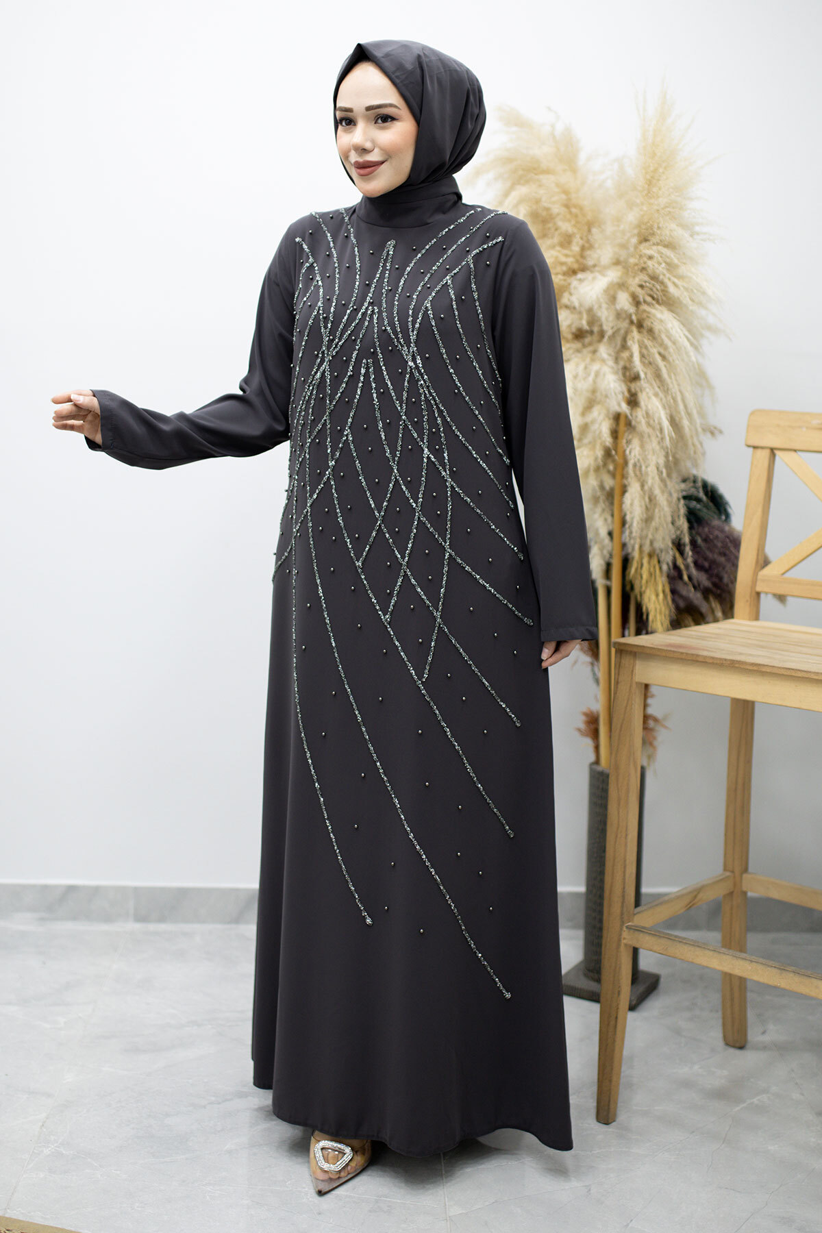 Hakim Yaka Taşlı Elbise TSD260170 Füme Özellikleri