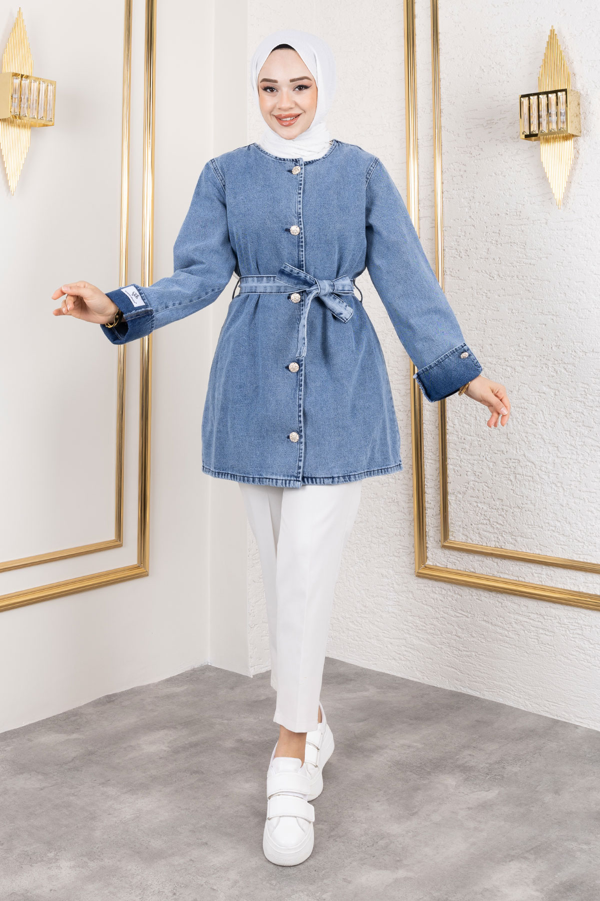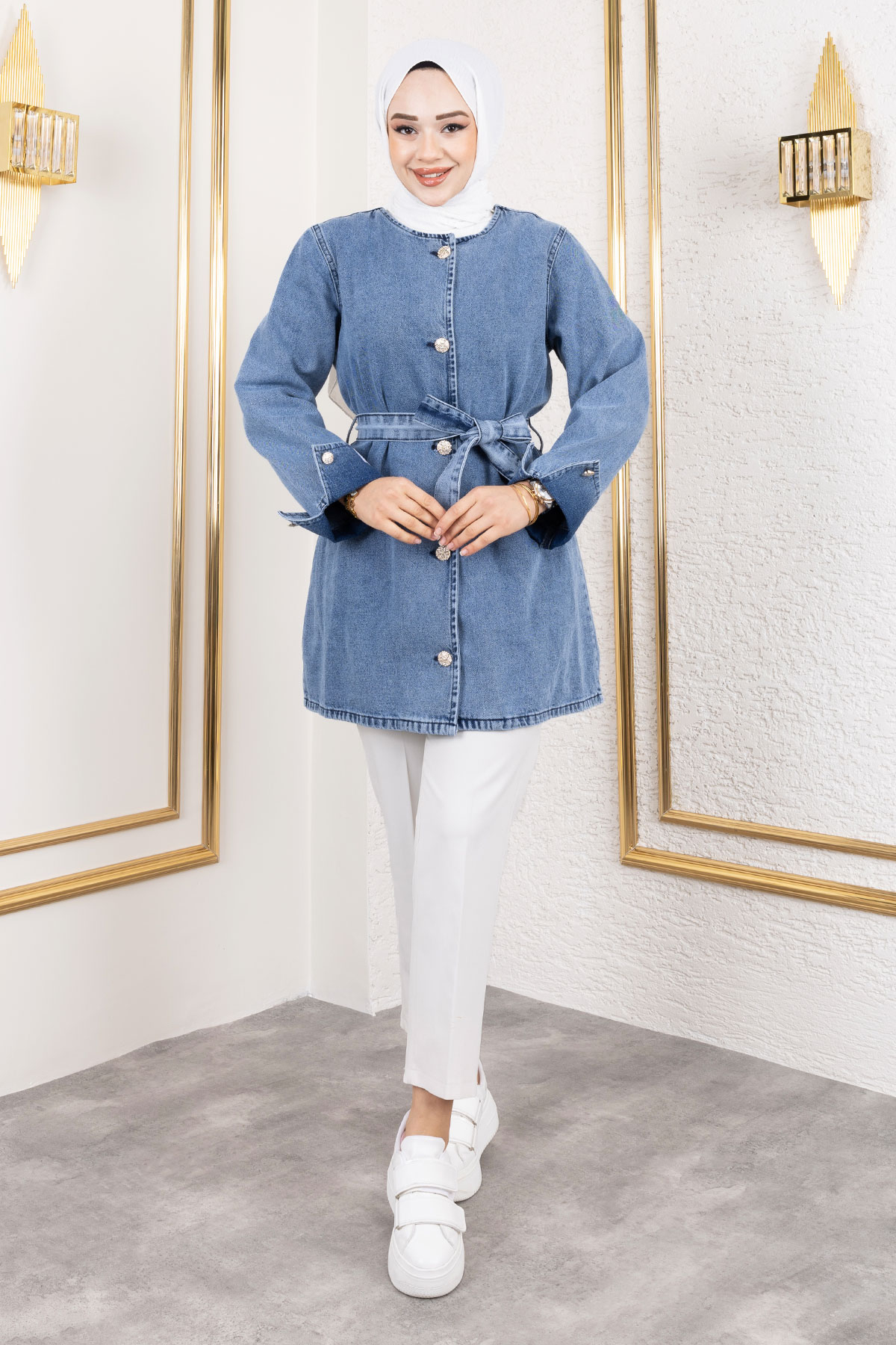 Ürün Özelliği : Yeni sezon Helen Denim Ceket modelidir. Boydan düğmeli olup astarsız bir modeldir. Cepsizdir. Kolu katlamalı olup bisiklet yakalıdır .Beli bağlamalıdır. Ürün renginde konsept çekimlerinden dolayı ton farklılığı olabilir.
