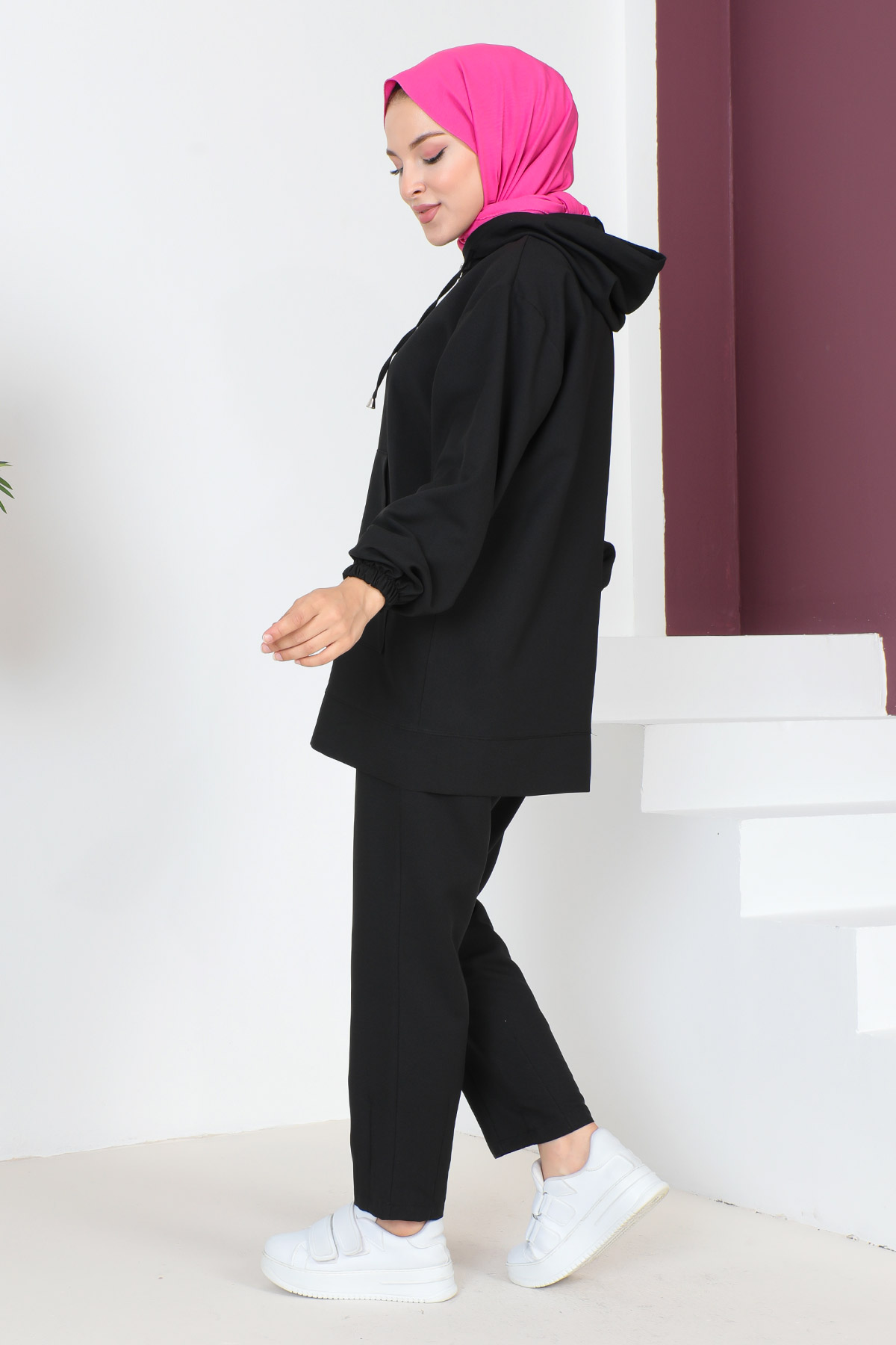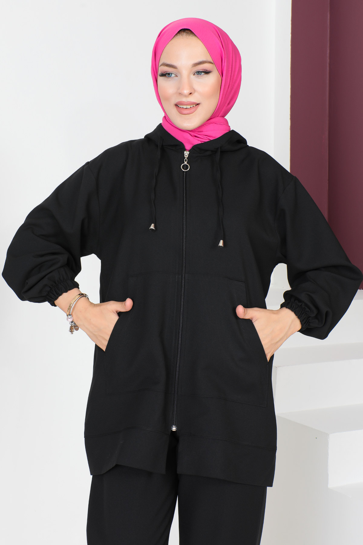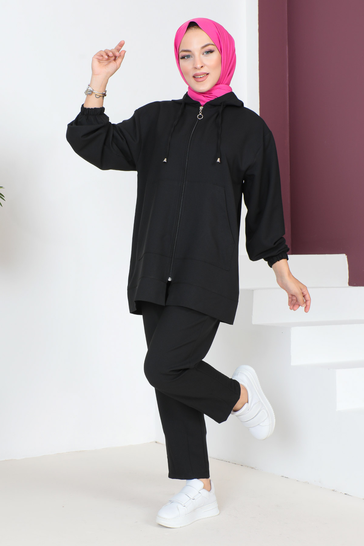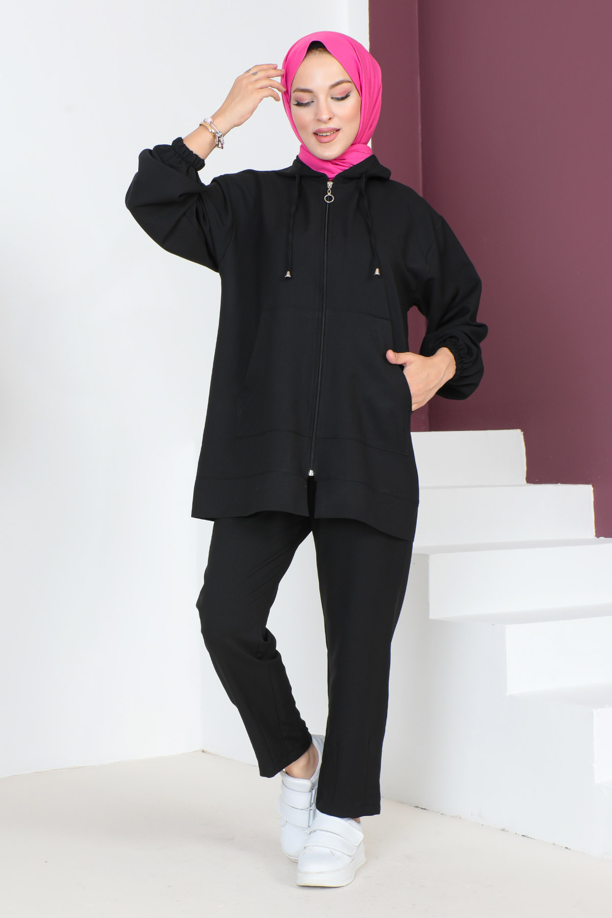 Kumaş Özelliği : Destina kumaştan üretilmiştir. Ürün Özelliği : Yeni sezon Kapşonlu İkili Takım modelidir. Ön tarafında kapşonlu cep detayı bulunmaktadır. Fermuarı ve yandan iki cebi bulunmaktadır. Pantolon beli lastiklidir ve ceplidir. Bol kesimdir. Ürün renginde konsept çekimlerinden dolayı ton farklılığı olabilir. Yıkama Talimatı : 30 derecede sıktırmadan yıkanabilir. 36 Beden Ölçüleri Ürün Boyu: 78 cm Göğüs :112 cmBel :108 cm Pantolon Boyu: 98 cm Bel : 60 cm