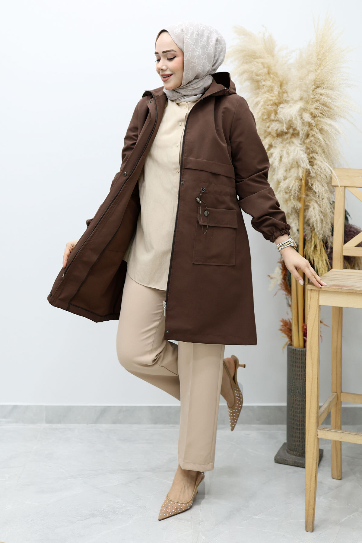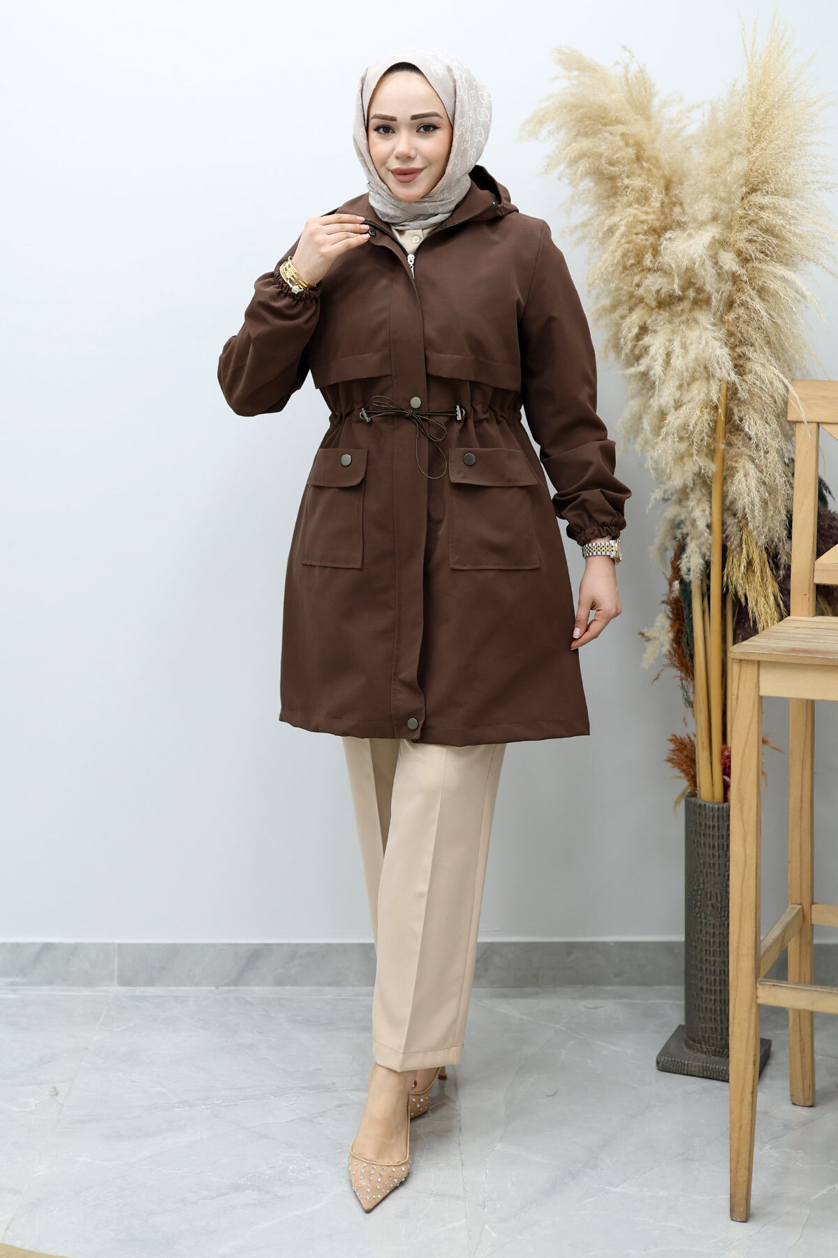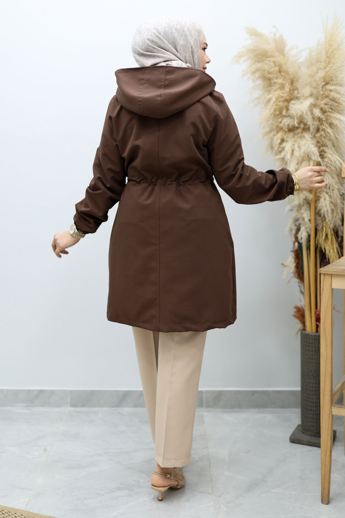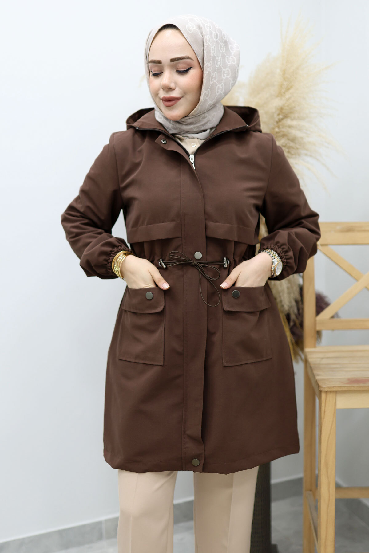 Kapüşonlu Beli Büzgülü Trençkot TSD260148 Kahverengi Özellikleri