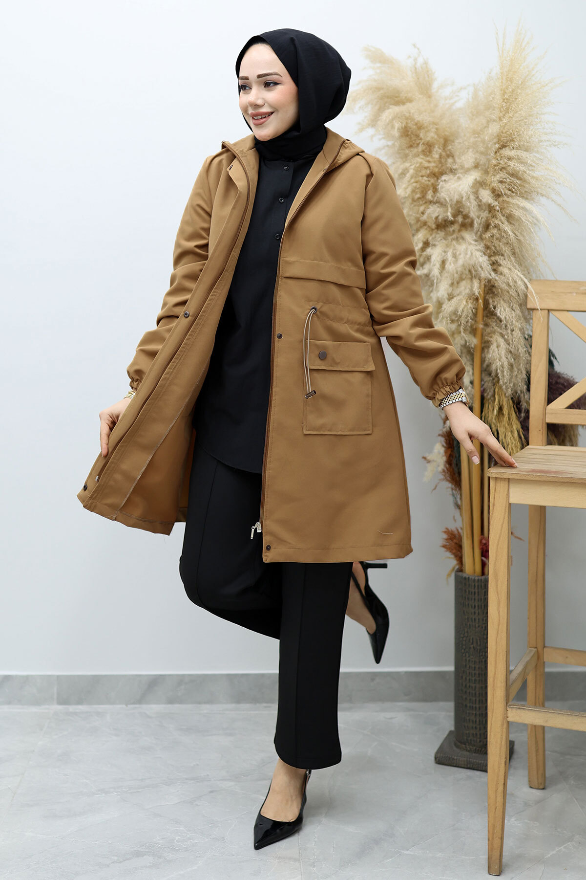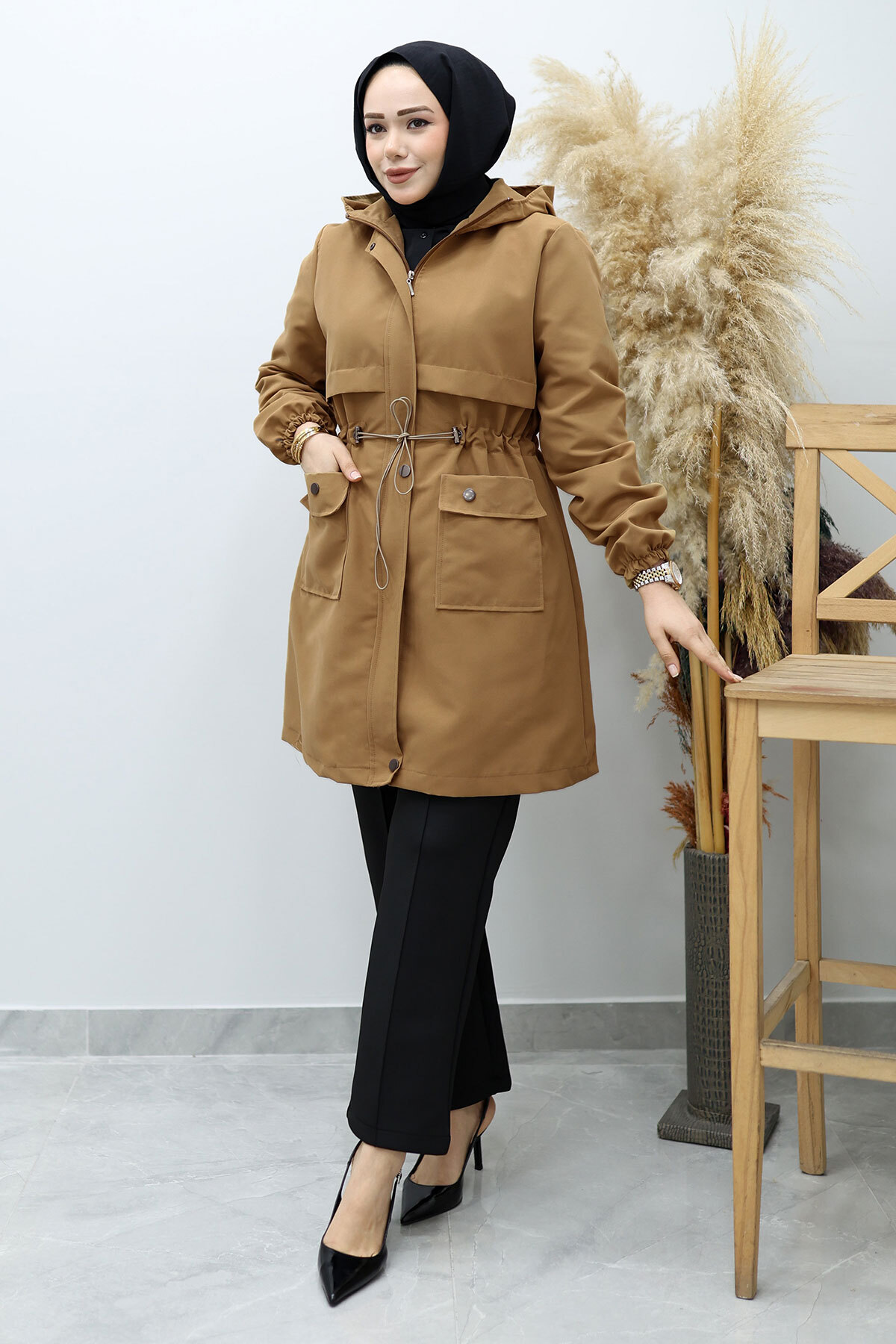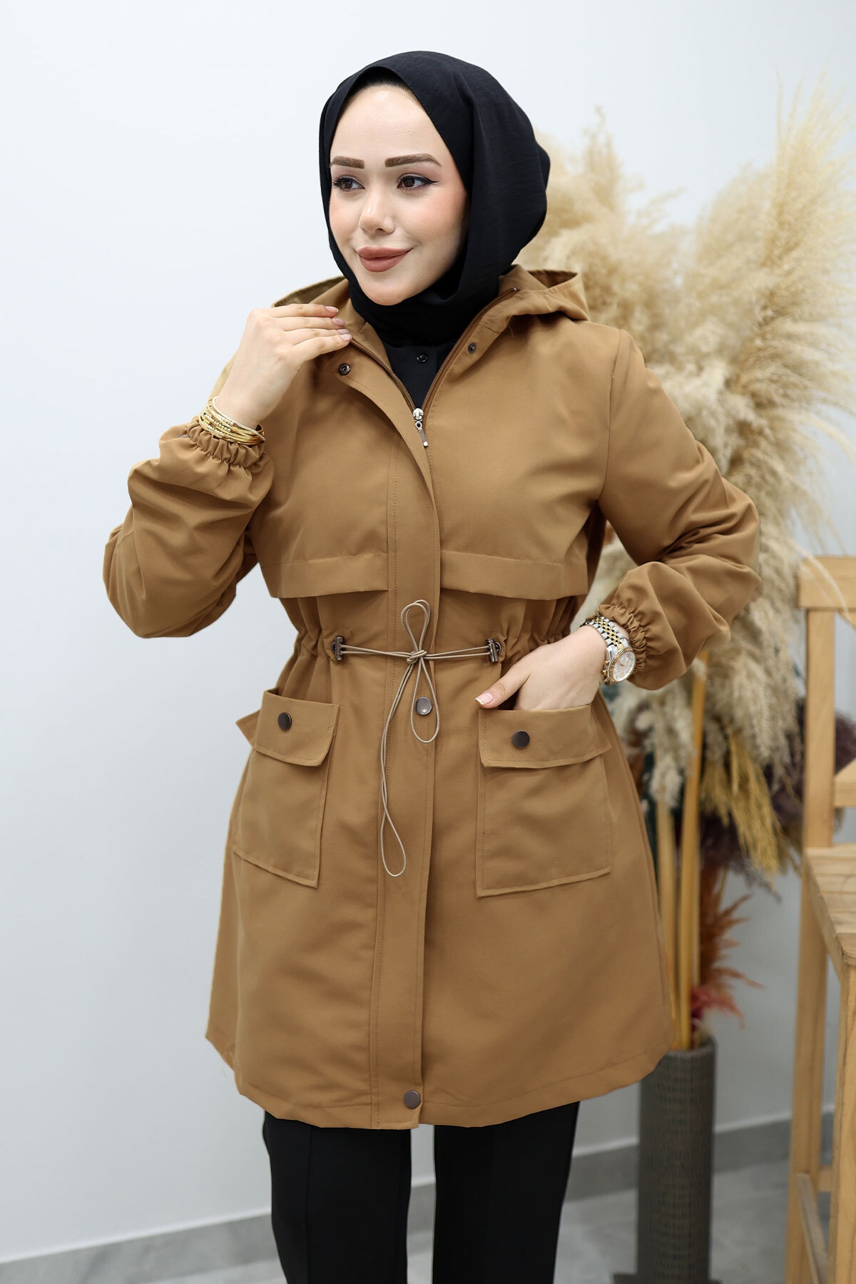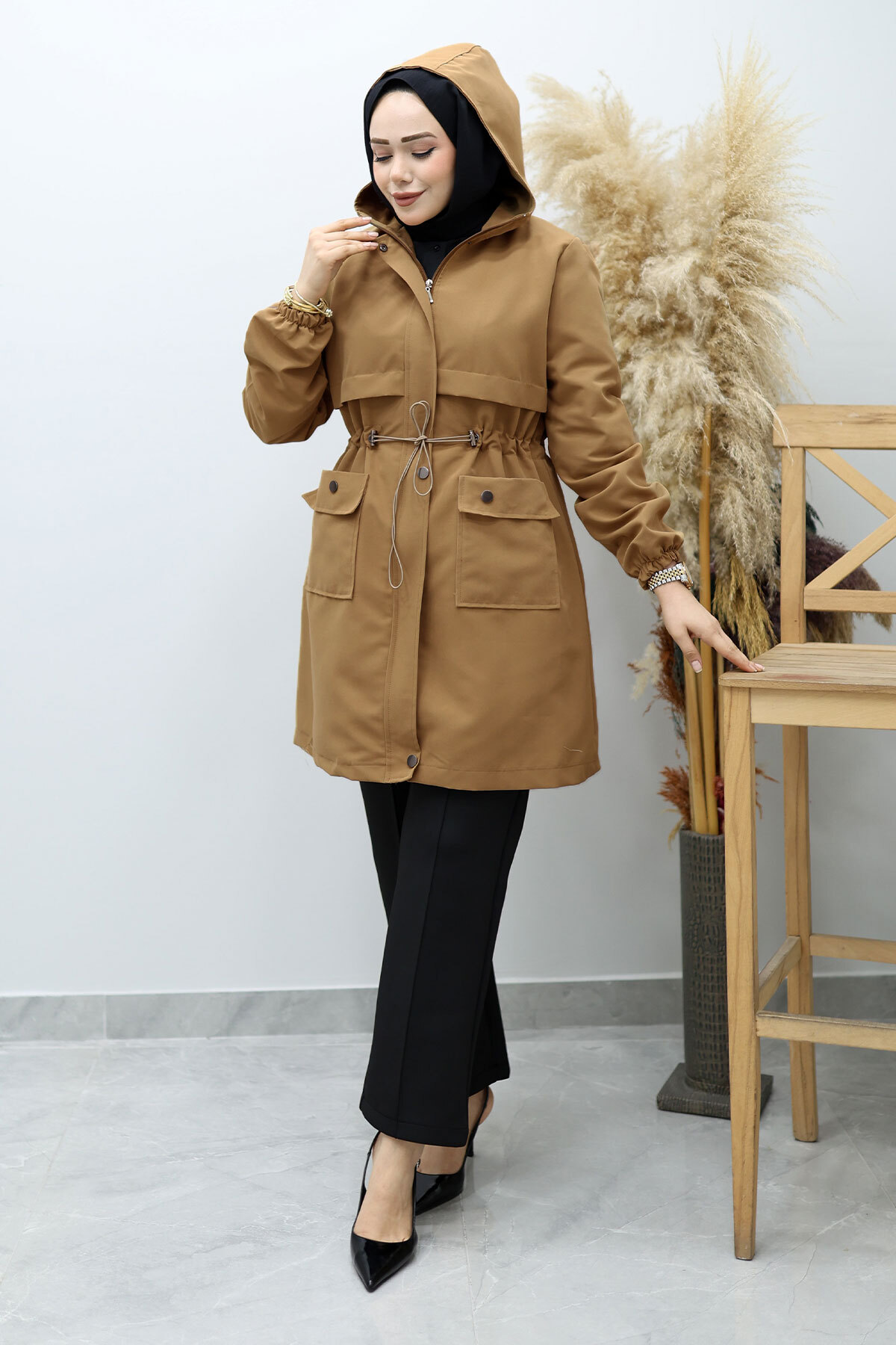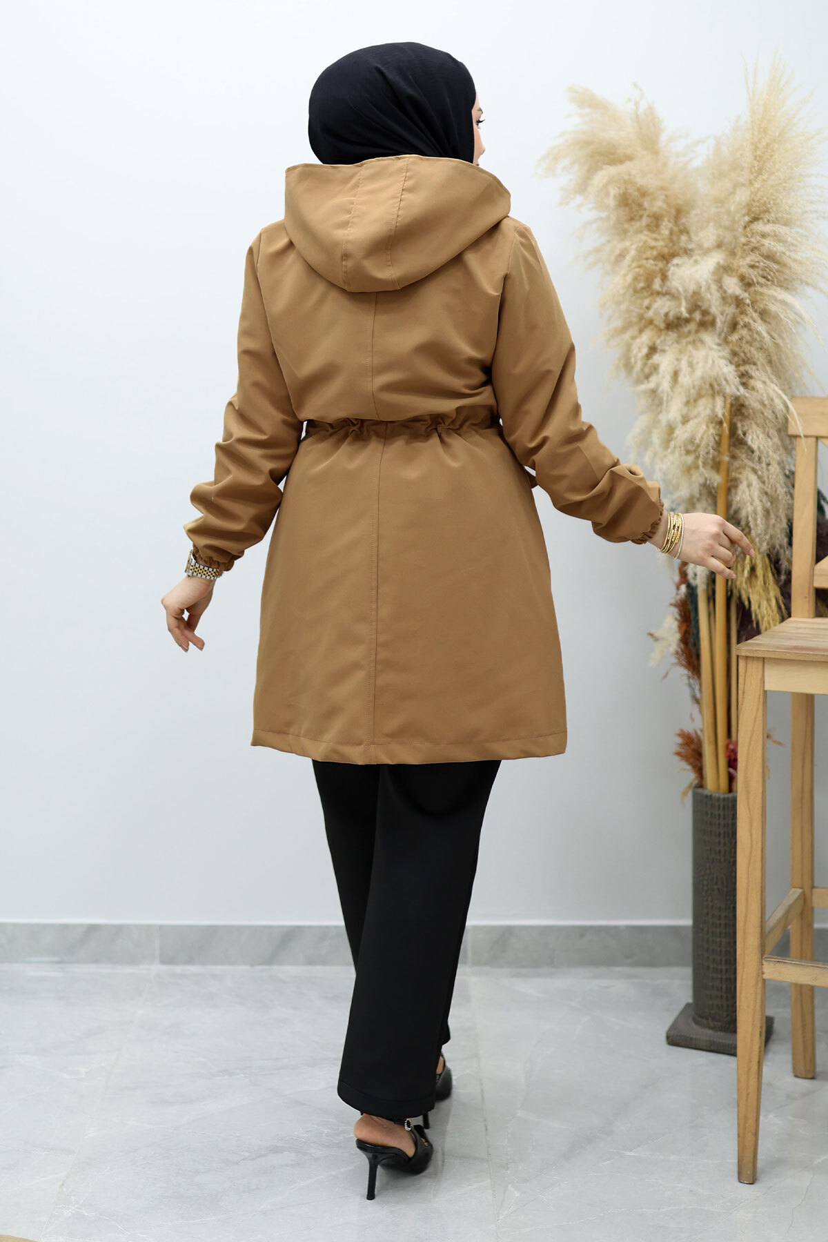 Ürün Özelliği : Yeni sezon Kapüşonlu Beli Büzgülü Trençkot modelidir.