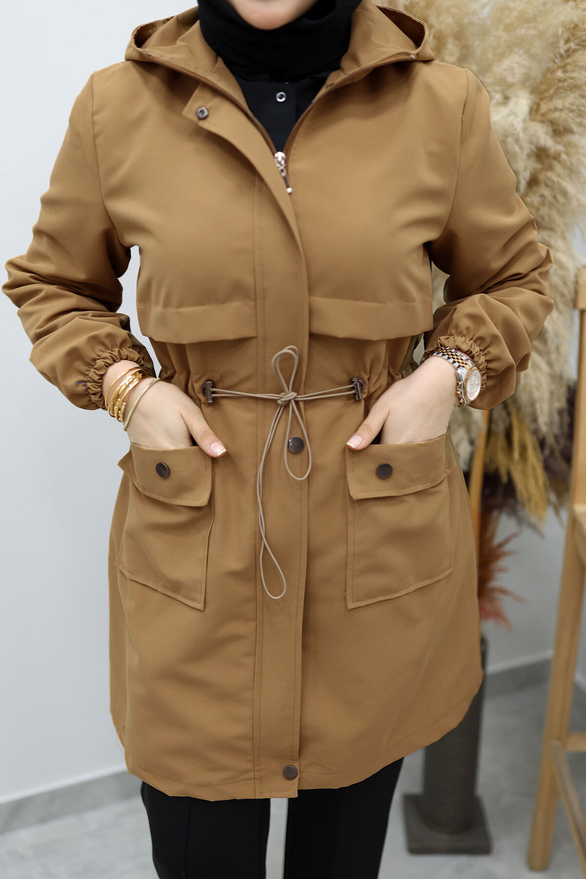 Kapüşonlu Beli Büzgülü Trençkot TSD260148 Taba Özellikleri