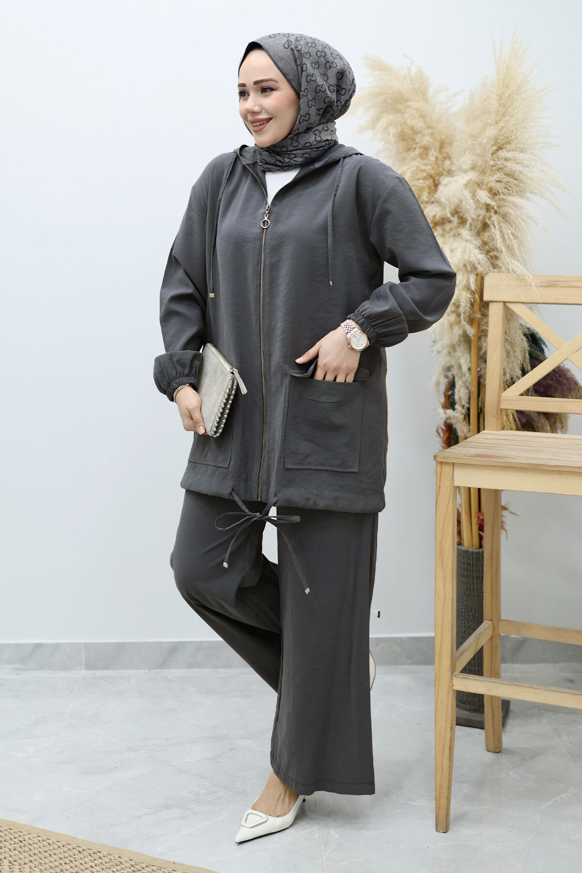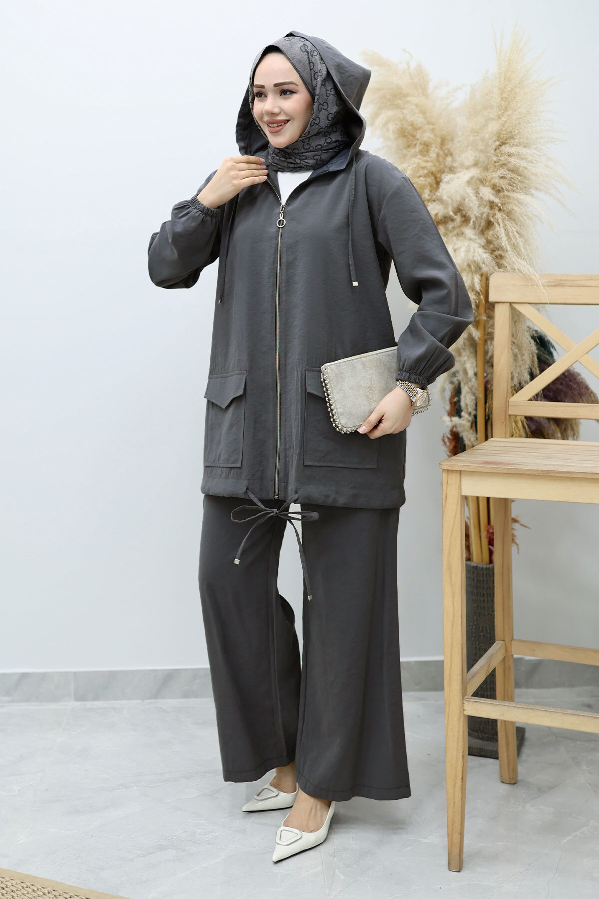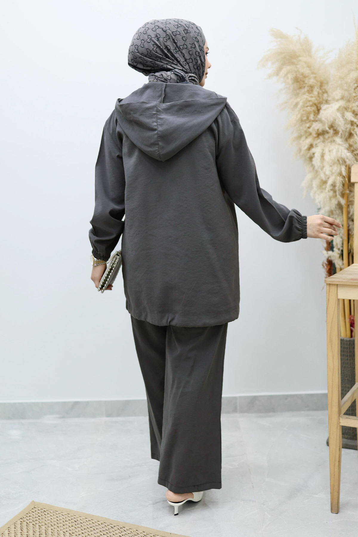 Kapüşonlu Fermuarlı İkili Takım TSD260132 Füme