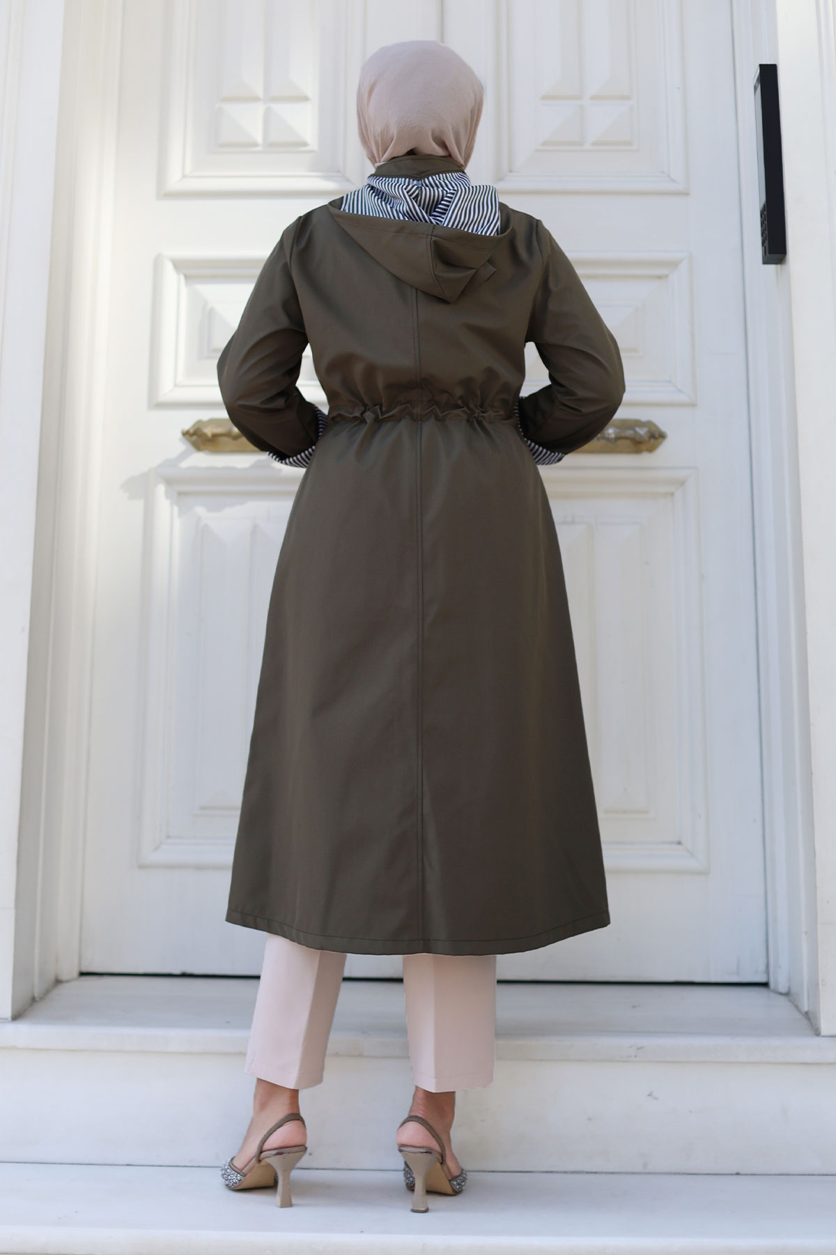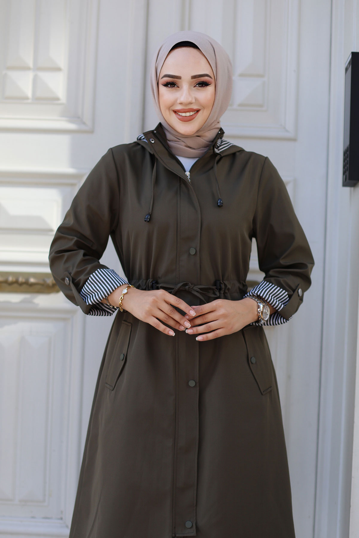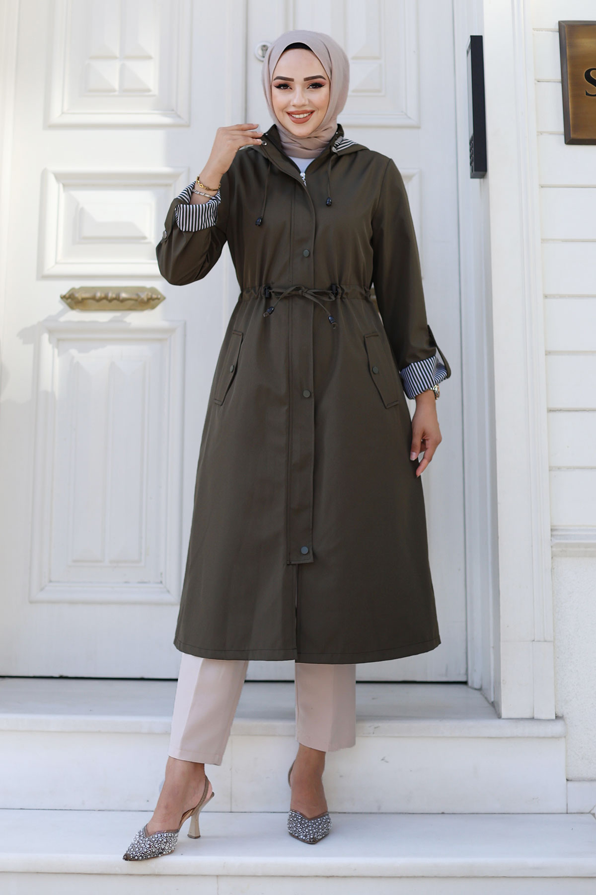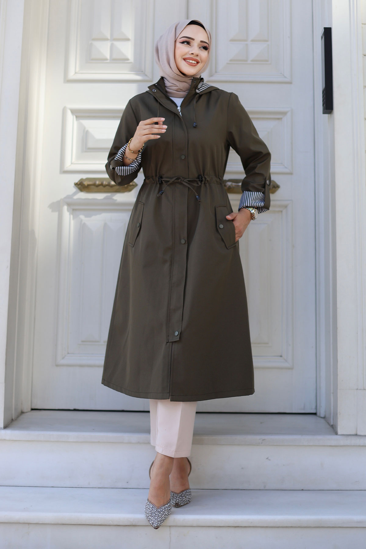 Ürün Özelliği : Yeni Sezon Önden Çıtçıtlı Astarı Çizgili Trençkot modelidir. Boydan gizli fermuar ile kapanabilir olup dışında çıtçıt vardır. Astarı çizgilidir. Kolu katlanabilir olup düğme mevcuttur. Her iki yanında kullanılabilir cep bulunmaktadır. Kapüşonlu olup kapüşonu ve beli bağcıklıdır. Ürün renginde konsept çekimlerinden dolayı ton farklılığı olabilir.