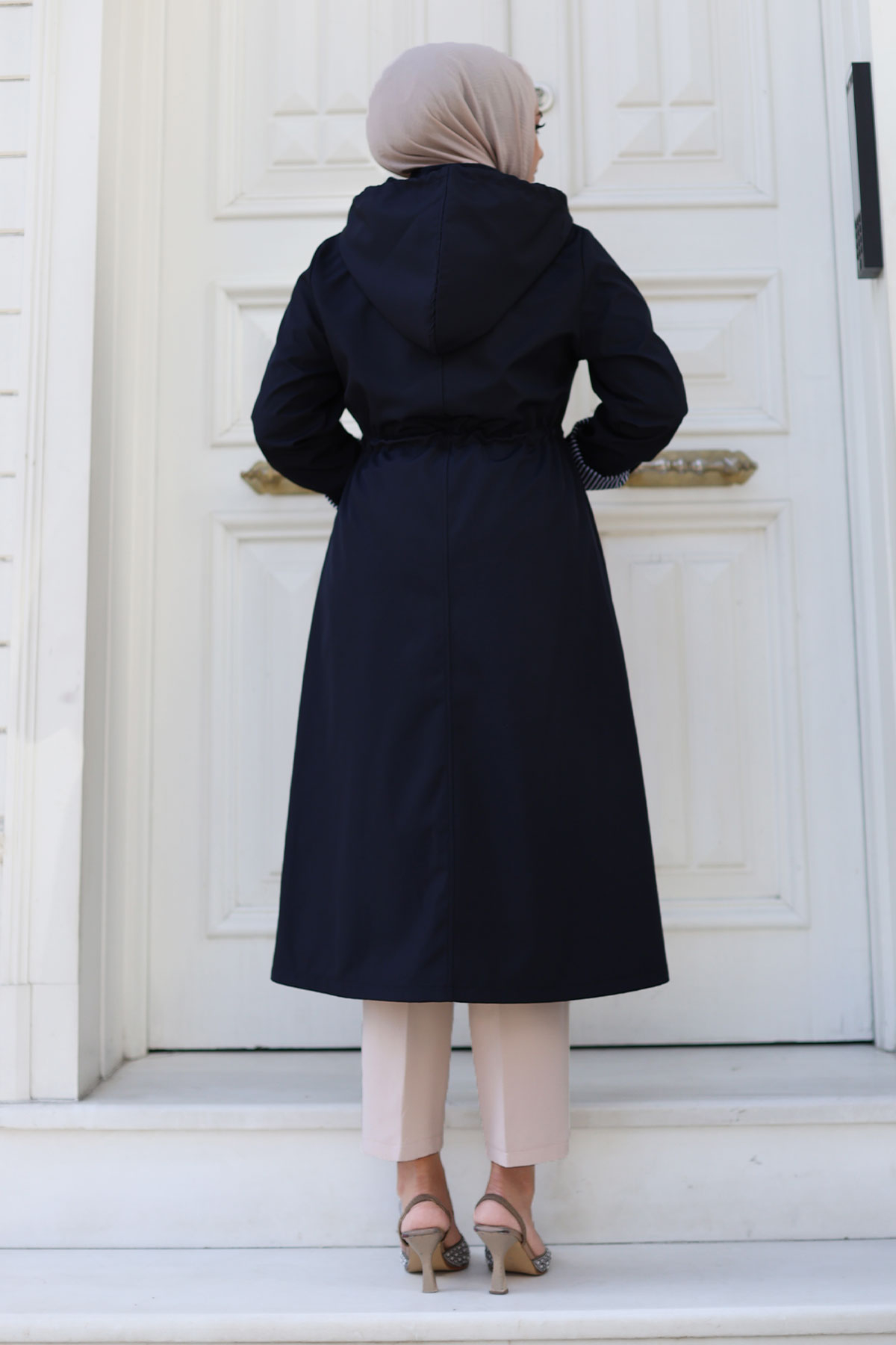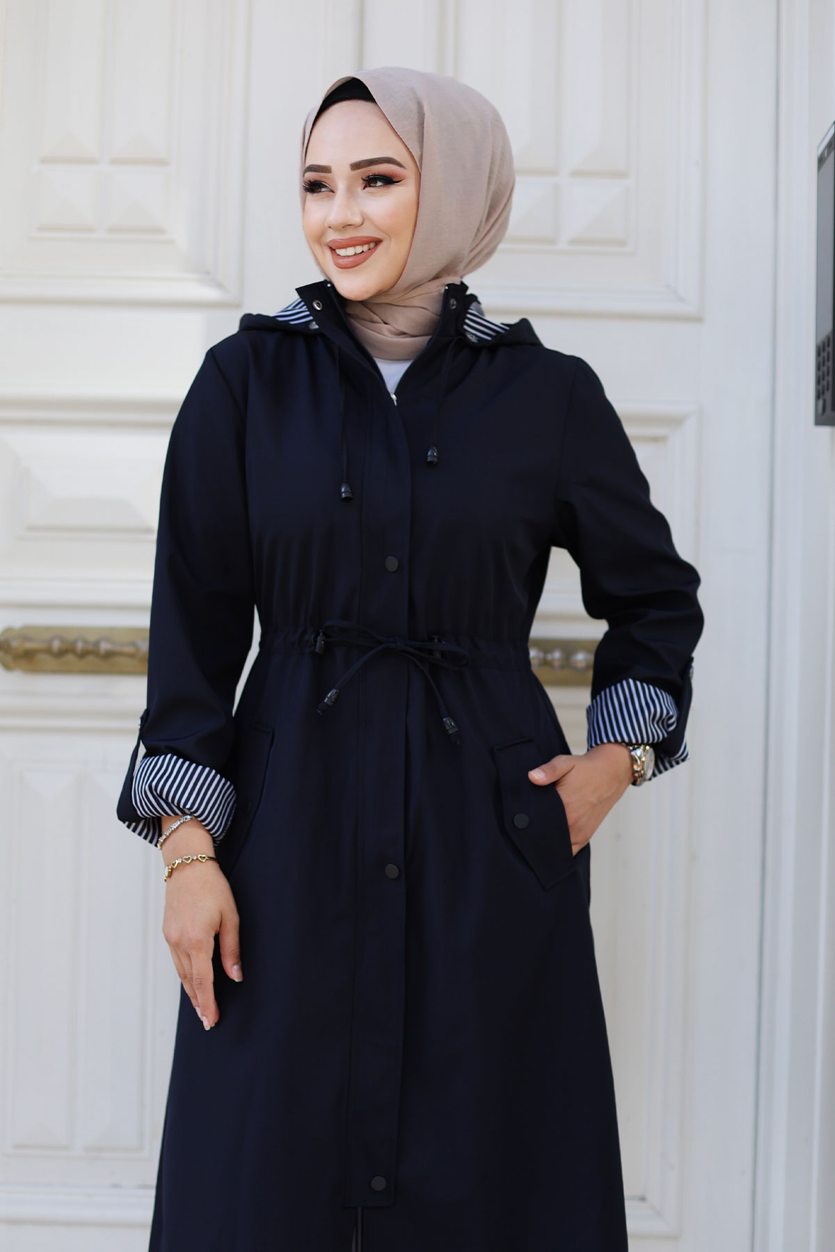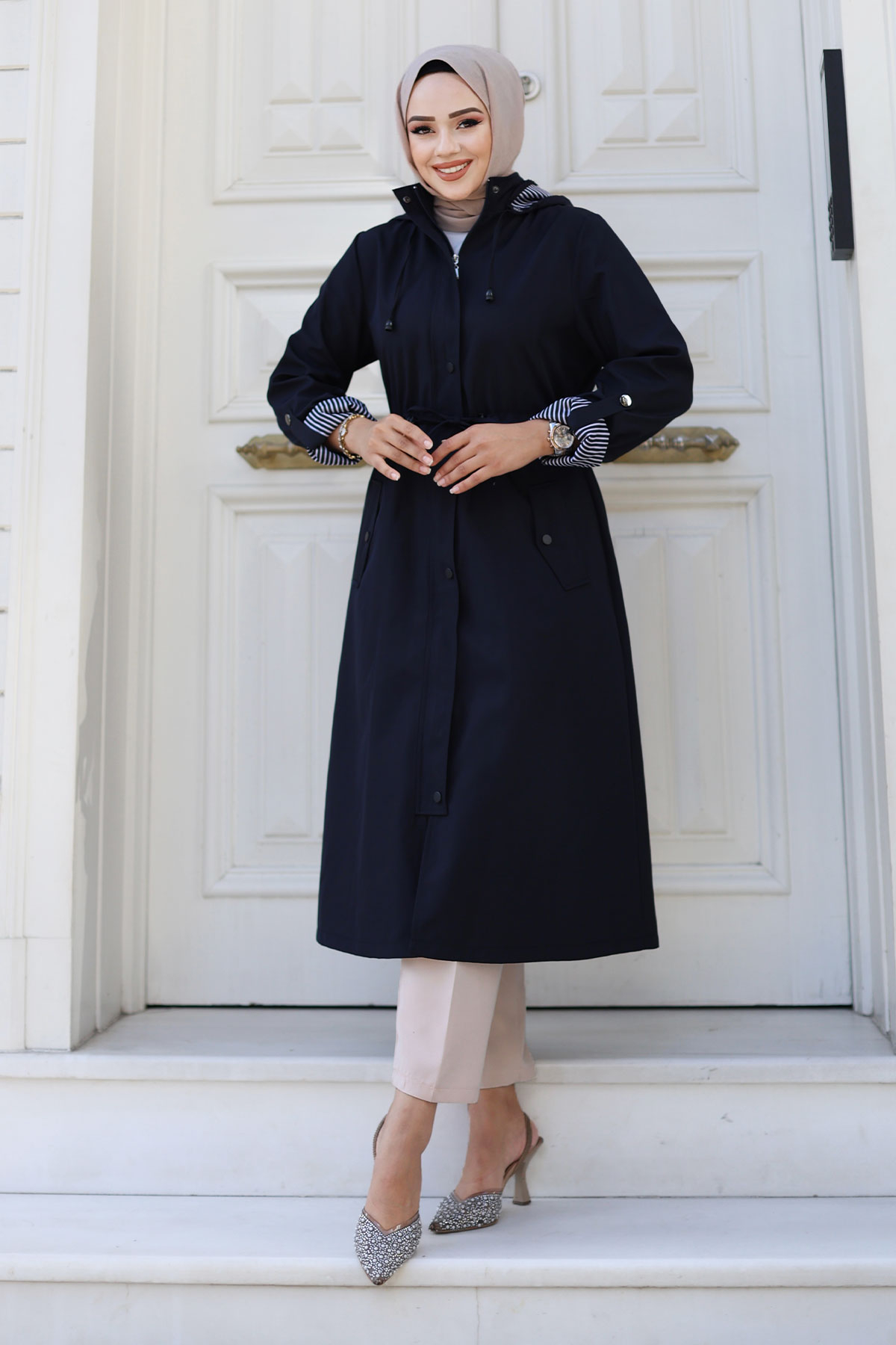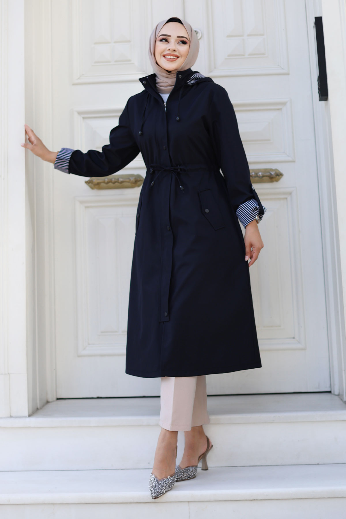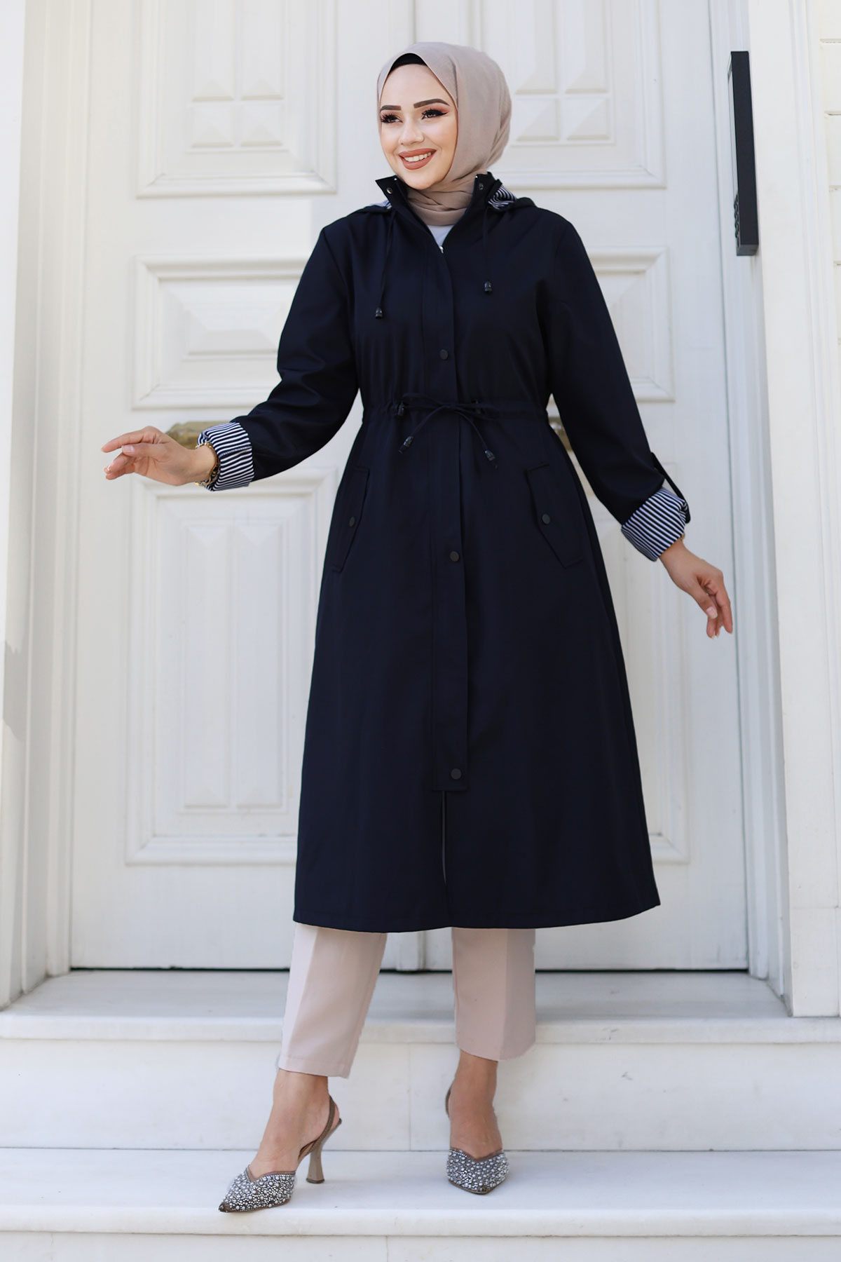 Ürün Özelliği : Yeni Sezon Önden Çıtçıtlı Astarı Çizgili Trençkot modelidir. Boydan gizli fermuar ile kapanabilir olup dışında çıtçıt vardır. Astarı çizgilidir. Kolu katlanabilir olup düğme mevcuttur. Her iki yanında kullanılabilir cep bulunmaktadır. Kapüşonlu olup kapüşonu ve beli bağcıklıdır. Ürün renginde konsept çekimlerinden dolayı ton farklılığı olabilir.