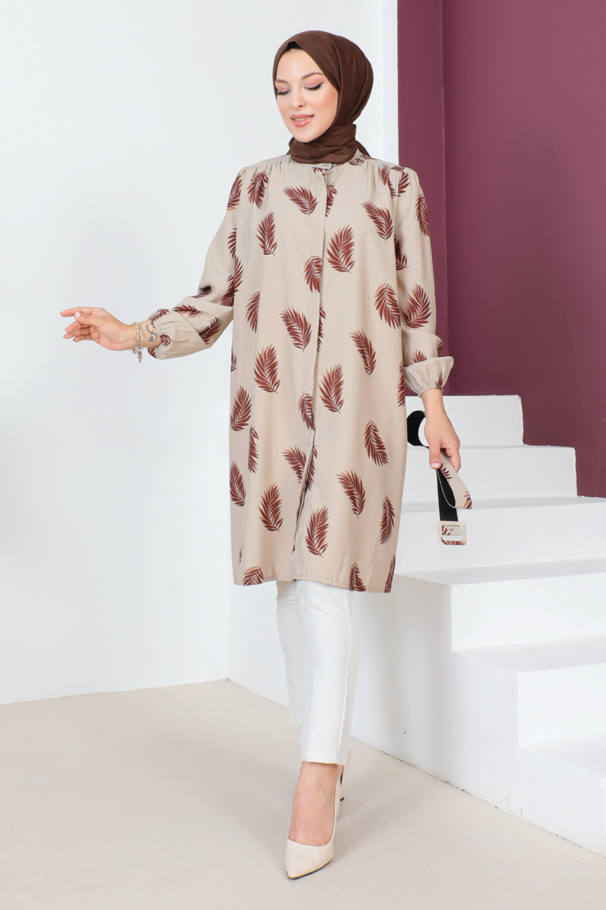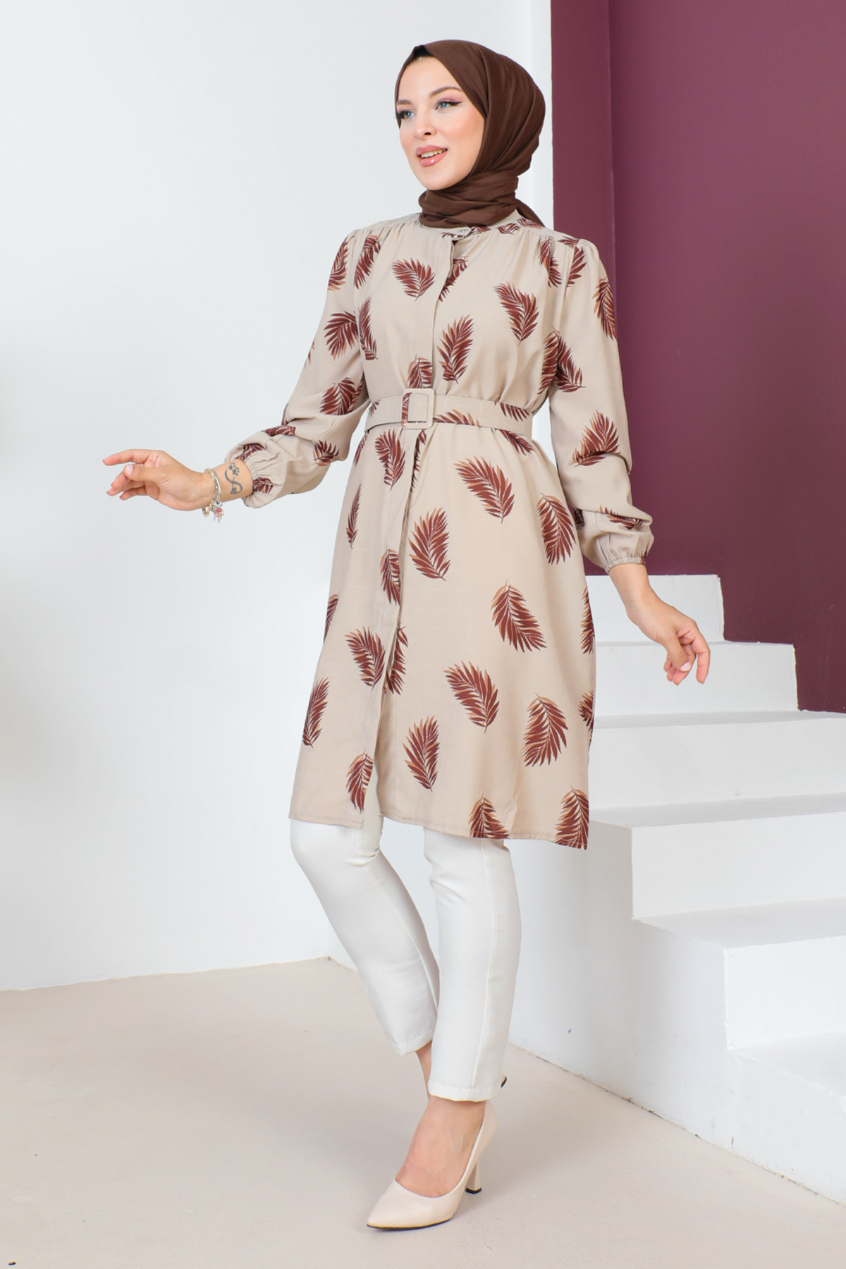 Ürün Özelliği : Yeni sezon Kemerli Yaprak Desenli Tunik modelidir. Kolları lastiklidir.Beli çıkarılabilir kemer detaylıdır. Kumaşı desenlidir.Boydan gizli patlı düğmelidir. Ürün renginde konsept çekimlerinden dolayı ton farklılığı olabilir.