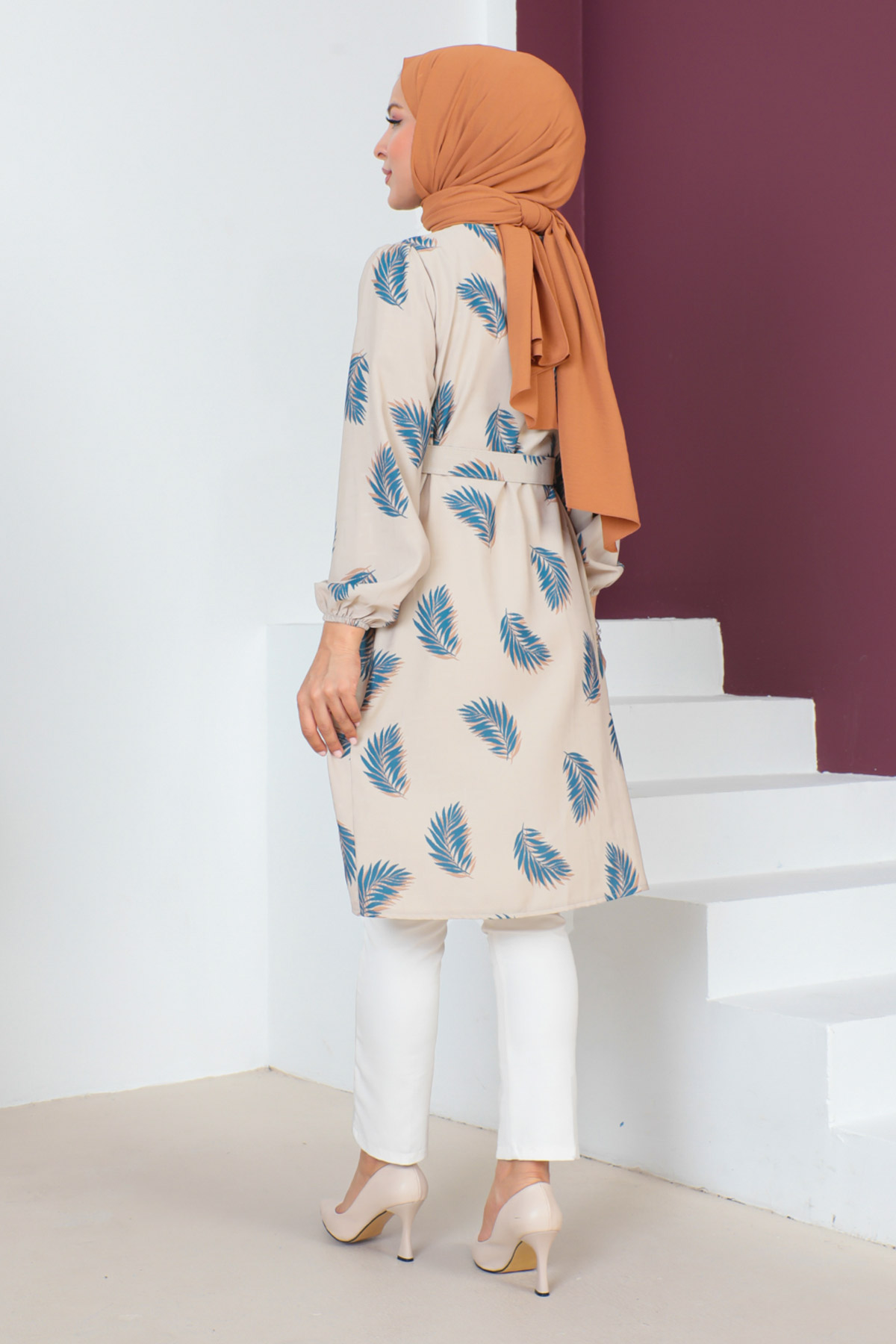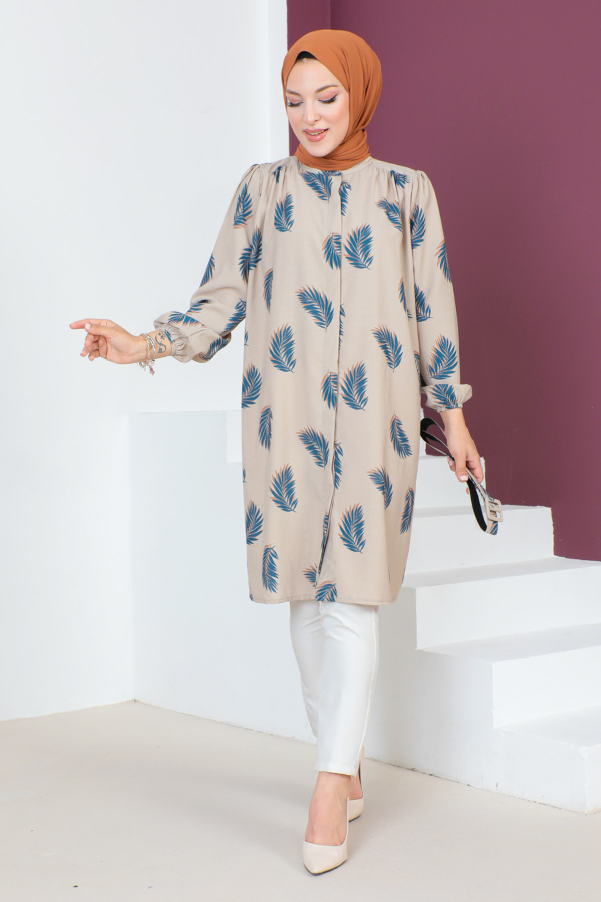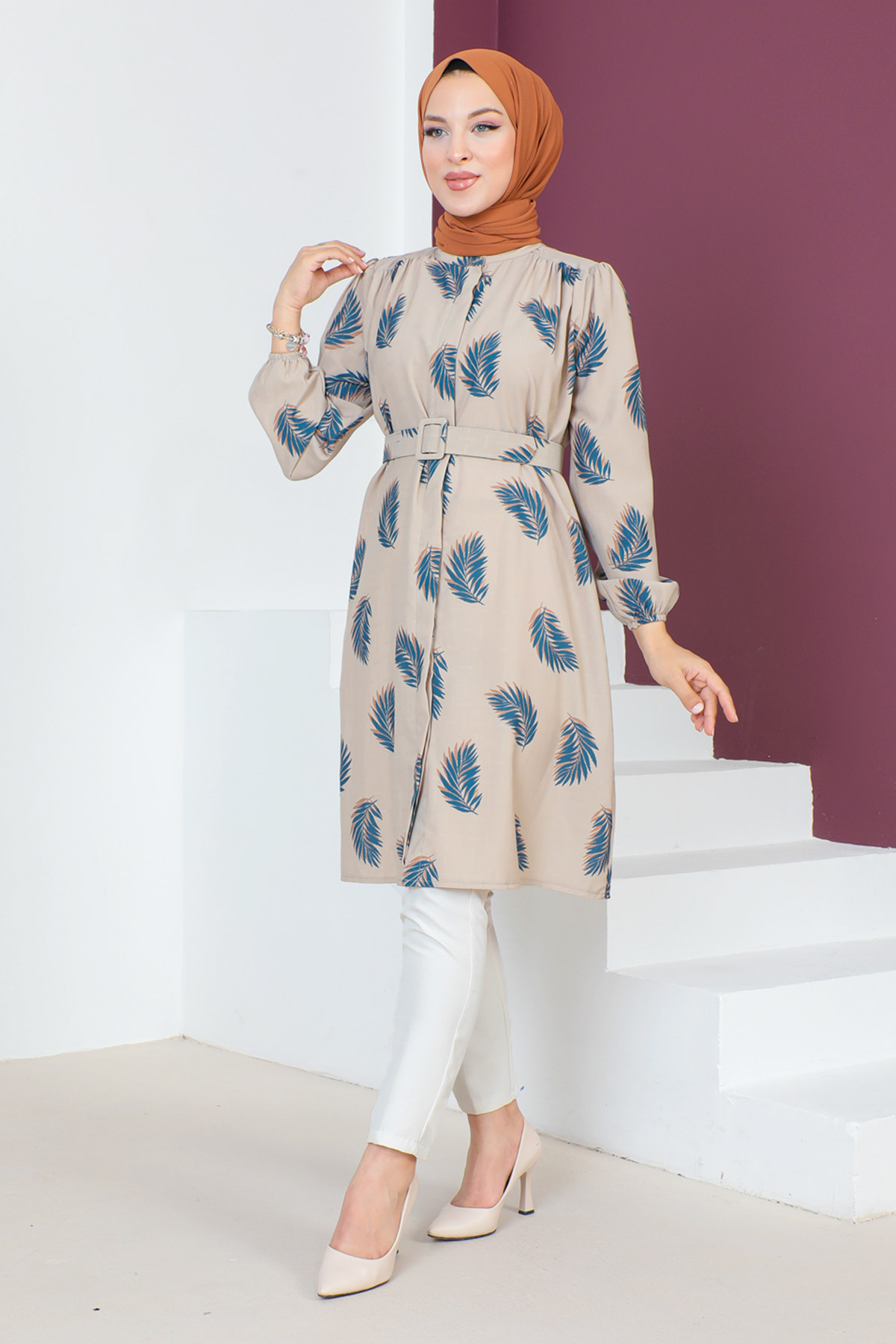 Ürün Özelliği : Yeni sezon Kemerli Yaprak Desenli Tunik modelidir. Kolları lastiklidir.Beli çıkarılabilir kemer detaylıdır. Kumaşı desenlidir.Boydan gizli patlı düğmelidir. Ürün renginde konsept çekimlerinden dolayı ton farklılığı olabilir.