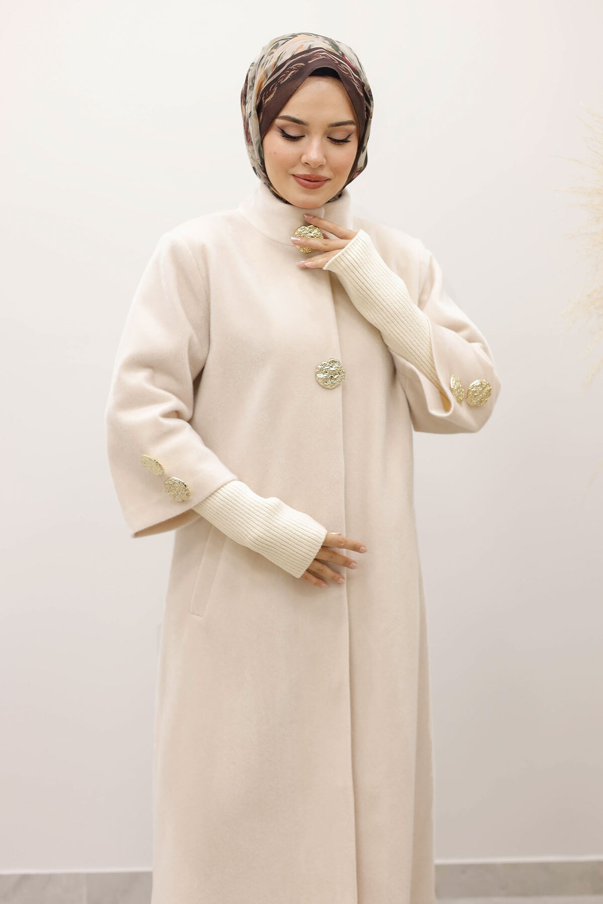 Kol Ucu Triko Detaylı Angora Fox Kaban TSD250246 Bej