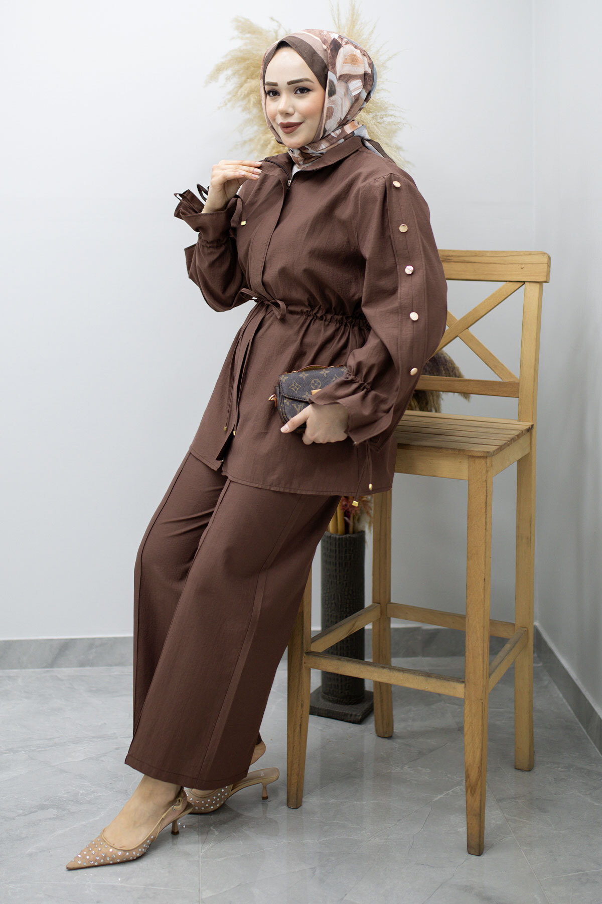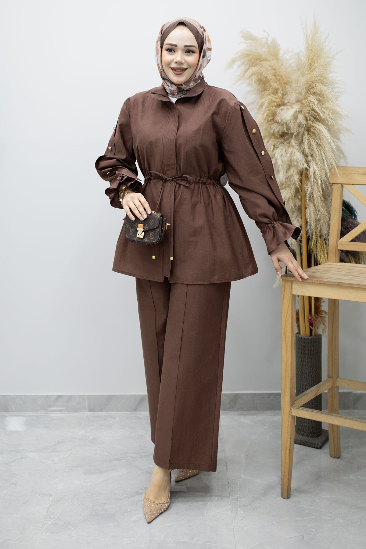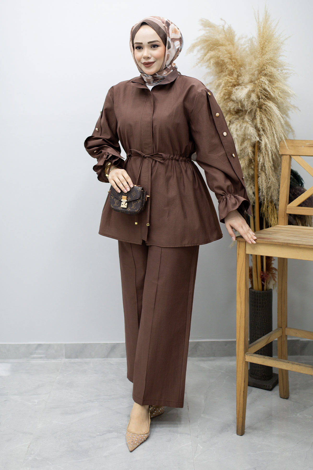 Kolu Düğme Detaylı Büzgülü İkili Takım TSD260183 Kahverengi Özellikleri