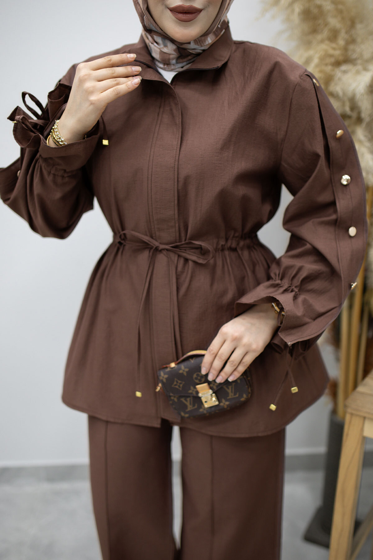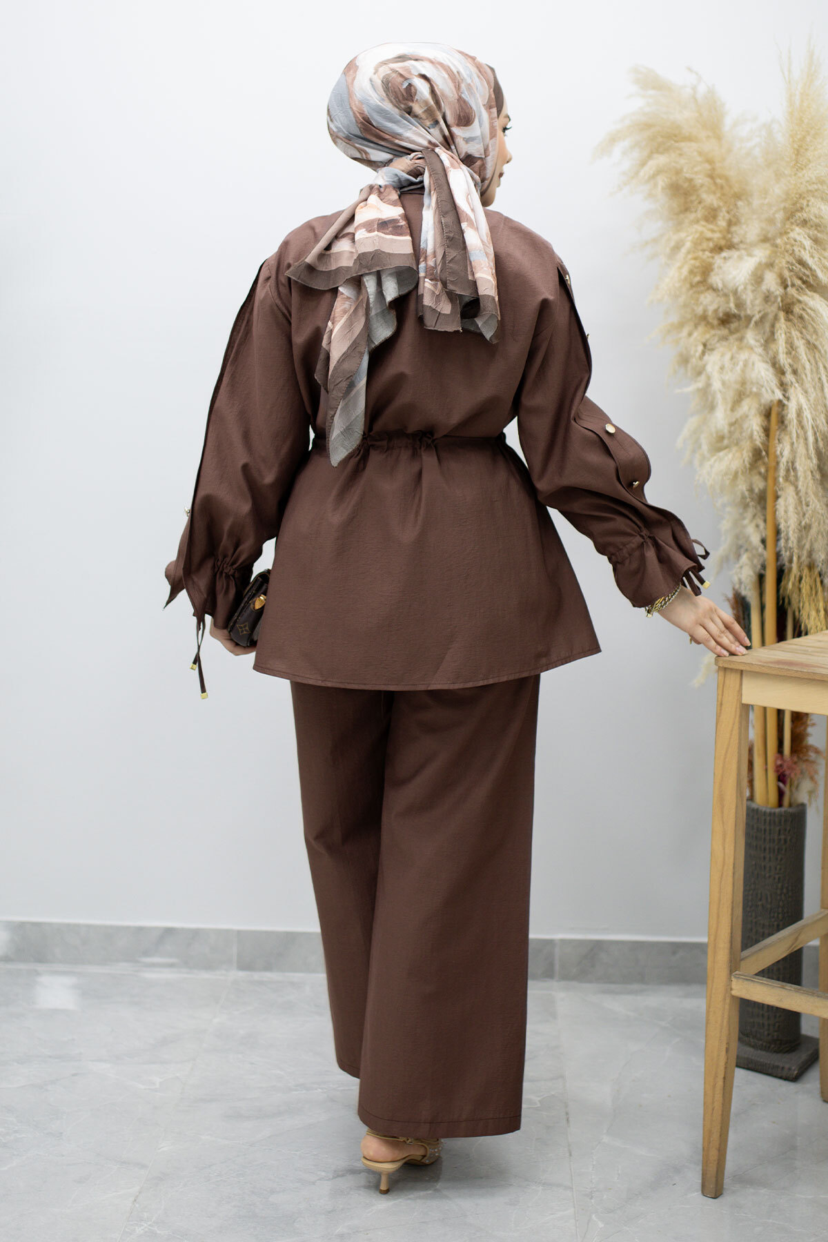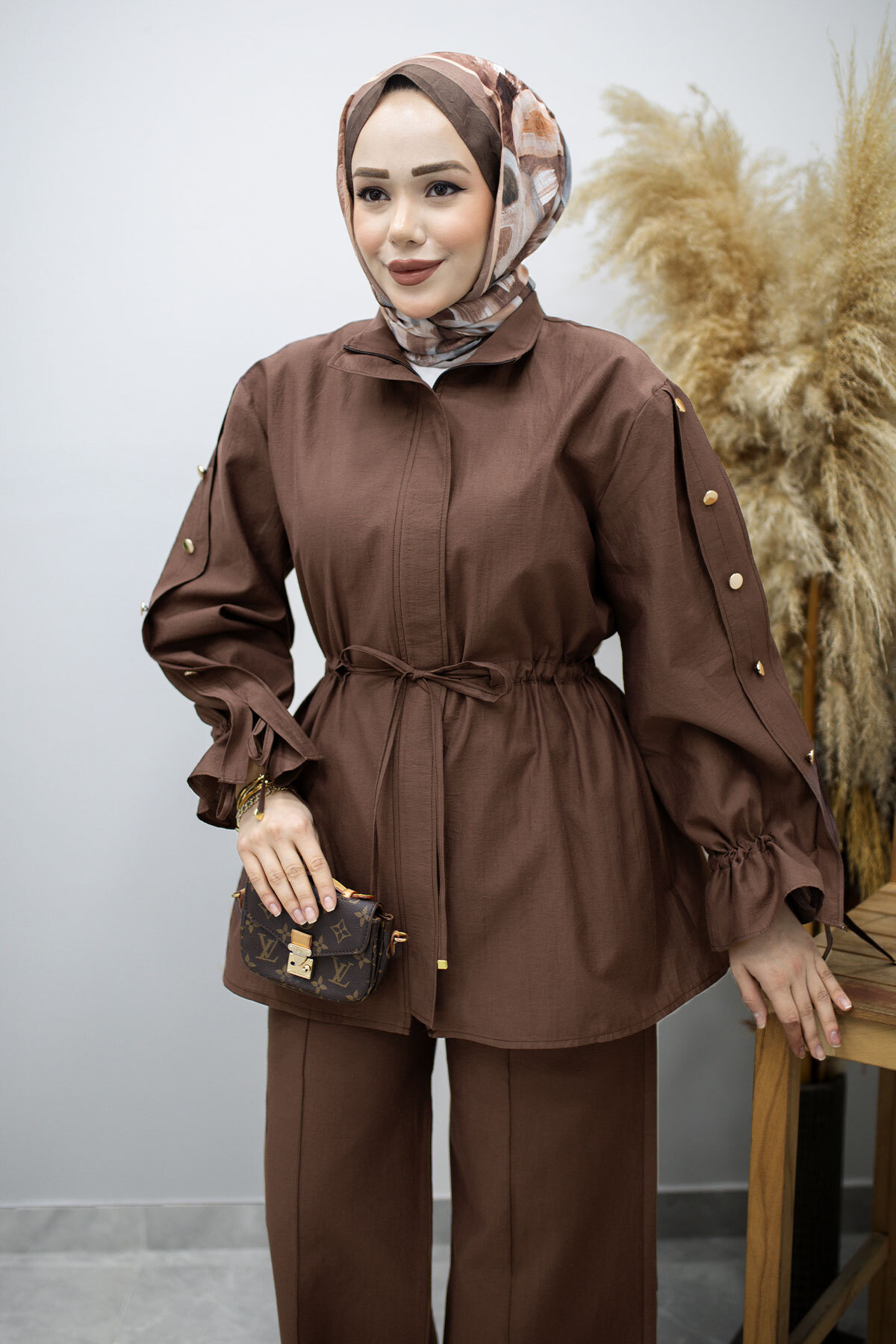 Kolu Düğme Detaylı Büzgülü İkili Takım TSD260183 Kahverengi Özellikleri