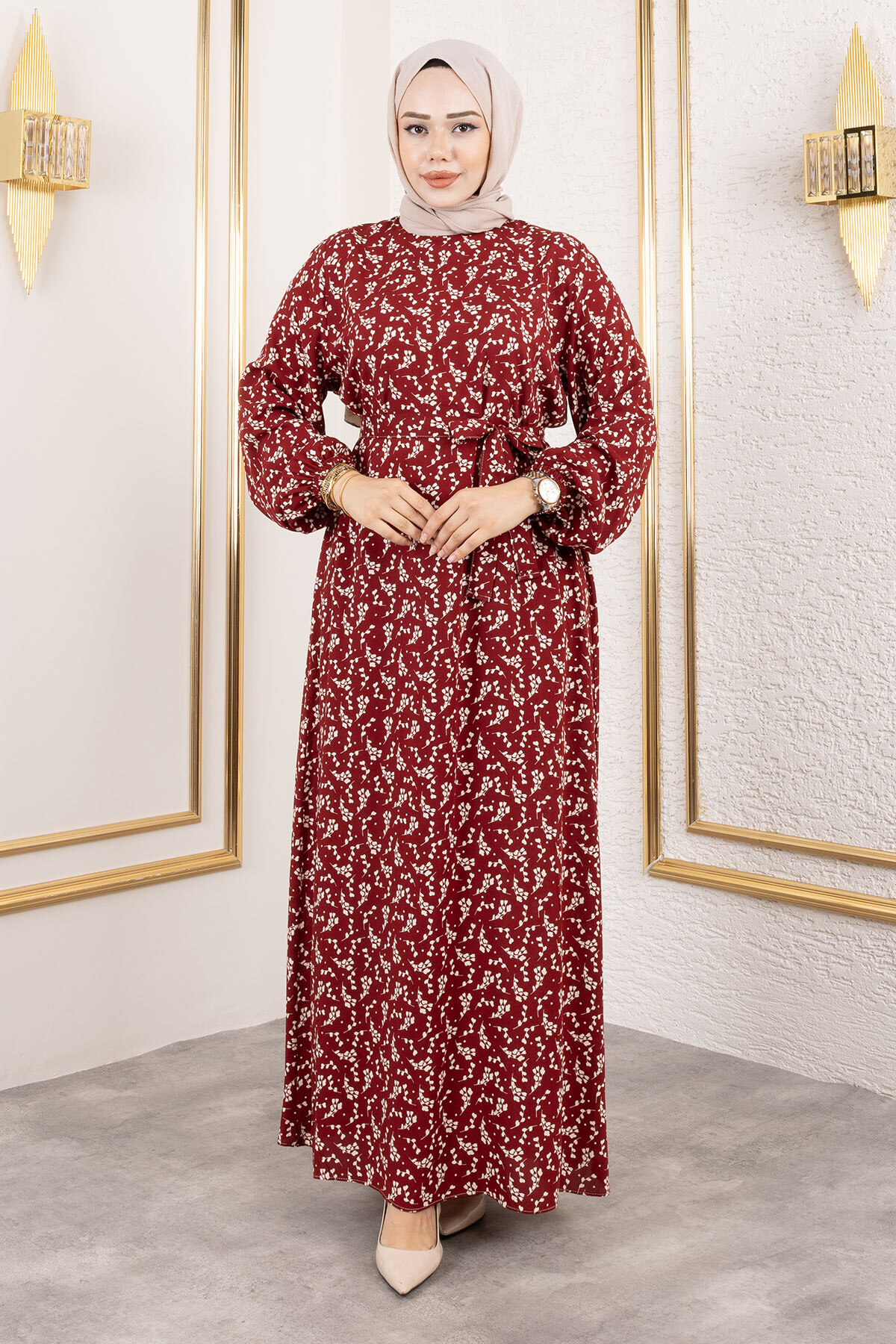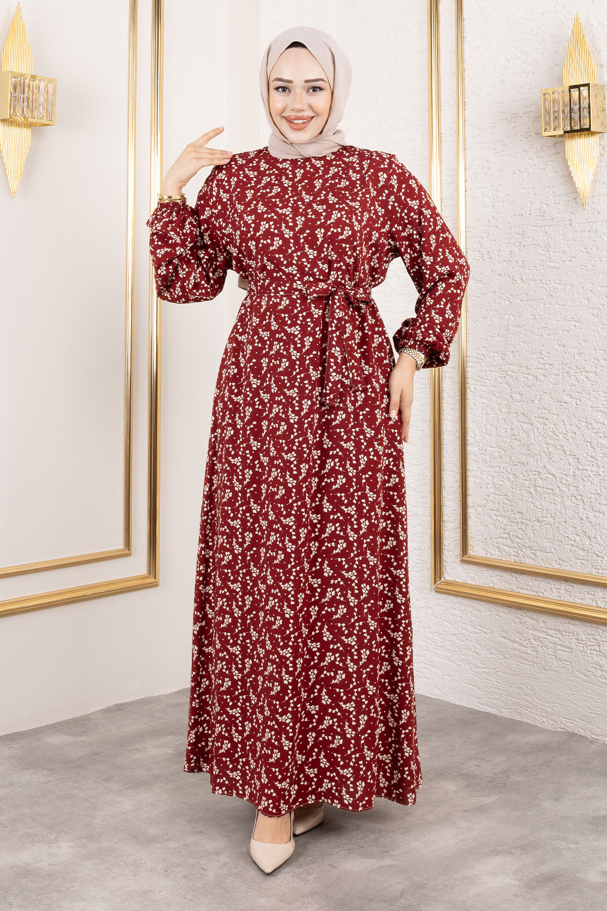 Küçük Çiçek Desenli Viskon Elbise TSD250215 Bordo